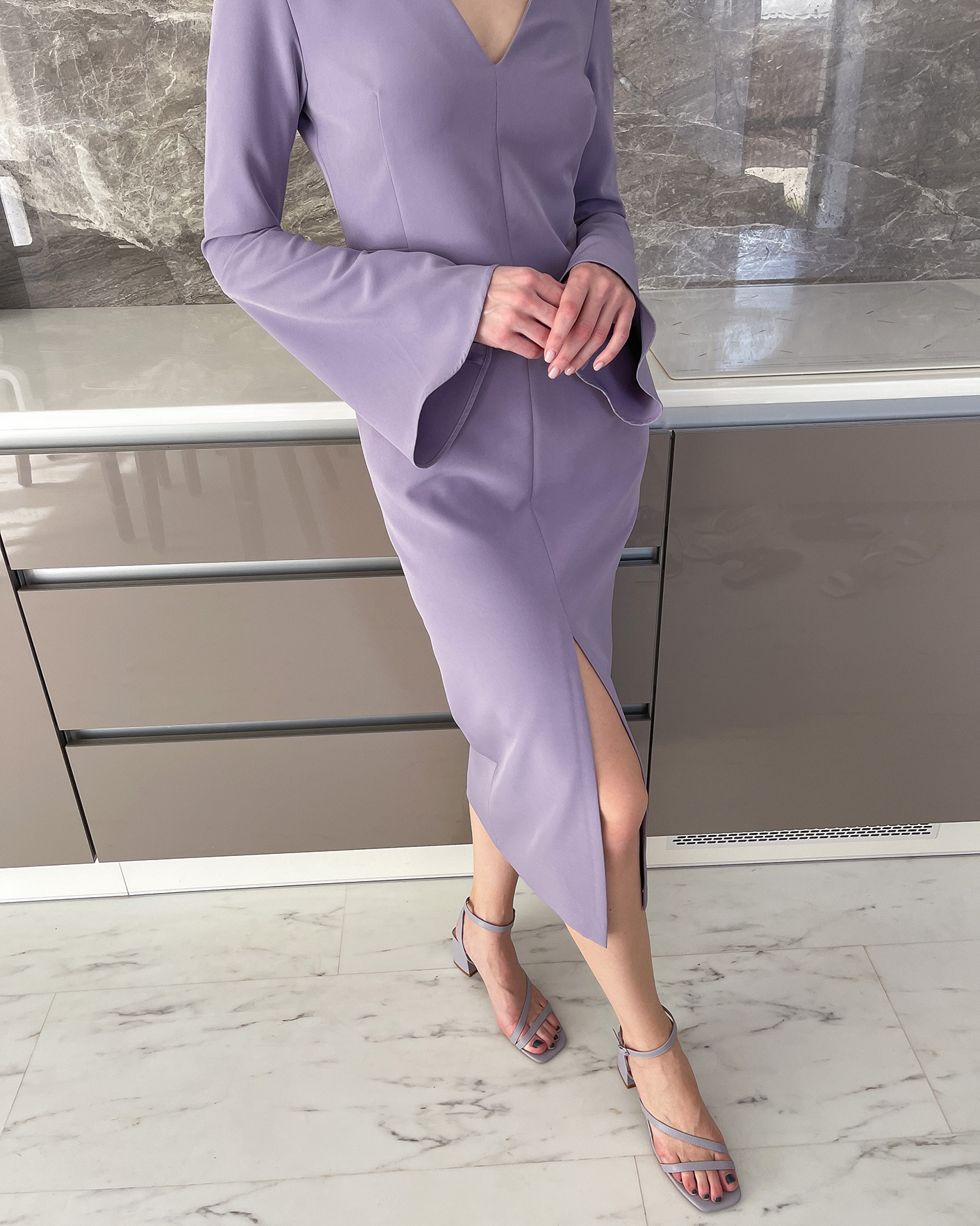 Приталенное платье-футляр Cuvee сиреневого цвета длины миди. Модель с V-образным вырезом, красиво открывающий линию ключиц. Длинные рукава с расклешением от локтя. Имеется небольшой разрез по центру, а также застежка на потайную молнию на спинке. Женственное платье-футляр станет незаменимой вещью для романтического вечера.