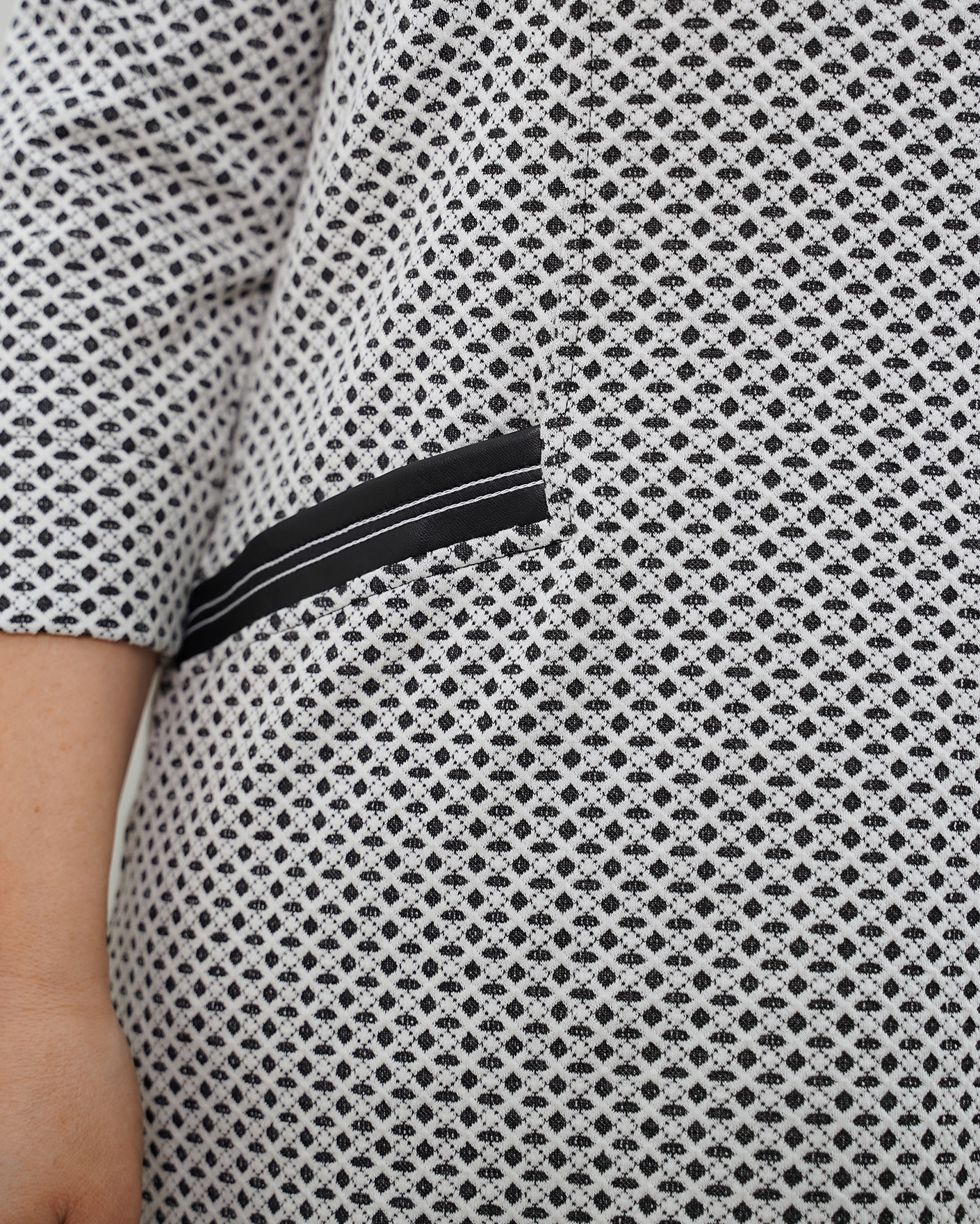 Платье-футляр Frank Walder черно-белого цвета в мелкий рисунок. Модель с  круглым вырезом и небольшим V-образным разрезом по центру. Рукава 3/4 с небольшими разрезами, имеются врезные карманы по бокам. Платье-футляр отлично впишется в ваш гардероб.