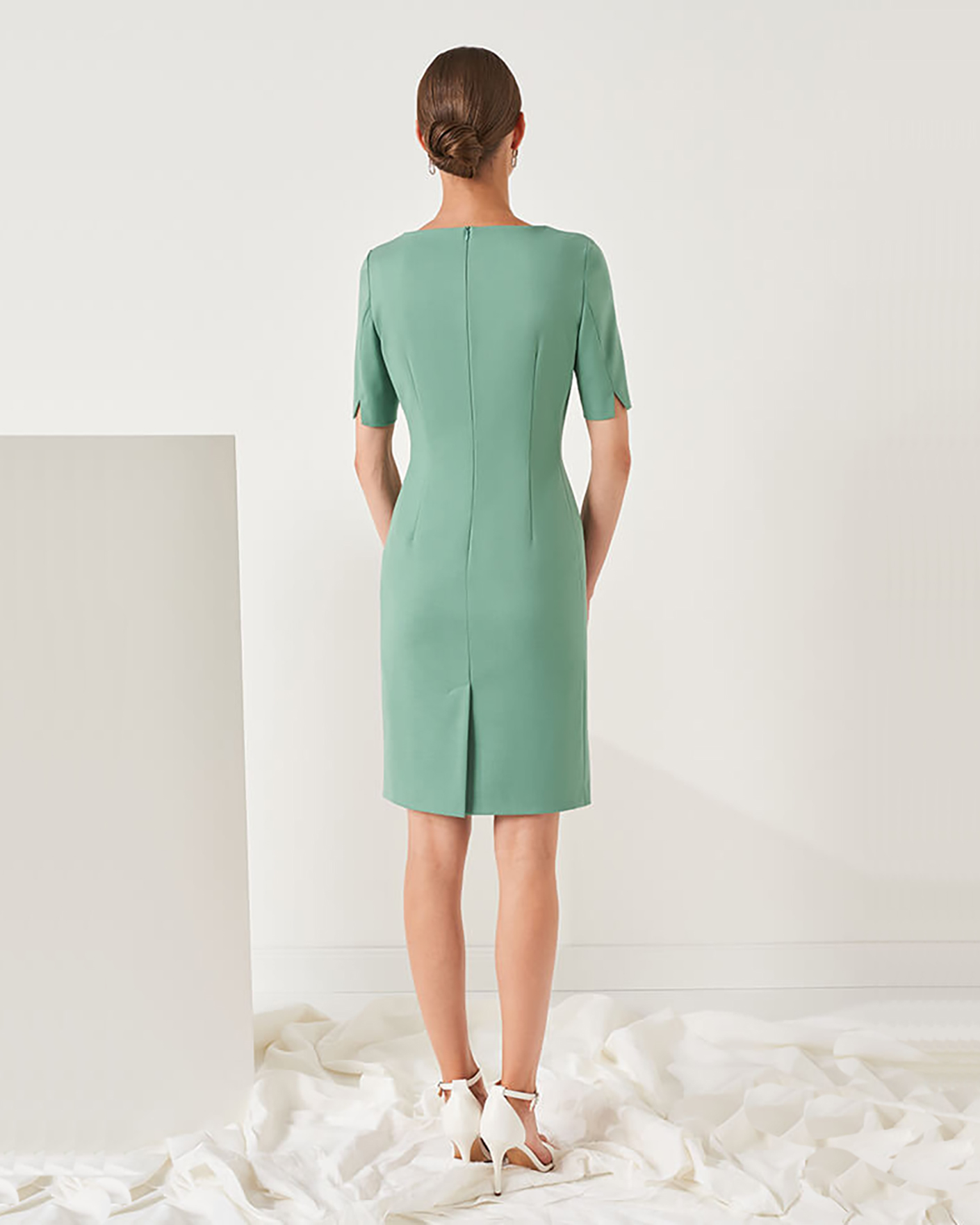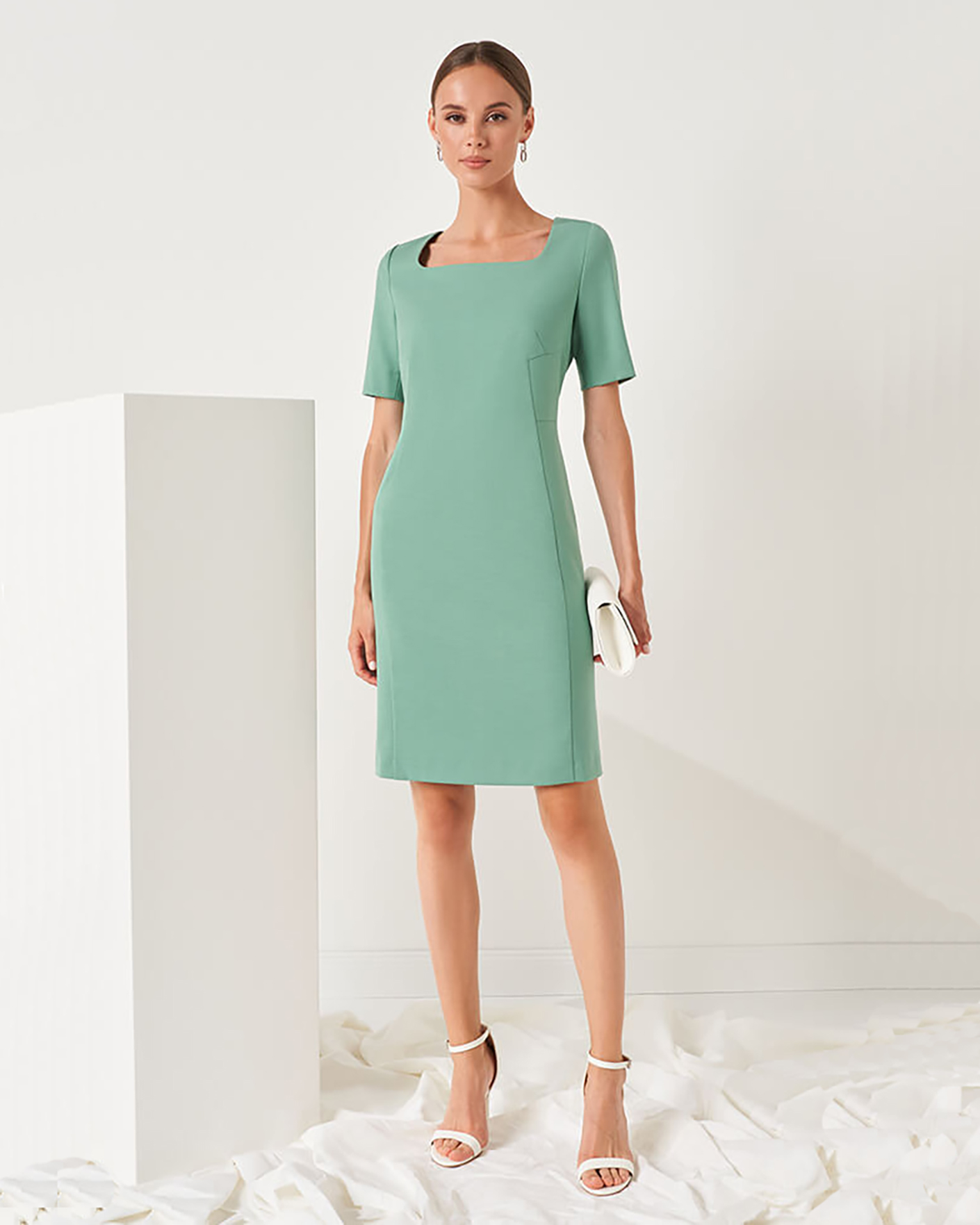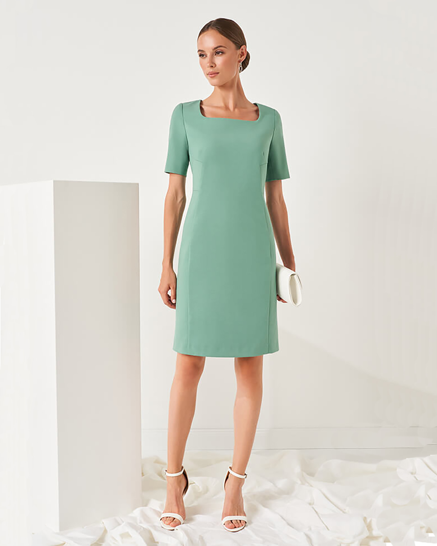Полуприталенное платье-футляр Nelva светло-зеленого цвета. Модель с кавадратным вырезом, короткие рукава с небольшими разрезами, застежка на потайную молню сзади. Женственное платье-футляр отлично впишется в ваш гардероб.