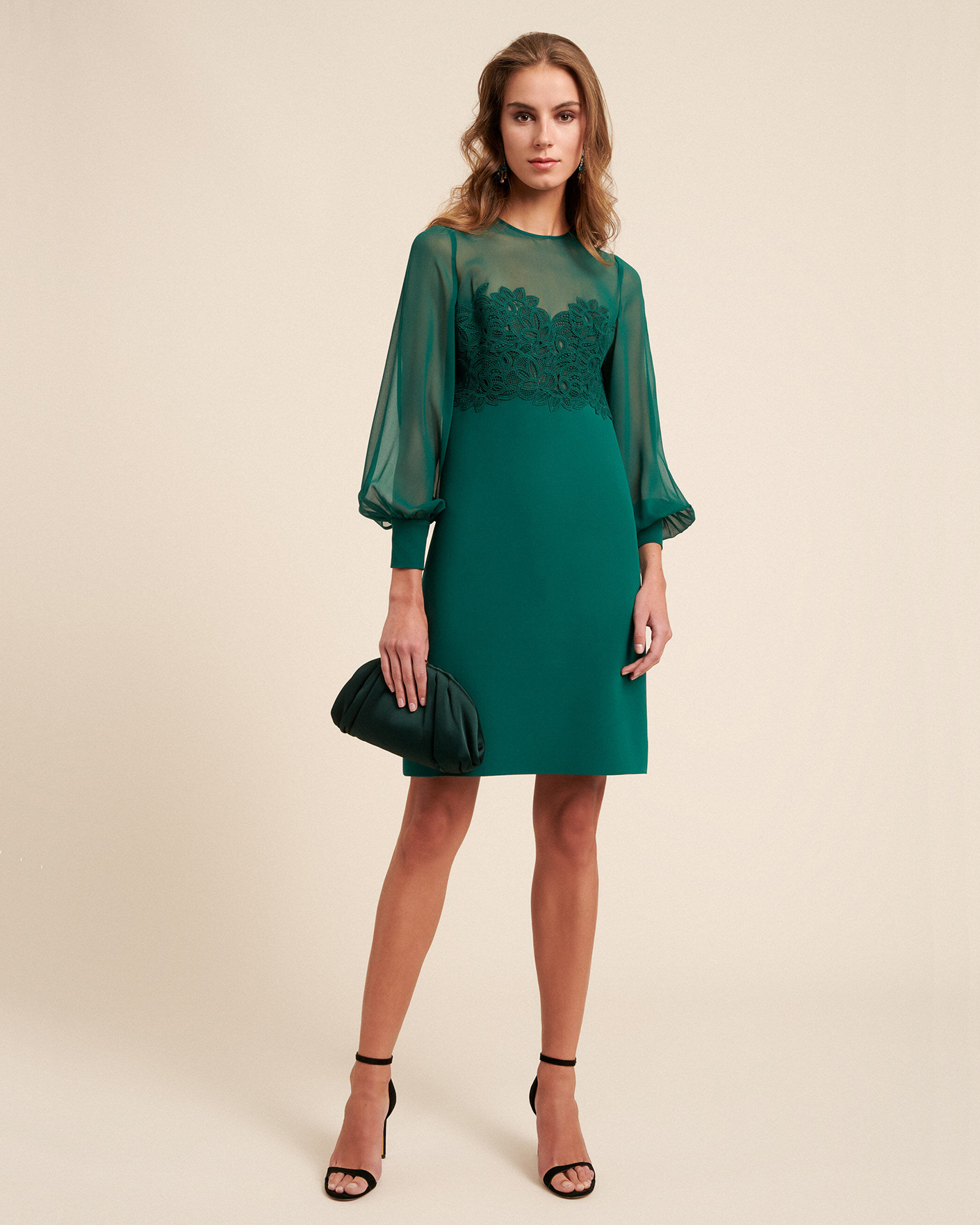Женственное платье-футляр Luisa Spagnoli изумрудного цвета. Модель с круглым вырезом с полупрозрачный шелковым верхом, декорирвоанным кружевом в тон, а также свободные рукава с широкими манжетами на пуговицы со стразами. Платье-футляр идеально для праздничного вечера.