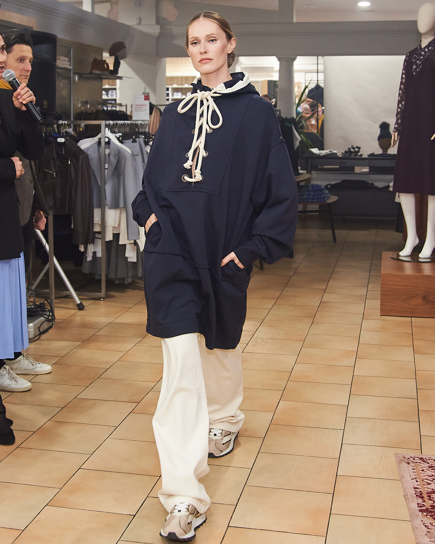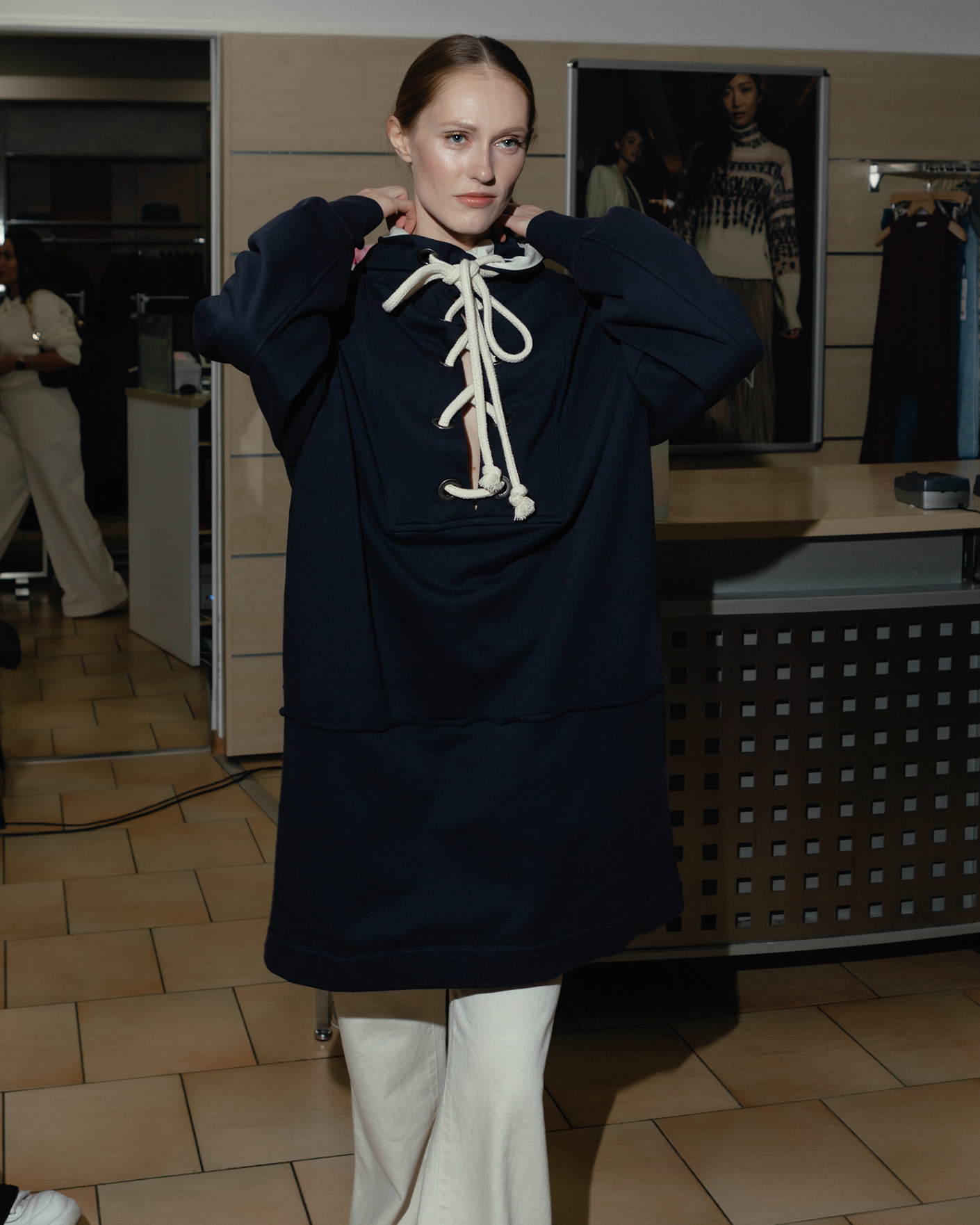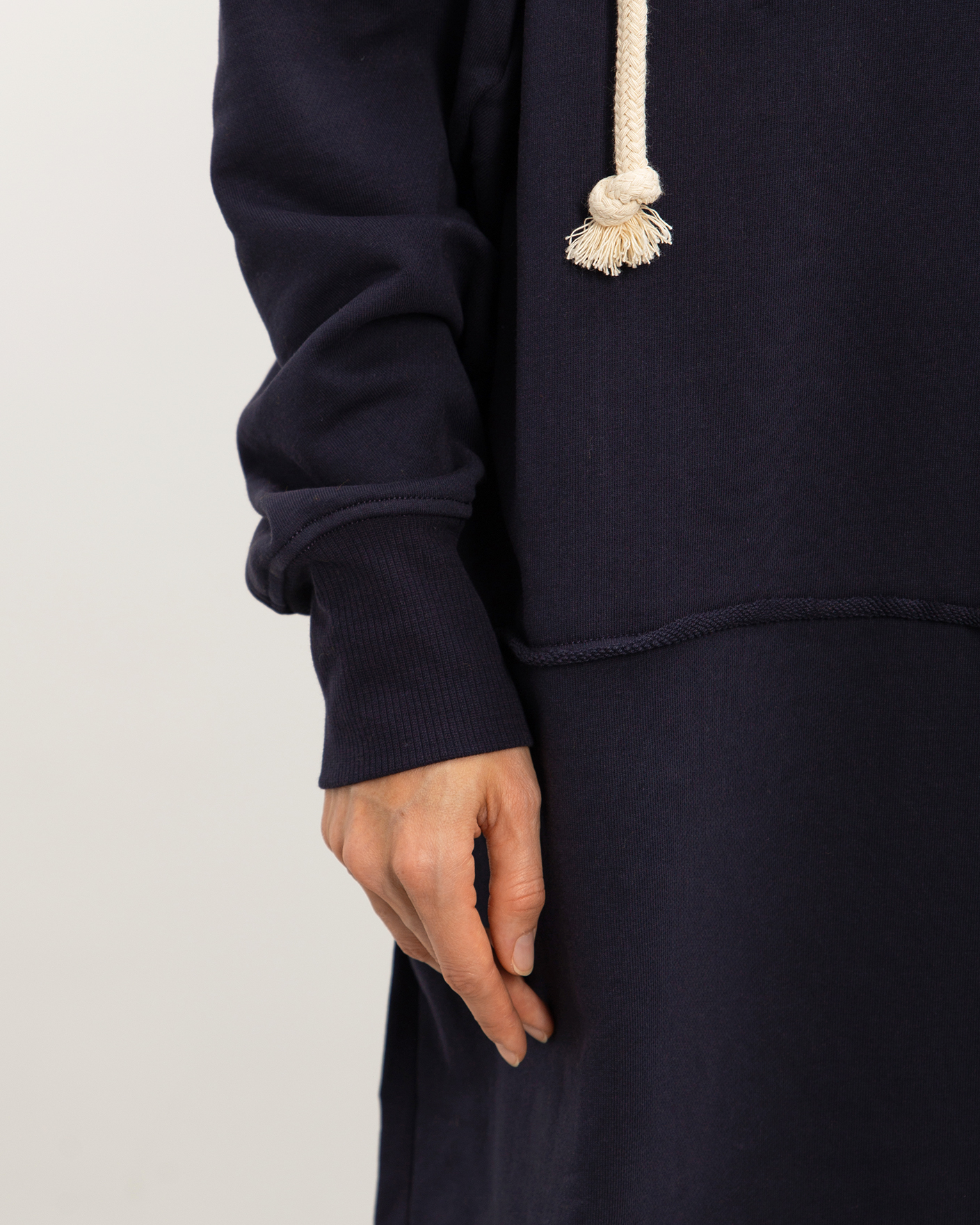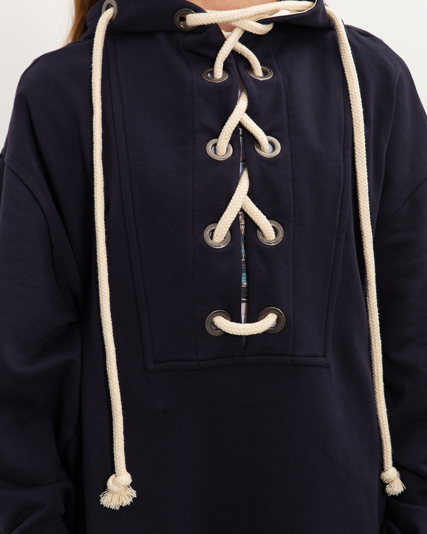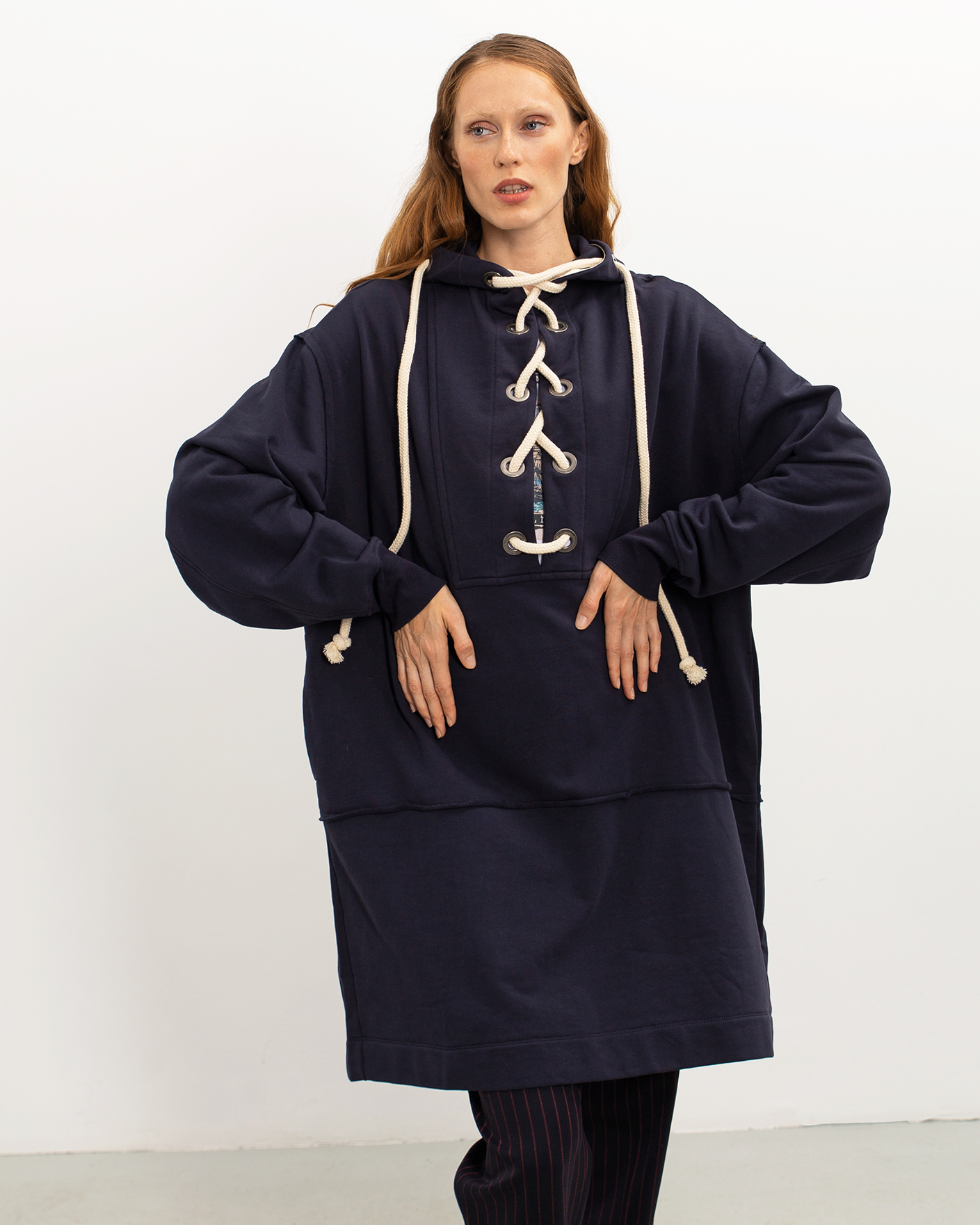 Платье-худи Sportmax темно-синего цвета выполнен из 100% хлопка. Удлиненная модель с капюшоном, глубокий разрез по центру на шнуровке из толстого жгута, что делает образ более современным. Спущенная линия плеча с широкими рукавами с манжетами на резинке. Платье-худи можно сочетать с леггинсами, джинсами и брюками.