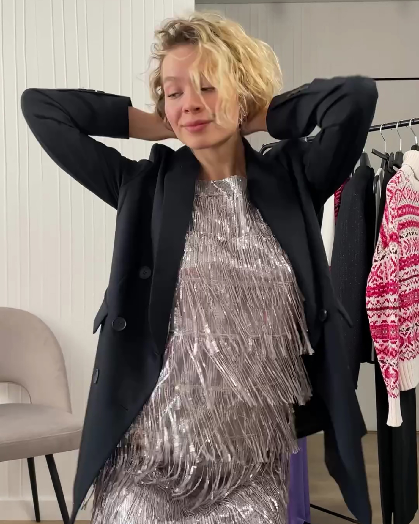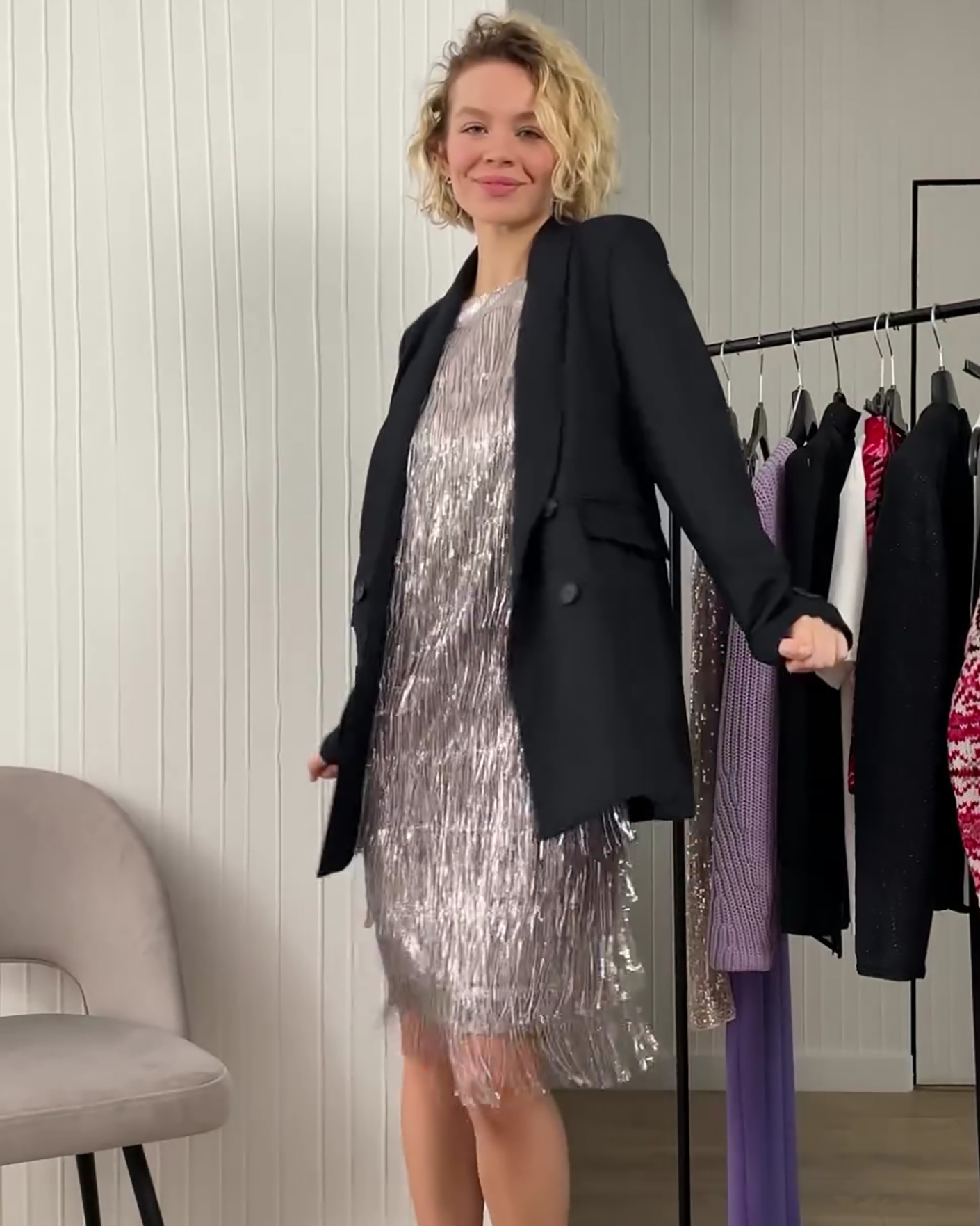 Платье-кокон Nelva серебристого цвета в пайетках. Модель с круглым вырезом и без рукавов. Платье-кокон станет идеальным вариантом для праздничного вечера.