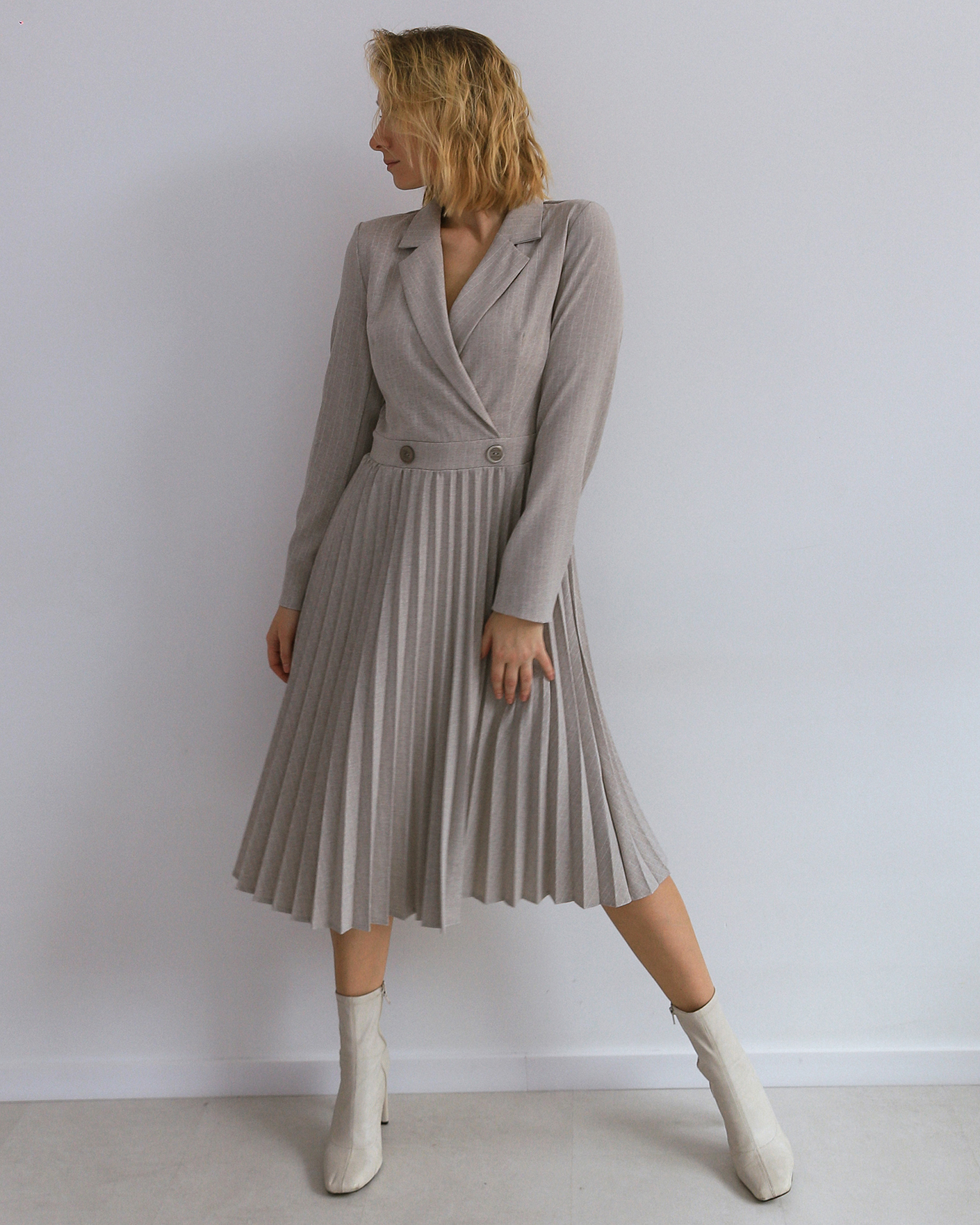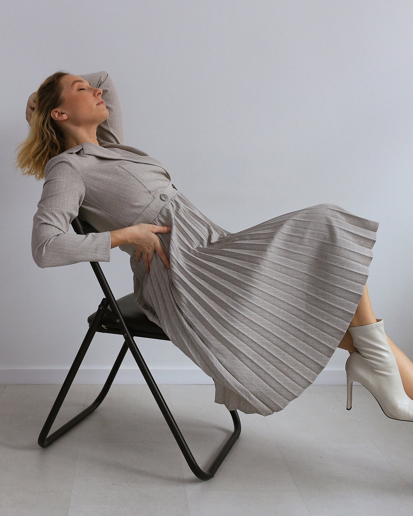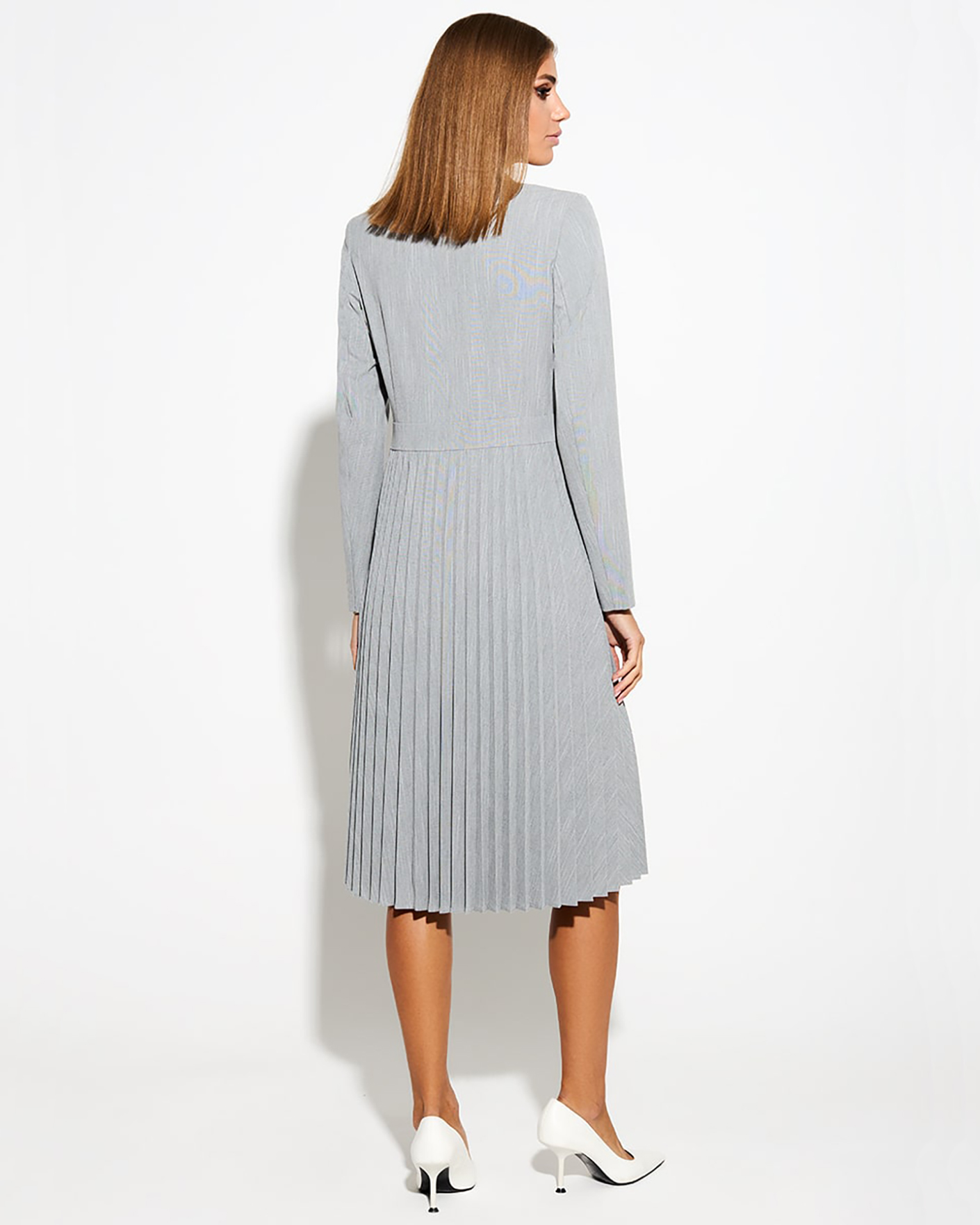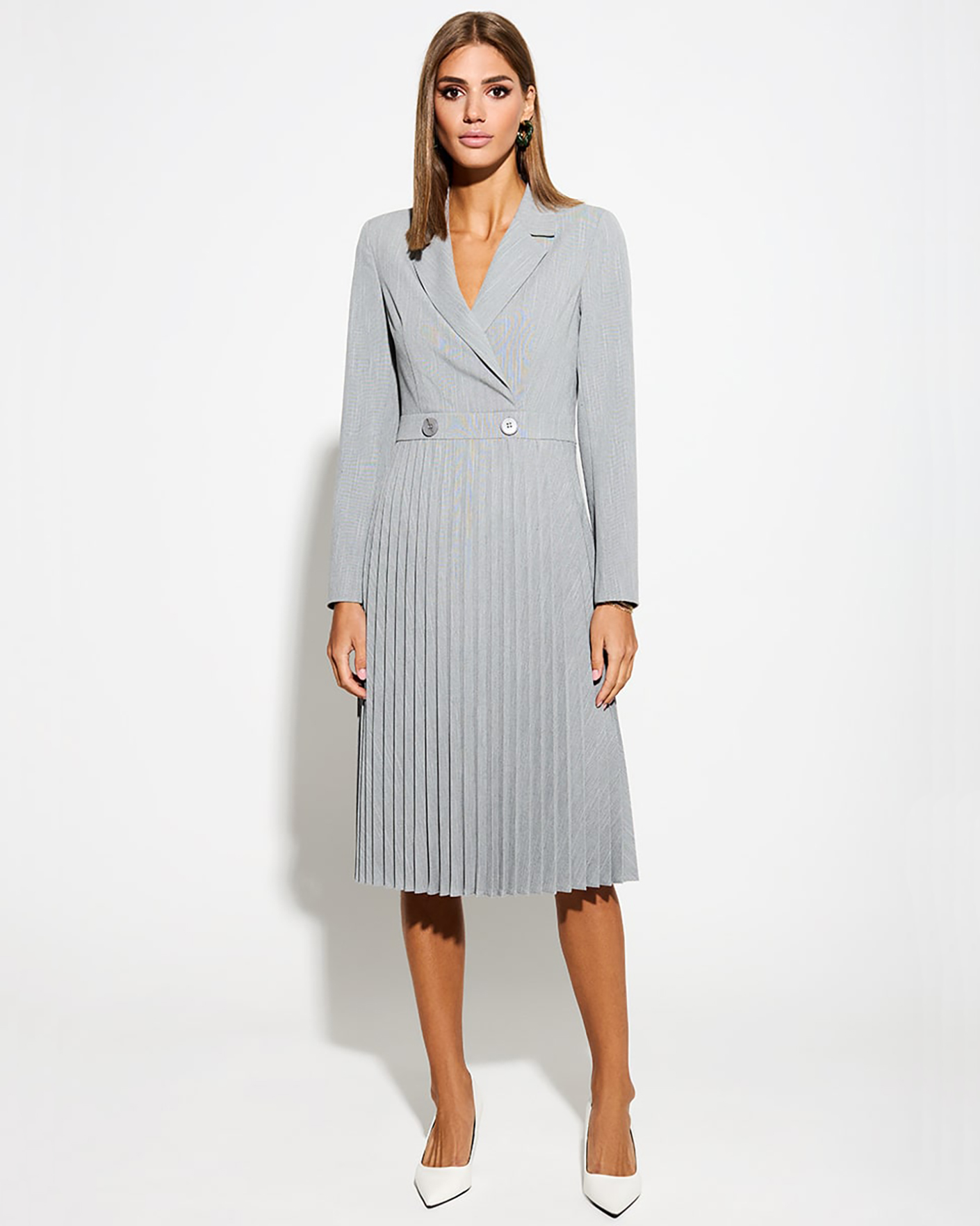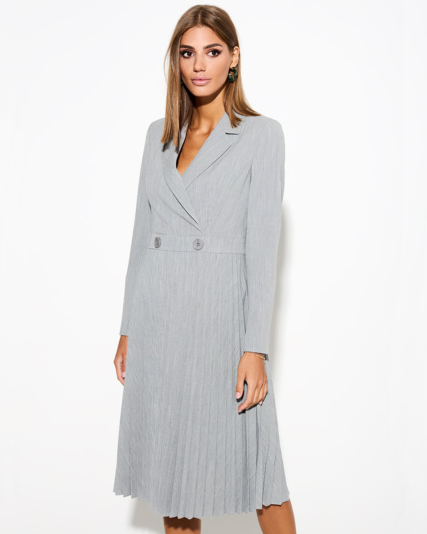 Приталенное платье Devita серого цвета в мелкий строчный рисунок. Модель с V-образным вырезом с лацканами, выделенной линией талии с двумя пуговицами, а также юбка-плиссе. Платье отлично впишется в ваш гардероб.