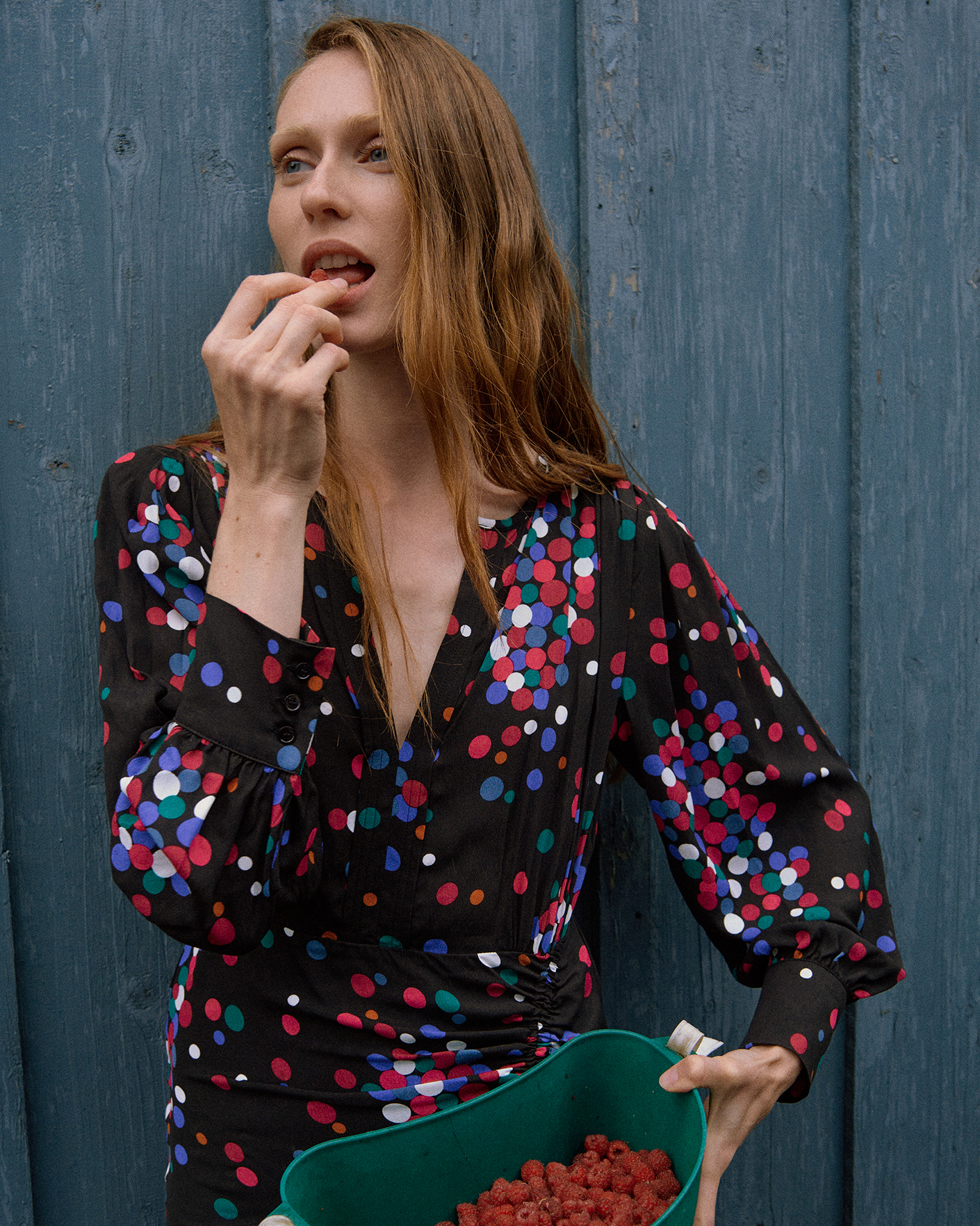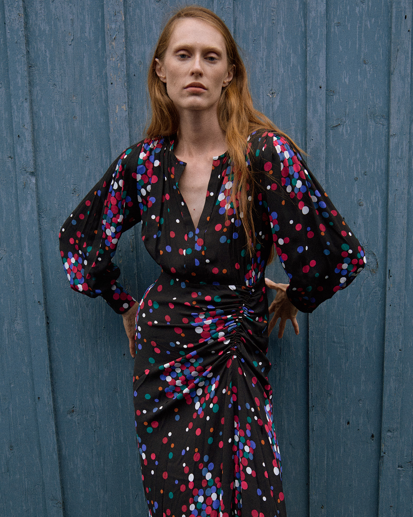 Приталенное платье Marella черного цвета в разноцветный рисунок-горох. Модель с круглым воротом с V-образным вырезом, а также драбировкой сбоку на талии. Длинные рукава с широкими манжетами на пуговиуах. Стильное платье идеально для праздничного вечера.