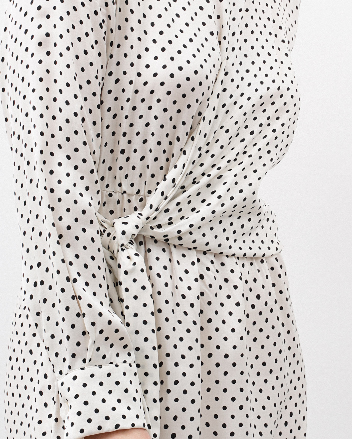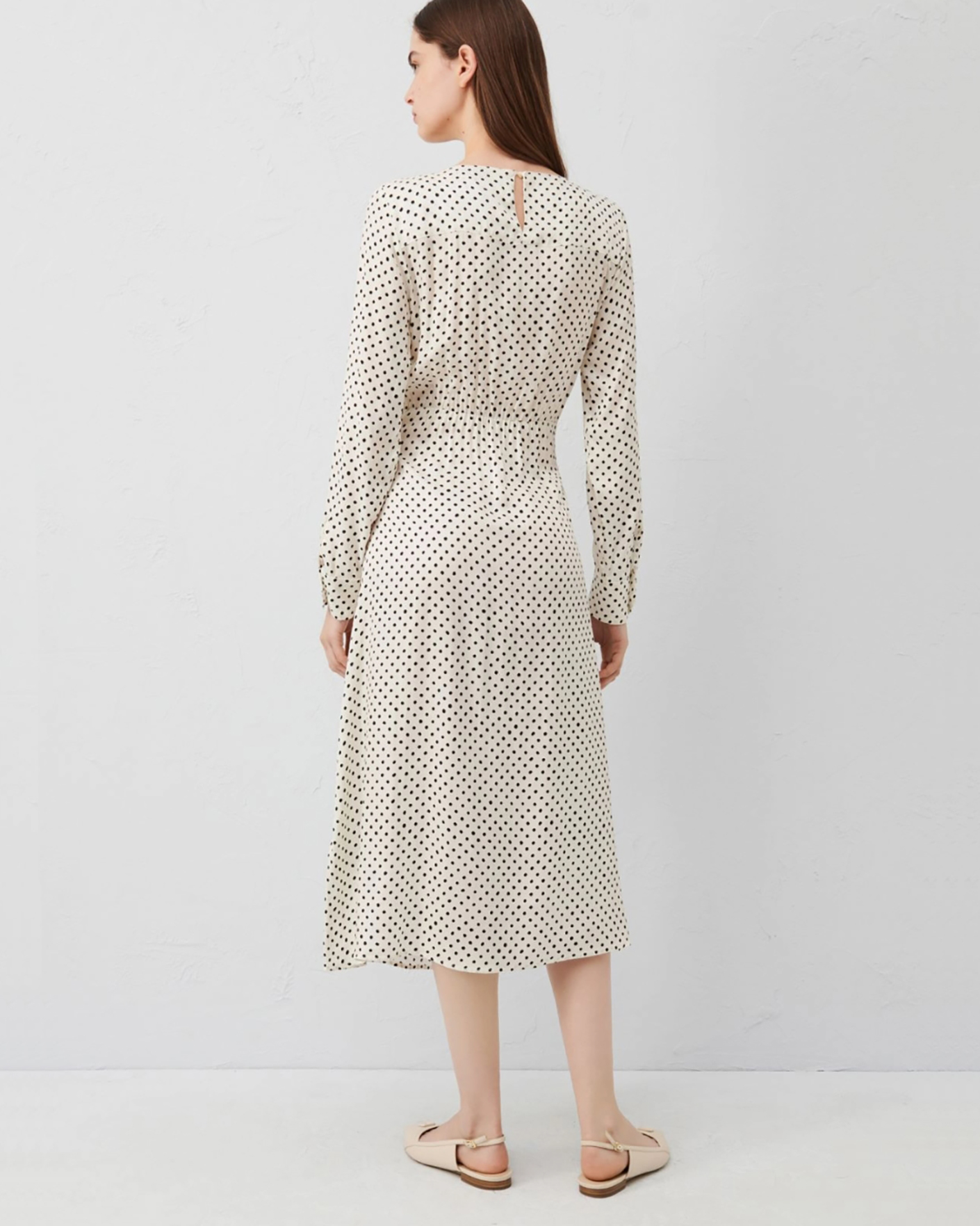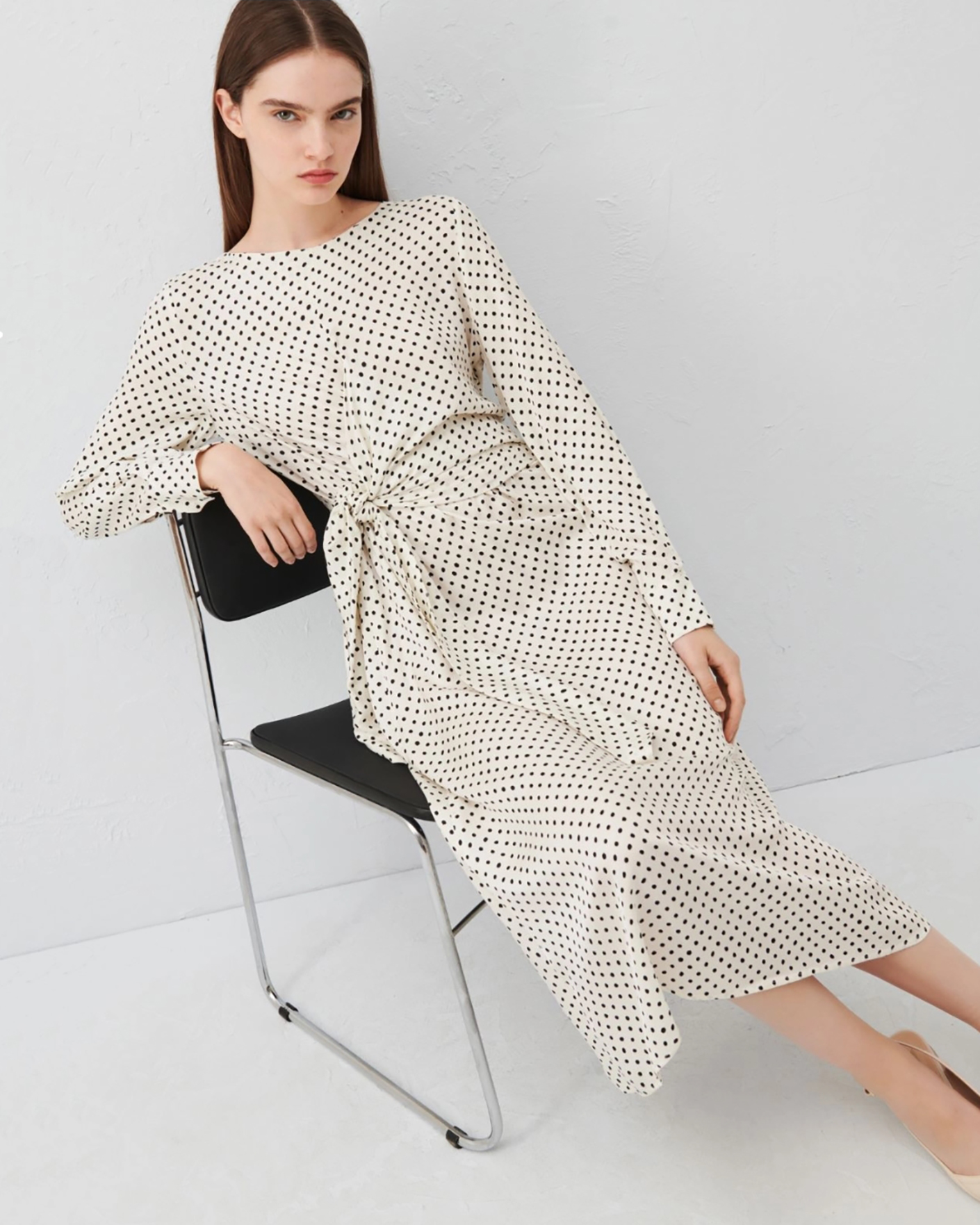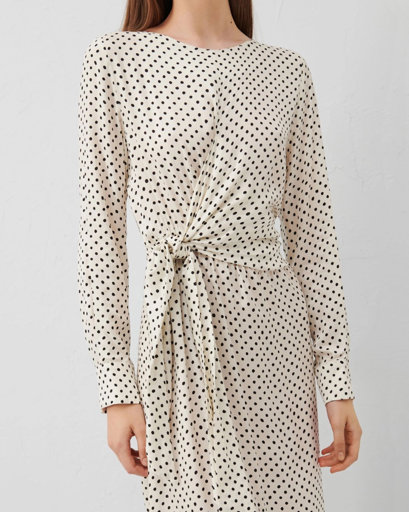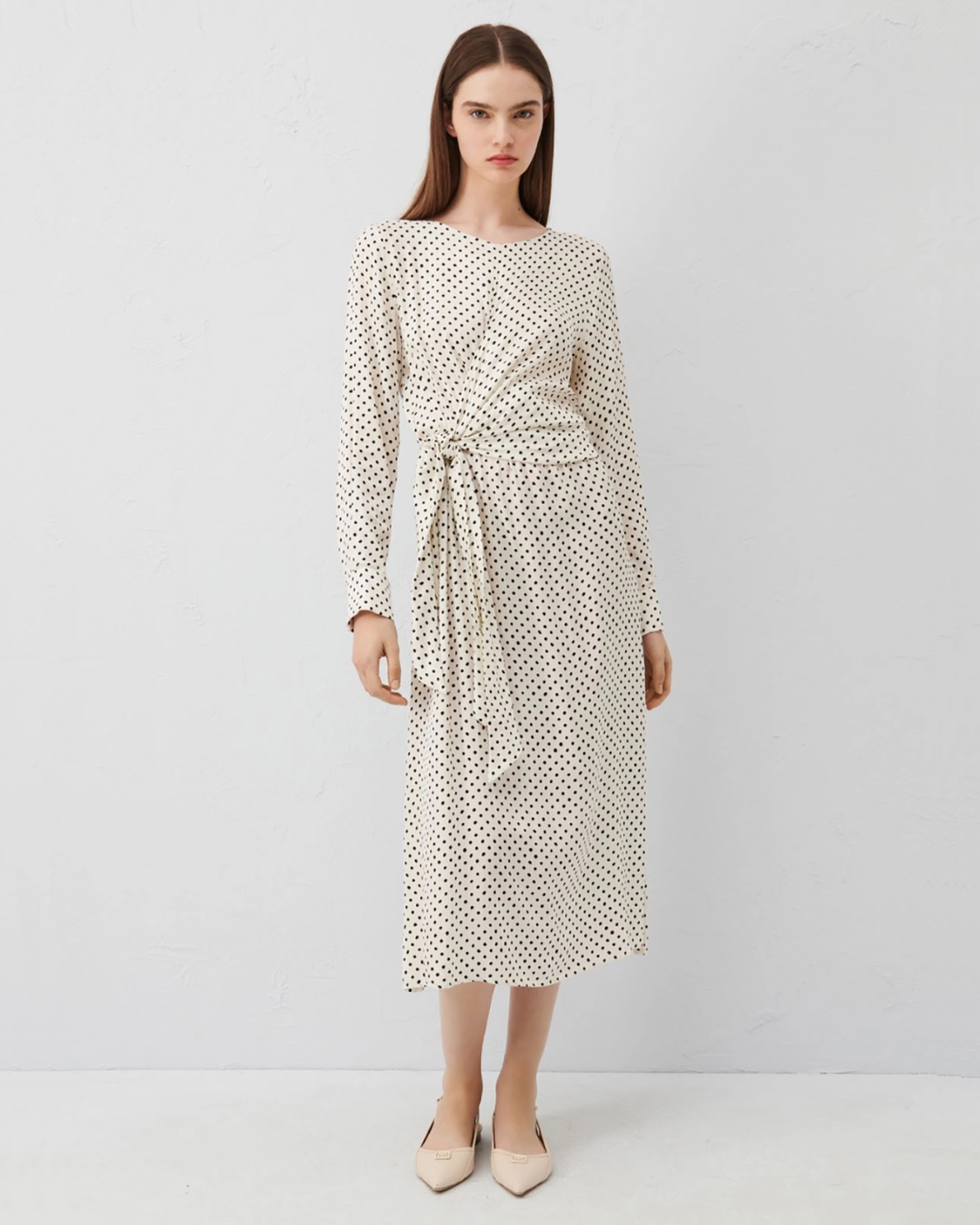 Стильное платье Marella черно-белого цвета в мелкий принт горох. Модель с круглым вырезом, длинными рукавами и ассиметричной драпировкой с завязками сбоку. Длина миди. Женственное платье станет незаменимой вещью на каждый день.