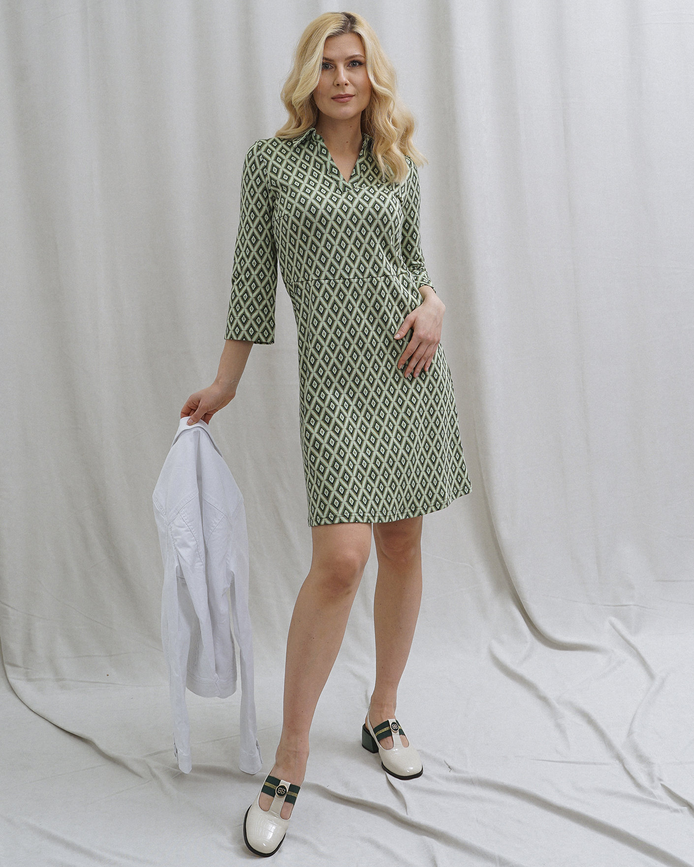 Яркое платье More&More зеленого цвета в геометрический текстурный рисунок. Модель с отложным воротником и V-образным вырезом. Рукава 3/4 с небольшими разрезами, расклешенная юбка, врезные карманы по бокам. Стильное платье станет фаворитом вашего гардероба.