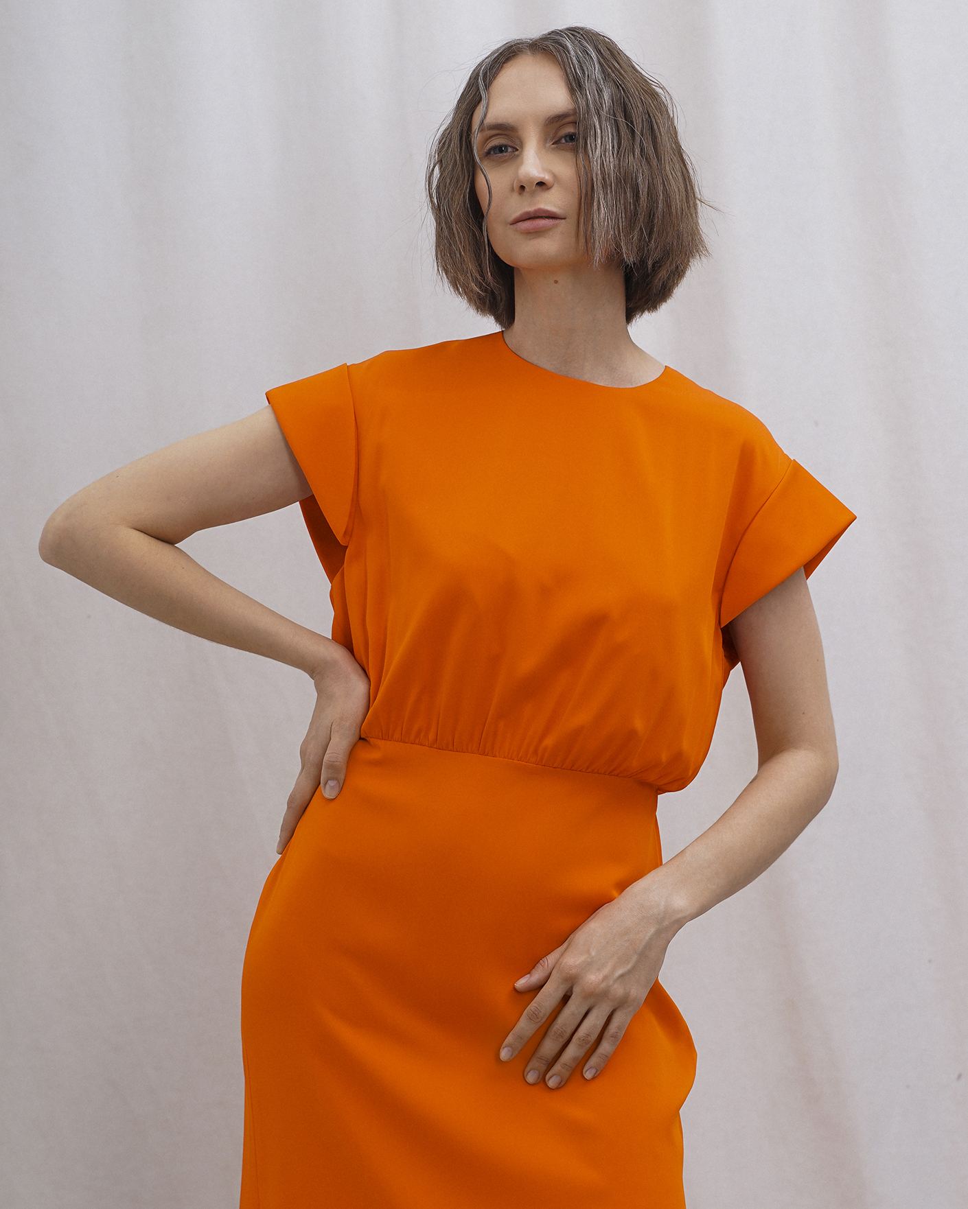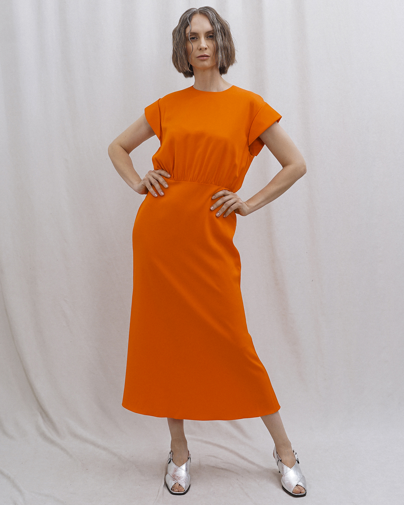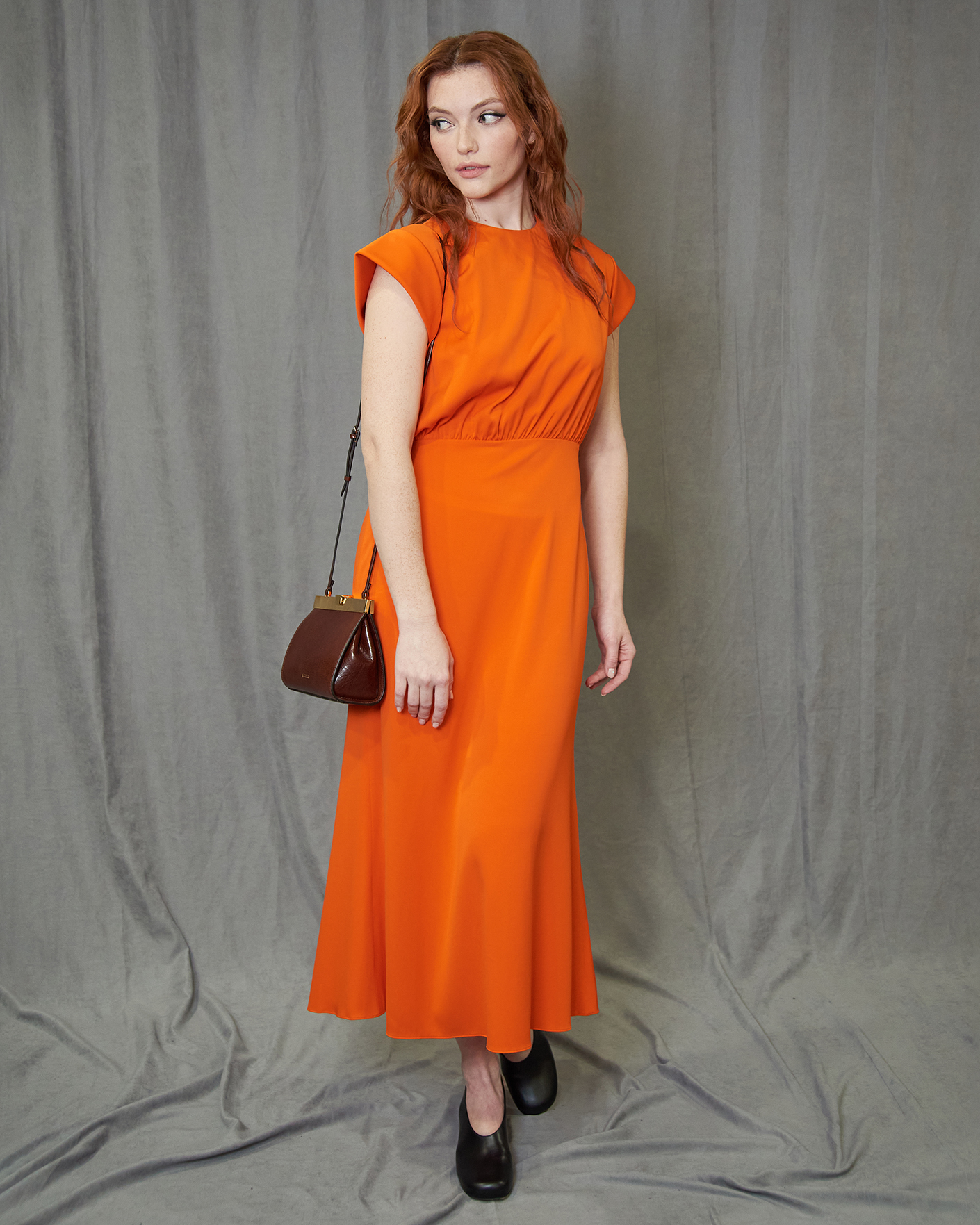 Приталенное платье Sportmax оранжевого цвета длины макси. Модель с круглым вырезом, спущенной линией плеча с широкими отворотами. Линия талии с небольшой аккуратной сборкой, а юбка слегка расклешена к низу. Яркое платье станет фаворитом вашего гардероба.