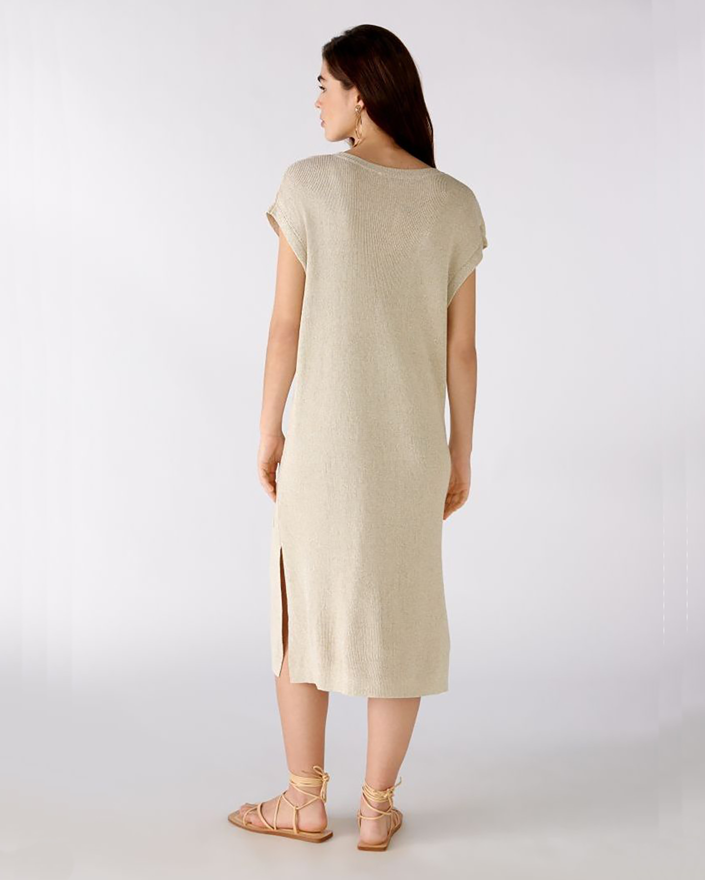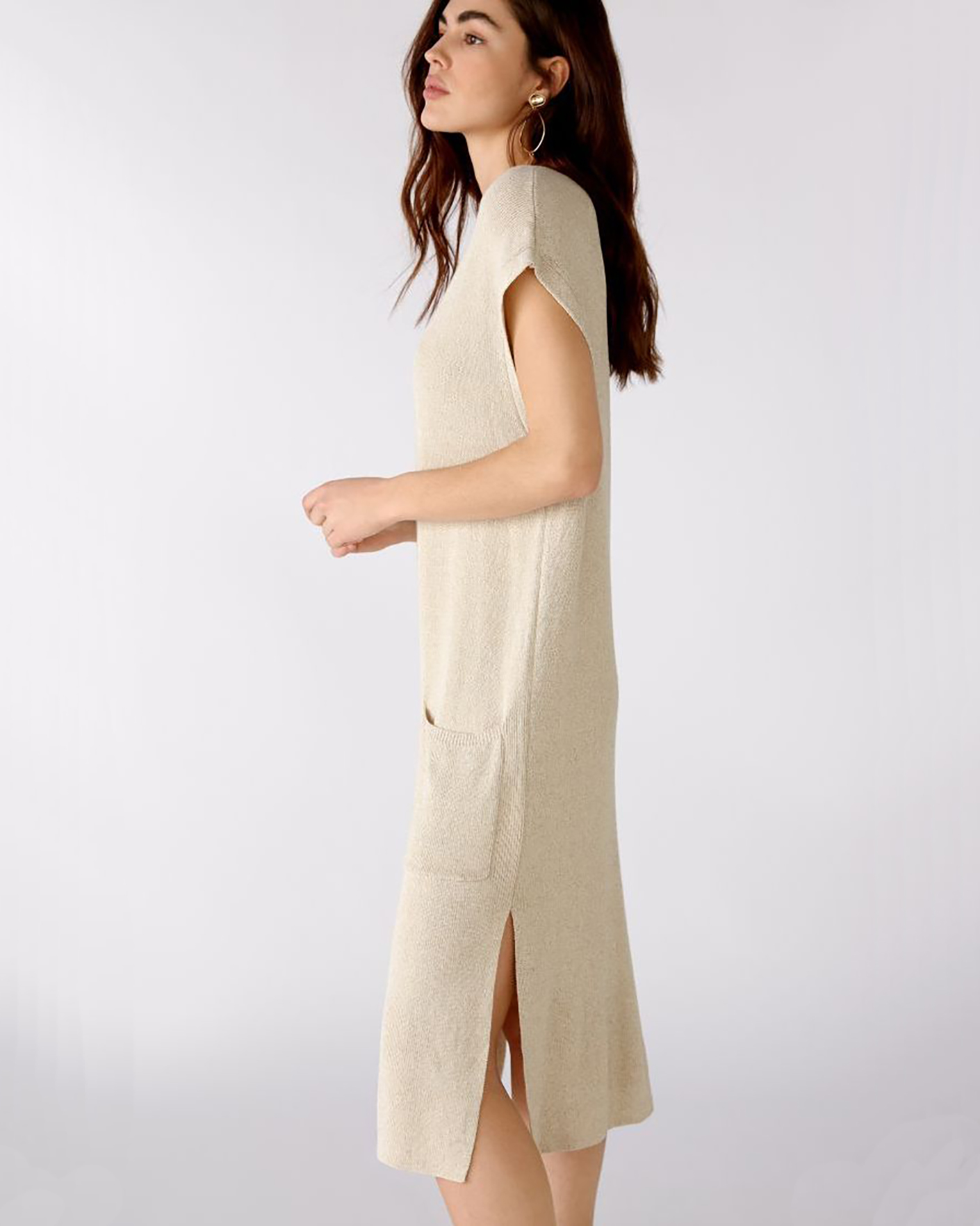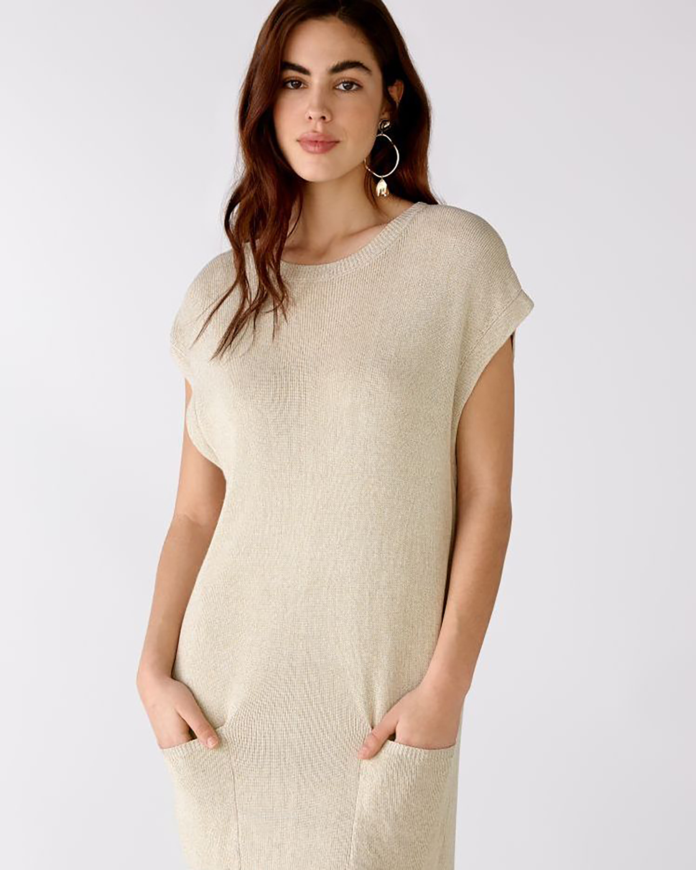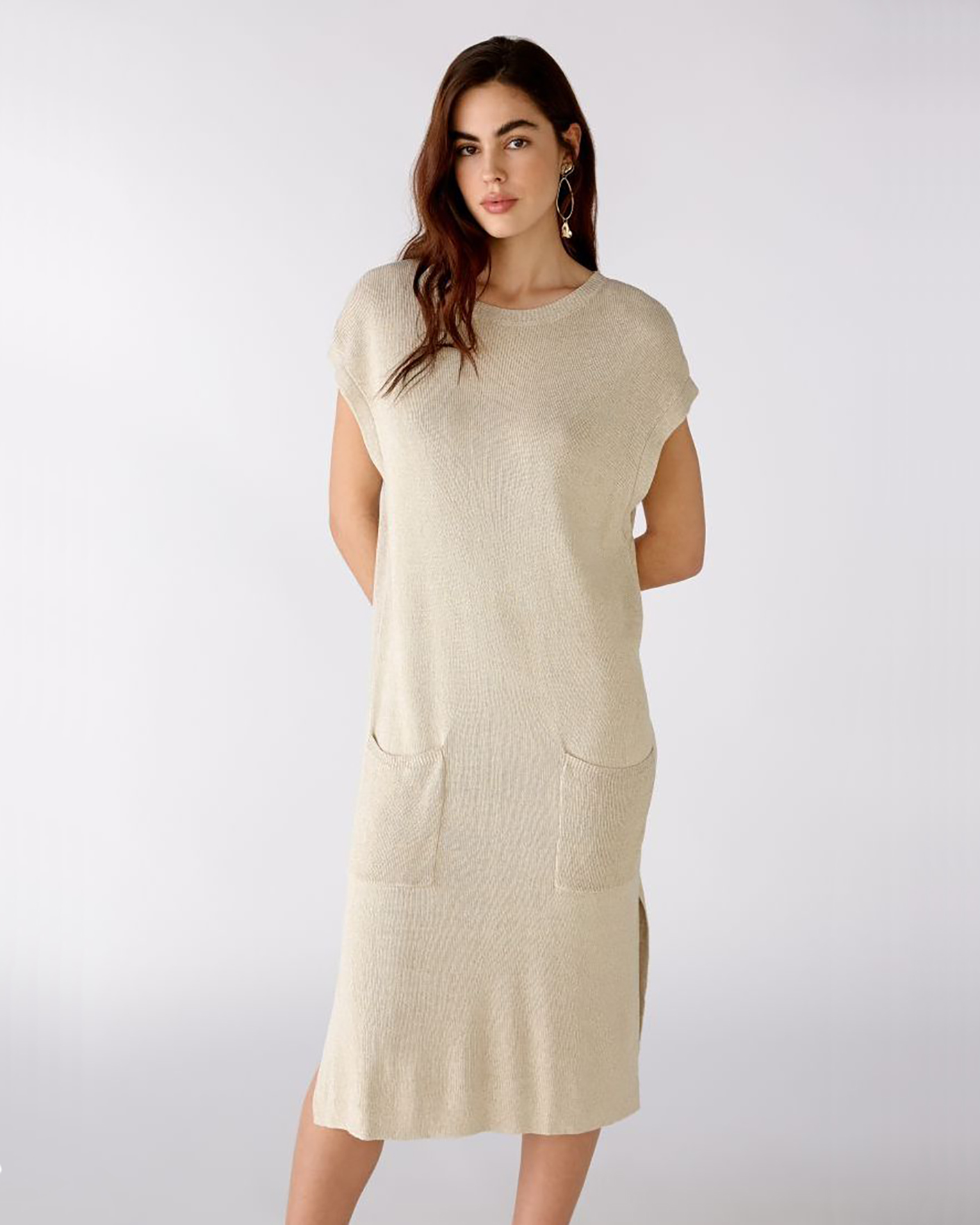 Свободное платье OUI бежевого цвета в строчный рисунок. Модель без рукавов, круглый вырез на тонкой ребристой резинке. Имеются накладные карманы по бокам. Платье можно сочетать с рубашкой, блузой, тонкой водолазкой, леггинсами.