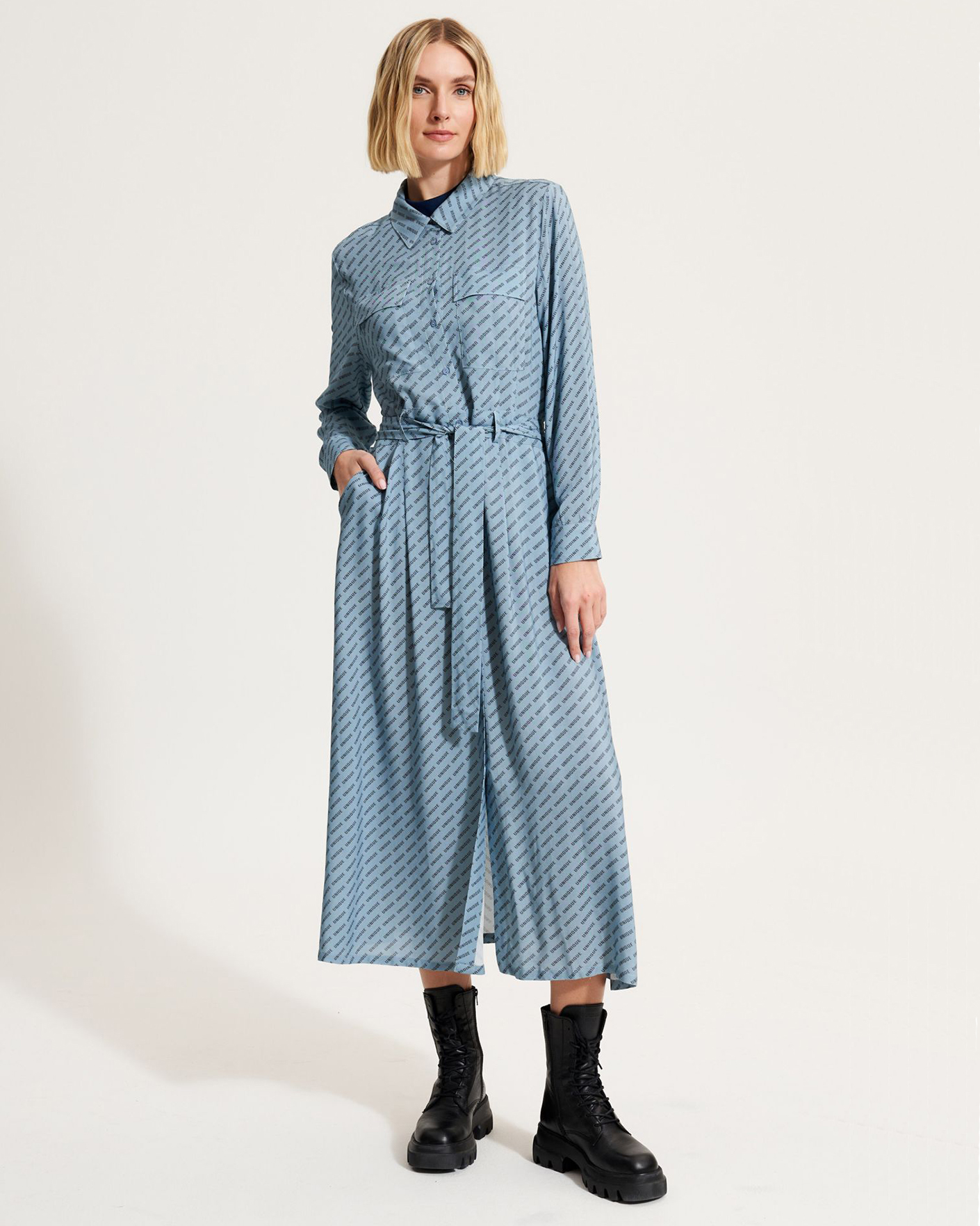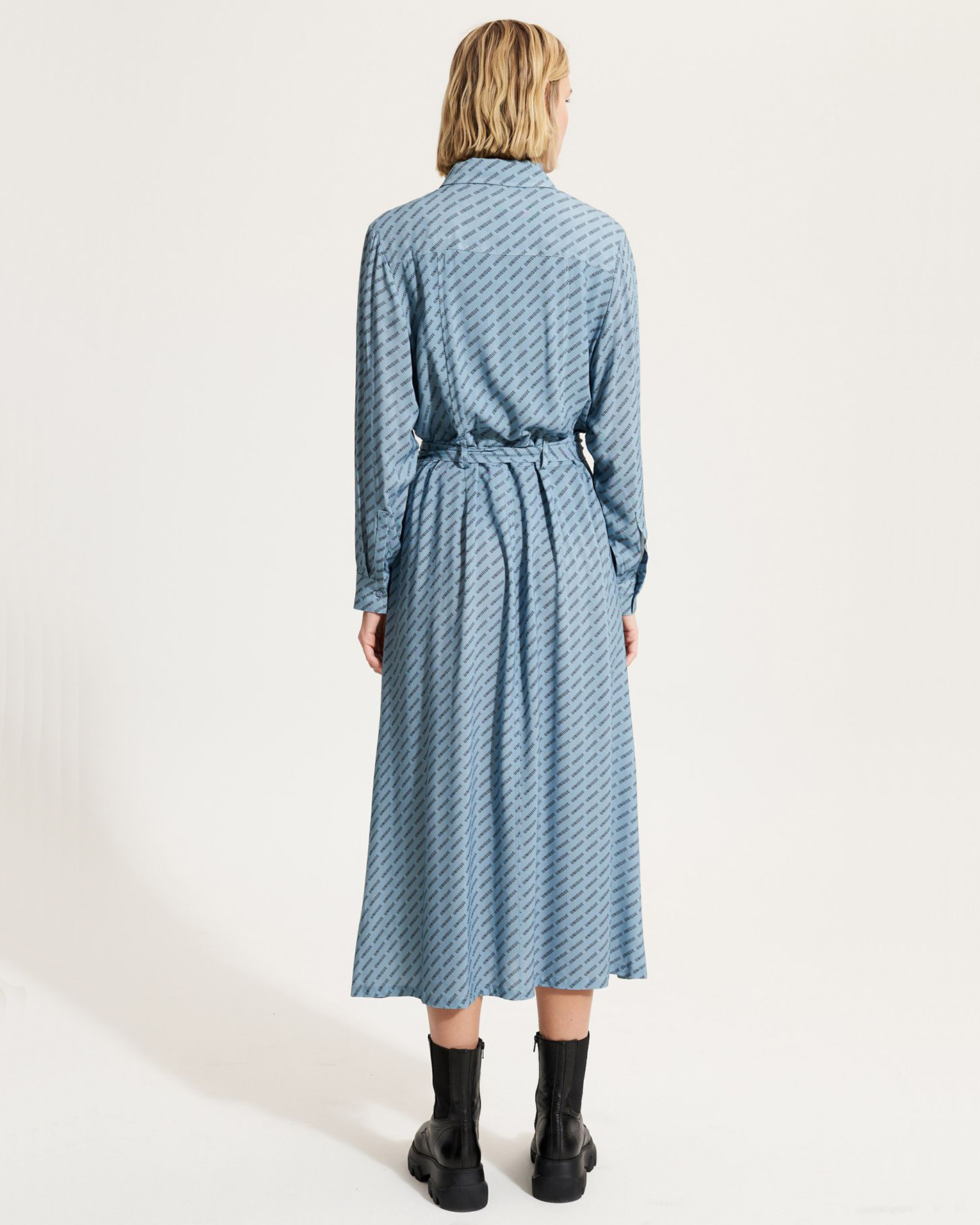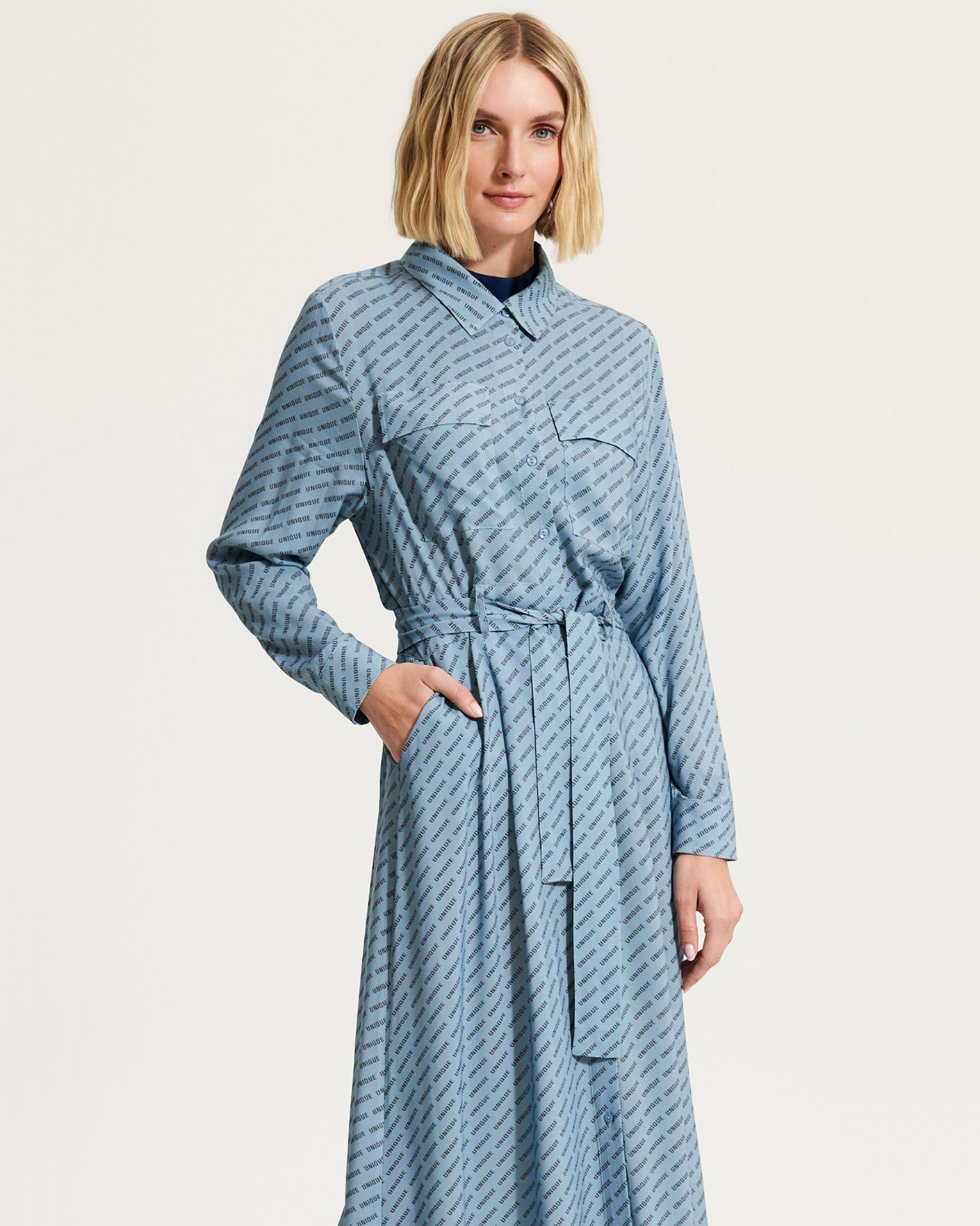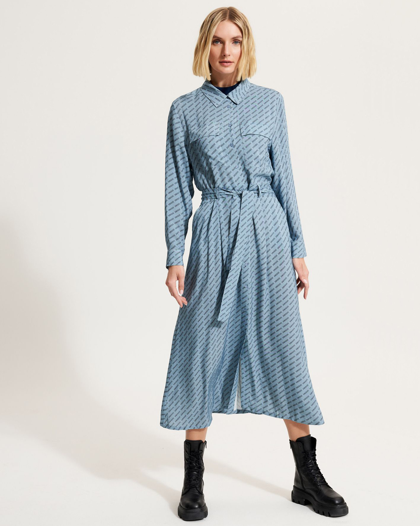 Идеальное платье-рубашка UNQ серо-голубого цвета в мелкий принт в виде логотипа. Модель с отложным воротником, застежка на пуговицы по всей длине, имеются врезные карманы по бокам и накладные нагрудные с клапанами. Длина миди, линию талии можно подчеркнуть с помощью вставного пояса в тон. Платье-рубашка станет фаворитом вашего гардероба.