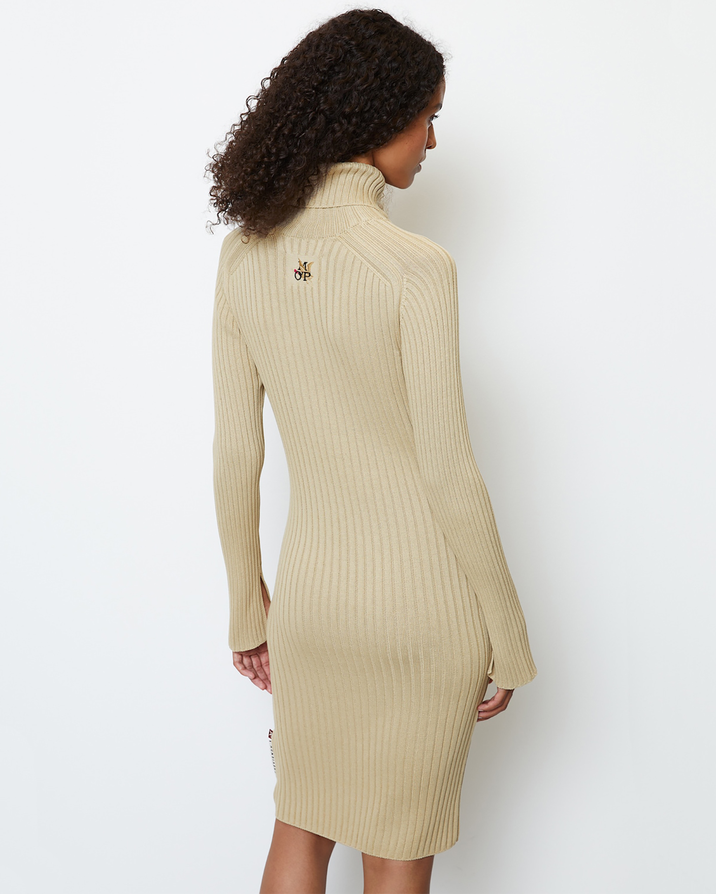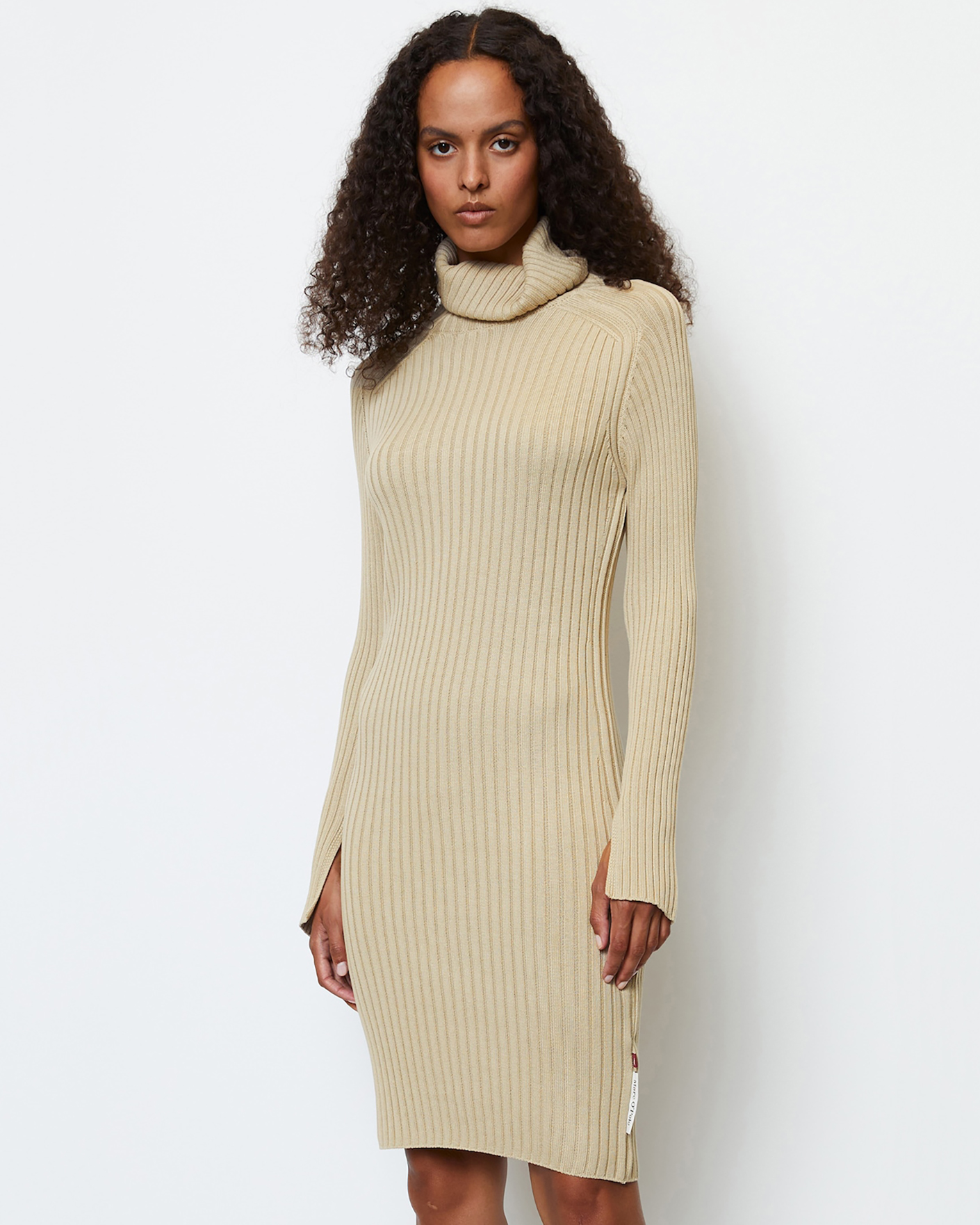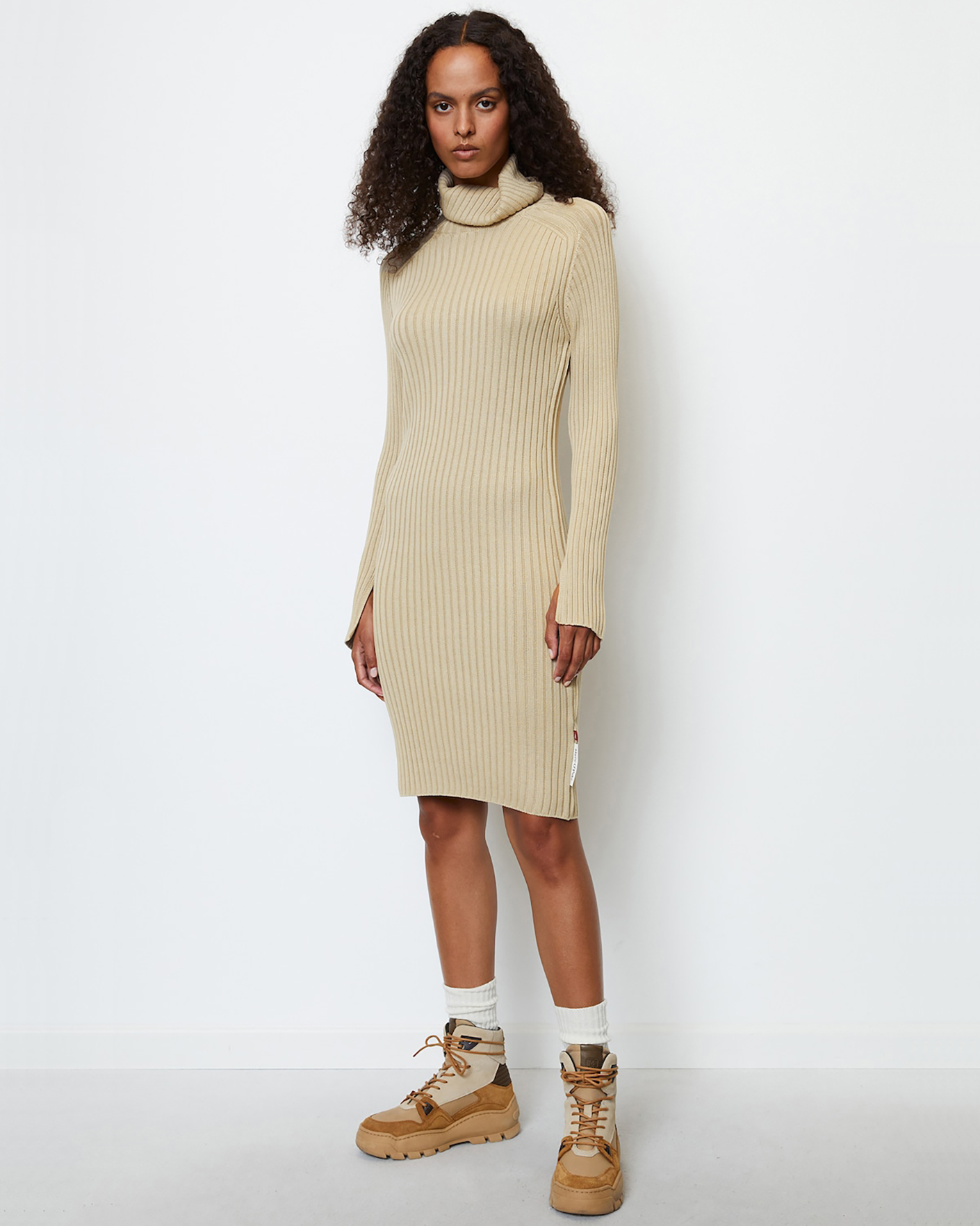 Облегающее платье-свитер Marc O'Polo светло-бежевого цвета в вертикальную вязку-лапша. Модель из 100% хлопка с двойным воротником-стойка, длинные рукава с небольшими разрезами у манжет по линии шва. Платье-свитер станет фаворитом вашего гардероба.