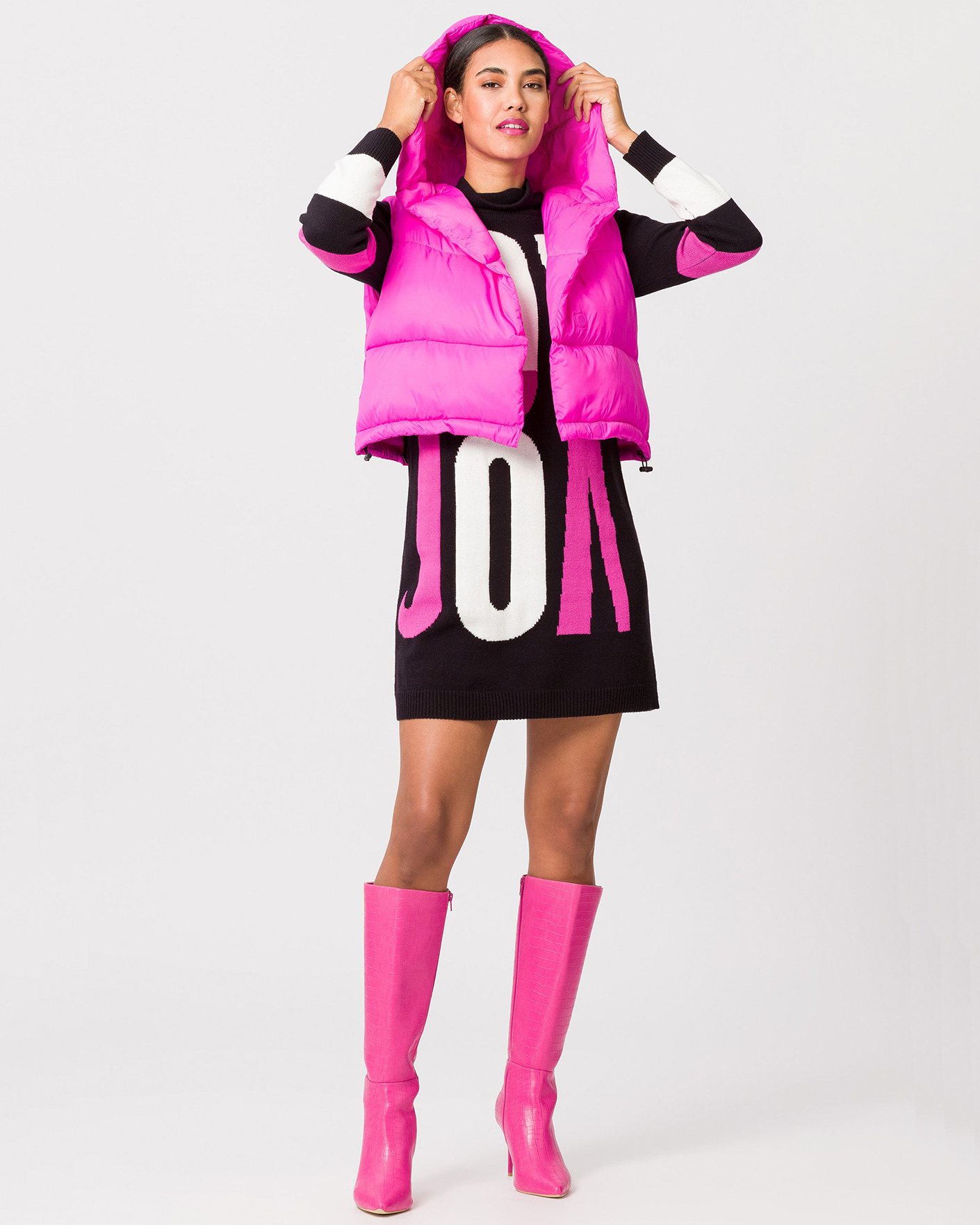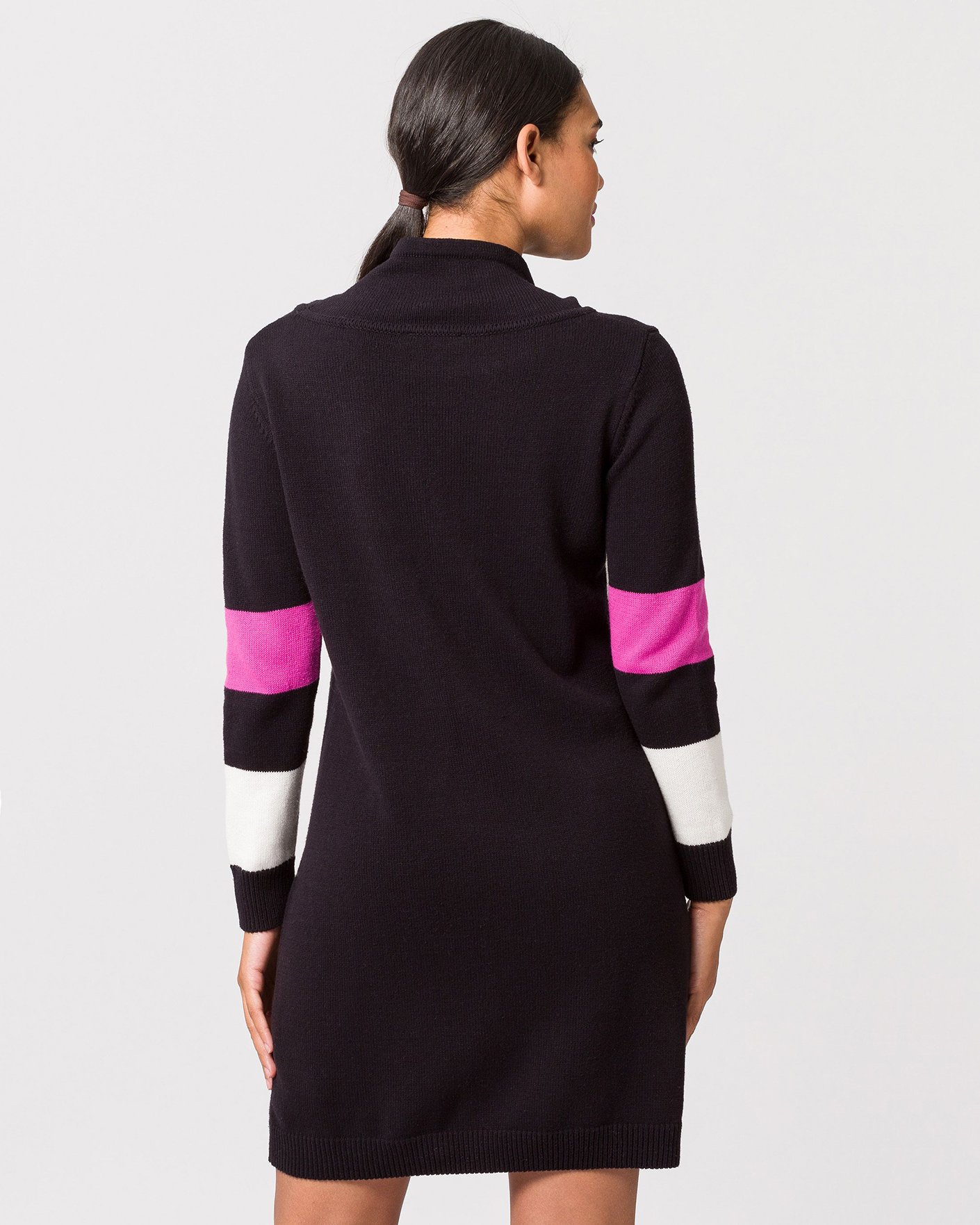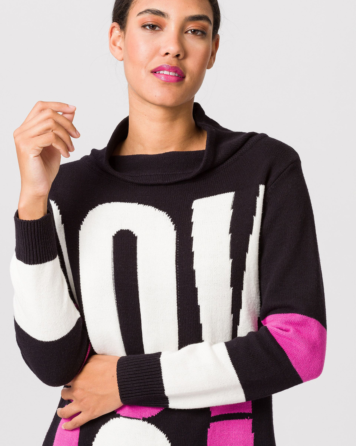 Платье-свитер Tuzzi розово-черного цвета в вывязанный крупный слоган. Модель с широким воротником-стойка, длинными рукавами, манжеты и низ на тонкой ребристой резинке. Платье-свитер - идеальный вариант на каждый день.