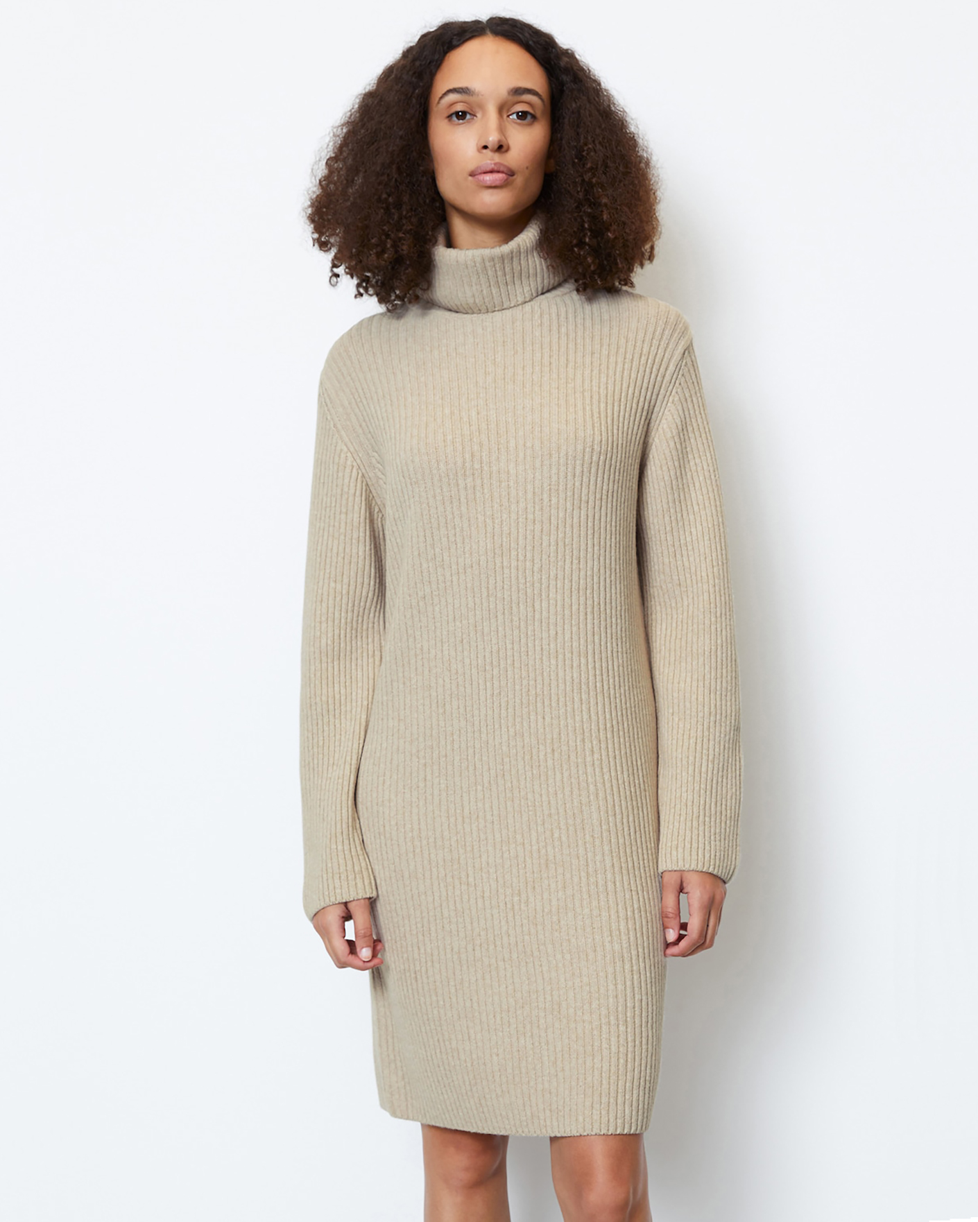 Идеальное платье-свитер Marc O'Polo бежевого цвета в вертикальнуювязку лапшой. Модель с двойным воротником-стойка и длинными рукавами. Платье-свитер станет фаворитом повседневного гардероба.