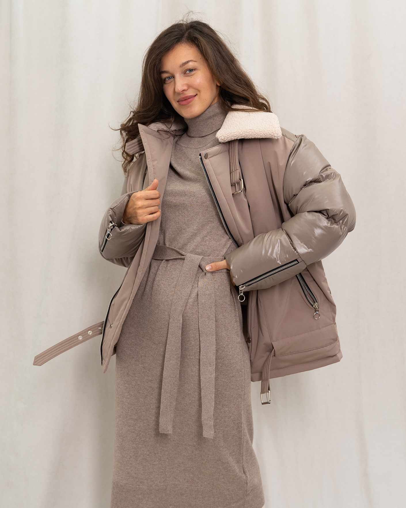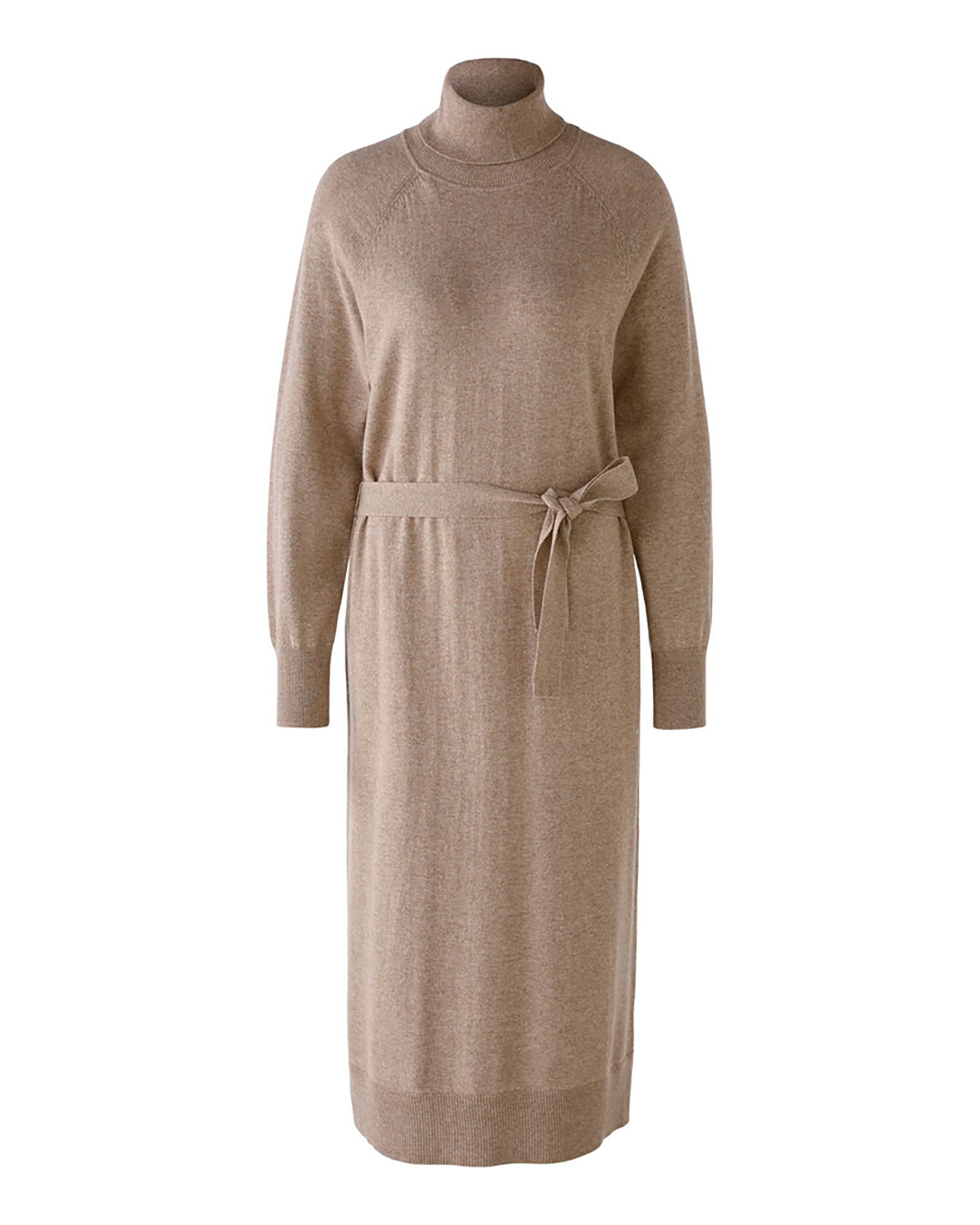 Свободное платье OUI серо-бежевого цвета на поясе. Модель длины миди, воротник-стойка, манжеты и низ на тонкой ребристой резинке. Универсальное и комфортное платье отлично впишется в ваш гардероб на каждый день.