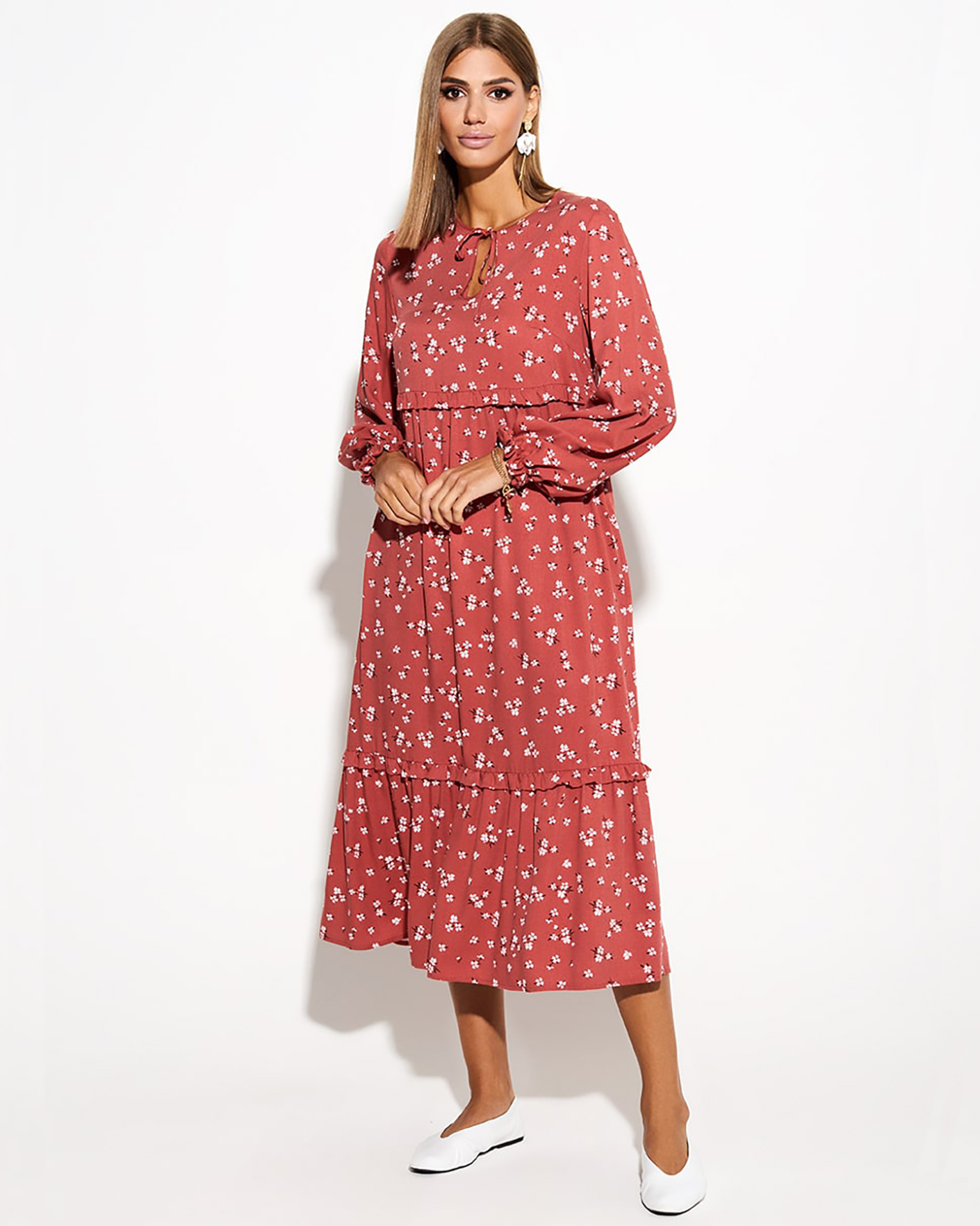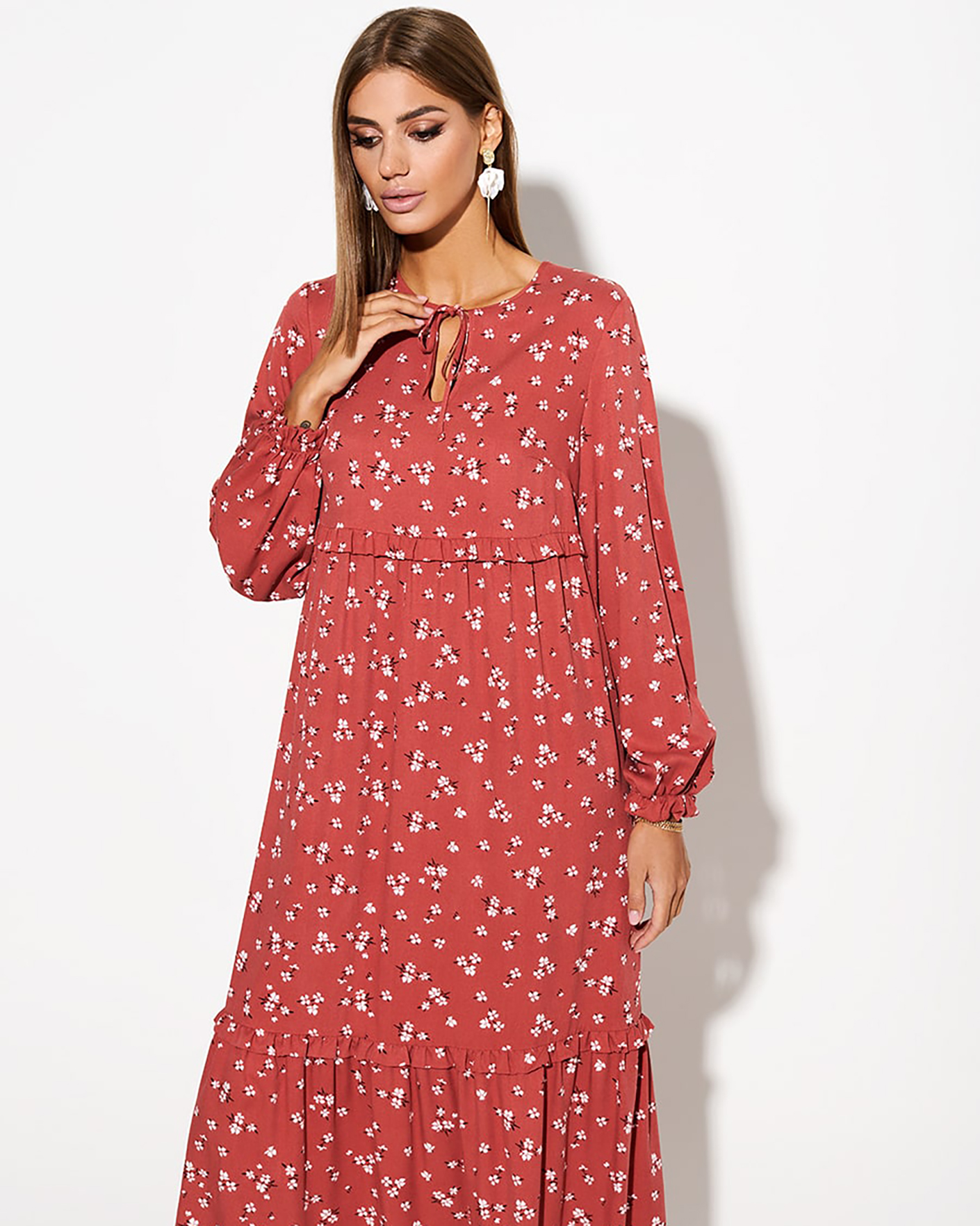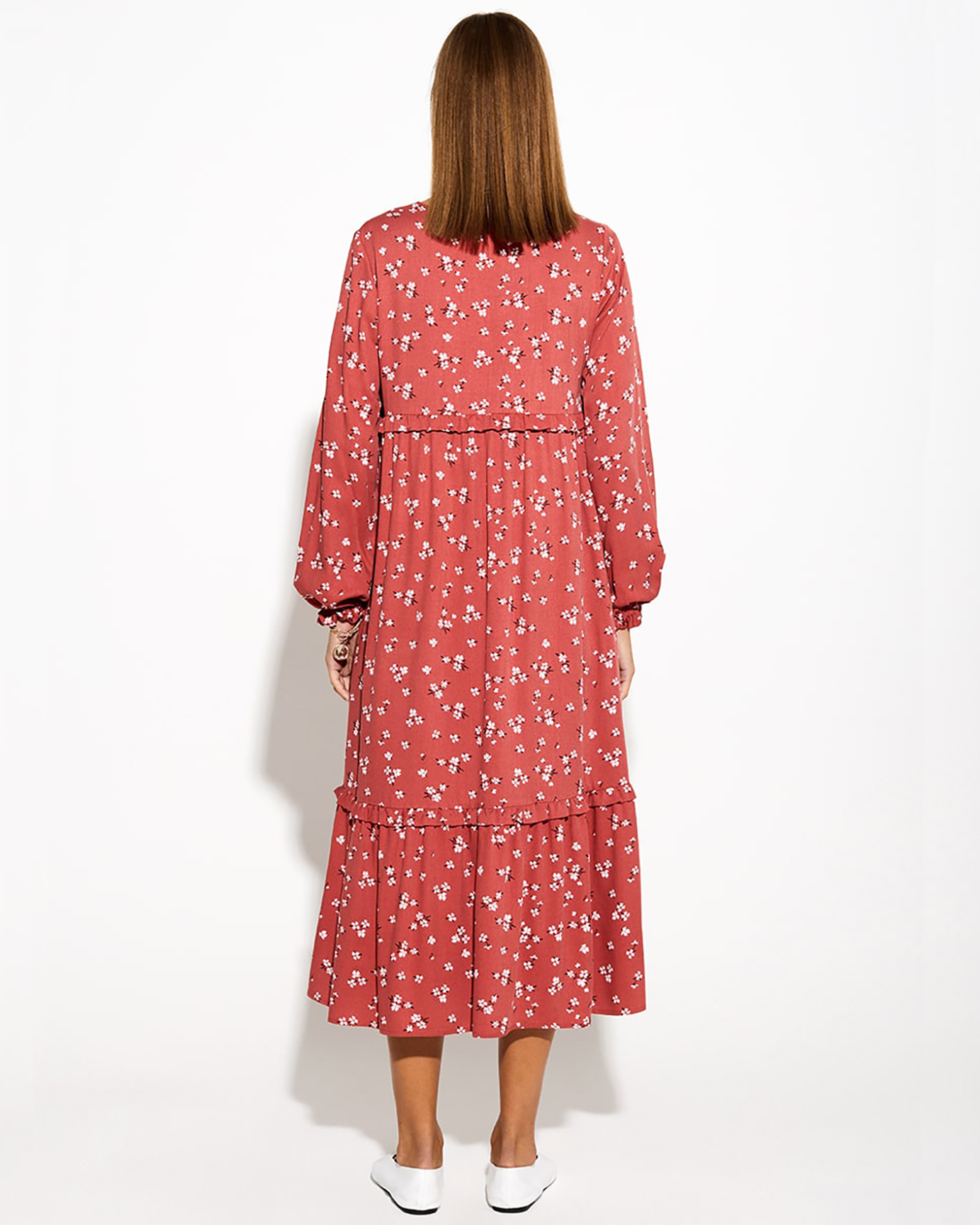 Свободное платье Devita красного цвета в мелкий цветочный рисунок. Модель с круглым вырезом и небольшим разрезом на завязках. Декоративные рюши вокруг линии бюста и подола. Широкие рукава с манжетами со сборкой на резинку. Стильное платье отлично впишется в ваш гардероб.