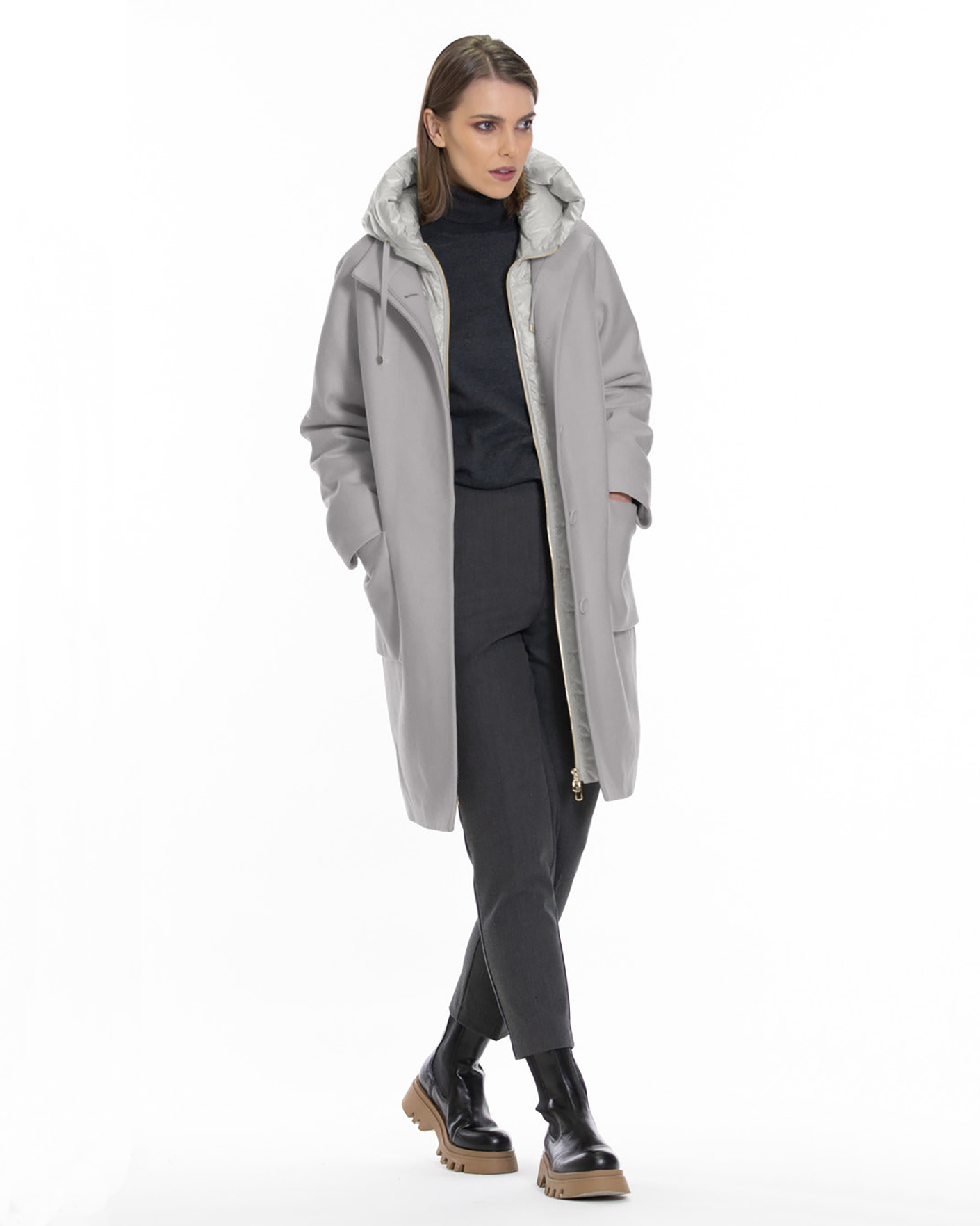 Утепленный пуховик Duno серого цвета из комбинированных тканей. Шерстяная модель спереди и рукавах, спинка и капюшон в горизонтальную стежку. Внутрення стеганая застежка на молнию, внешнаяя шерстяная на крупные пуговицы в тон. Имеются накладные карманы по бокам. Стильный пуховик станет фаворитом вашего повседневного гардероба.