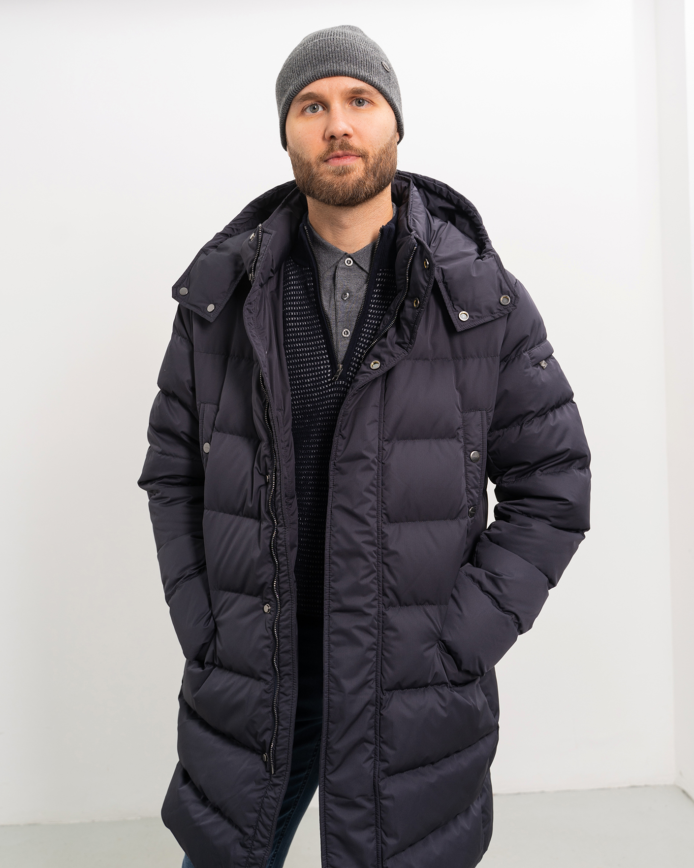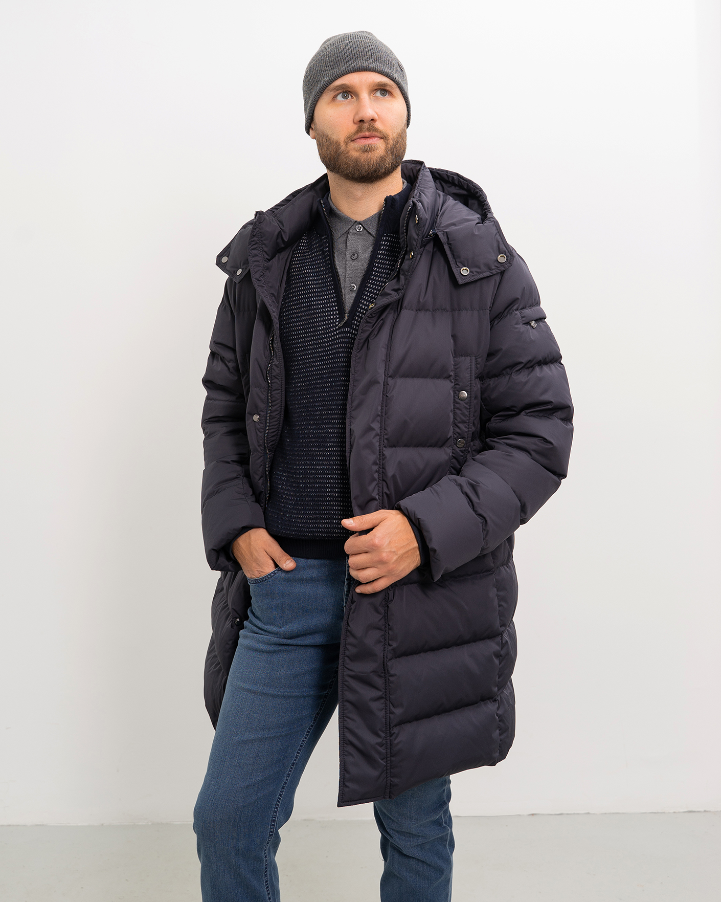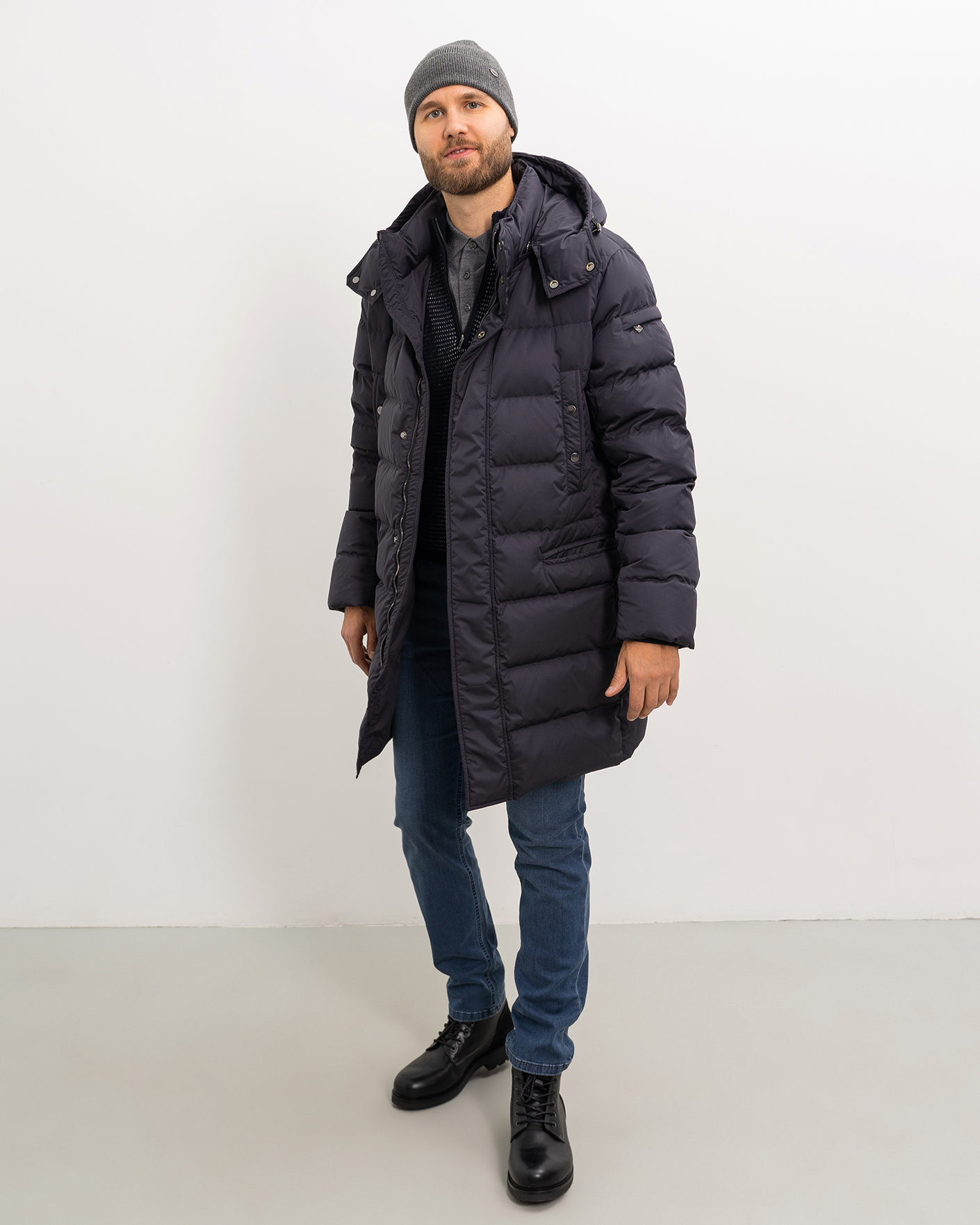 Пуховик Igor Plaxa темно-синего цвета в горизонтальную стежку. Модель с воротником-стойка со съемным капюшонмо спланкой на клепки, что обеспечивает максимальную защиту от ветра. Застежка на скрытую молнию с планкой на клепки, имеются четыре врезных кармана. Пуховик - незаменимый спутник на каждый день.
