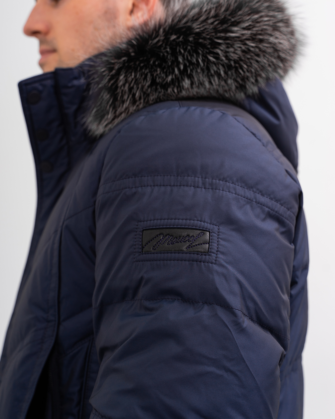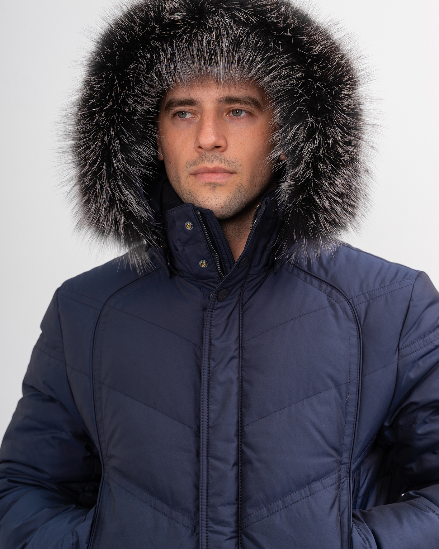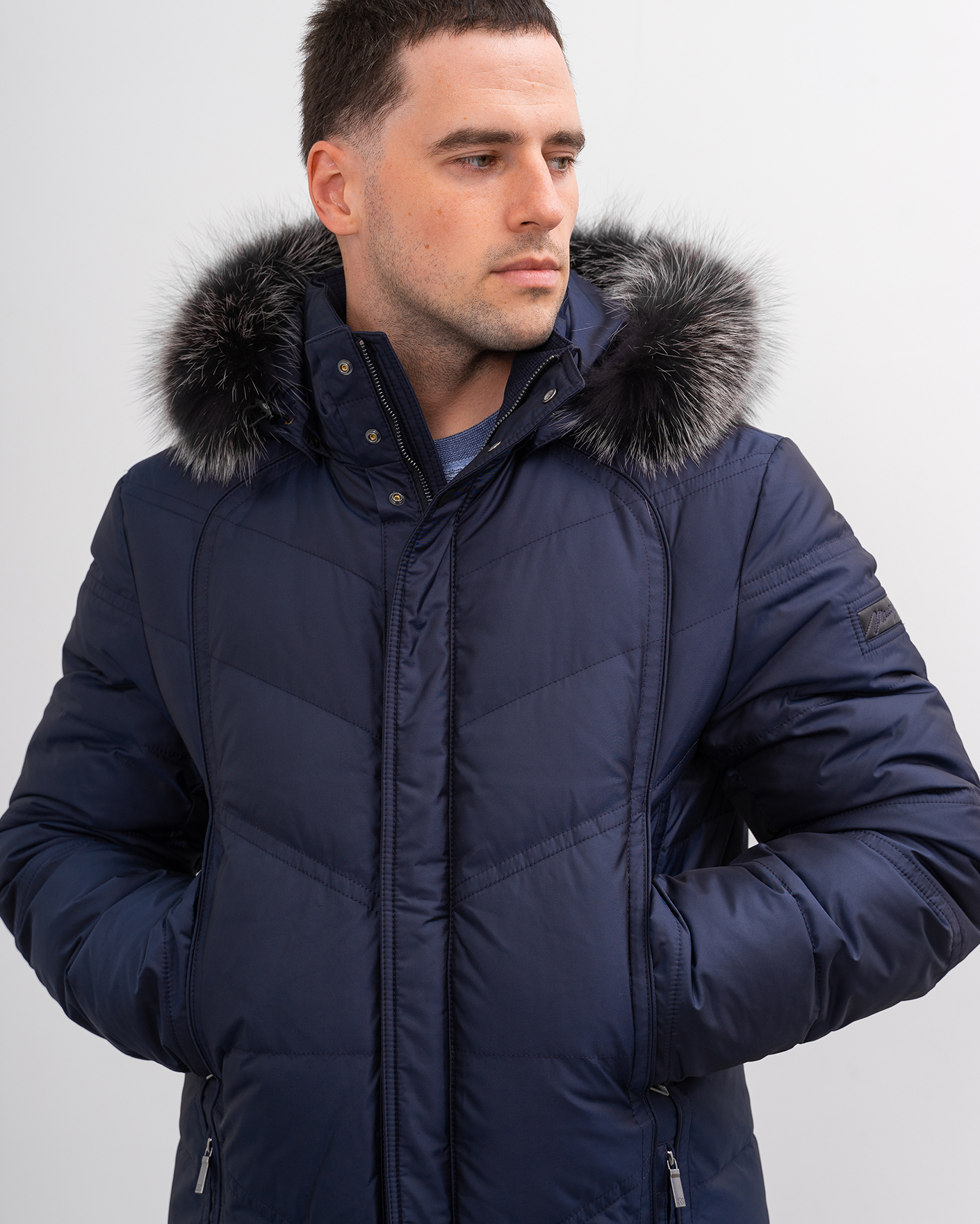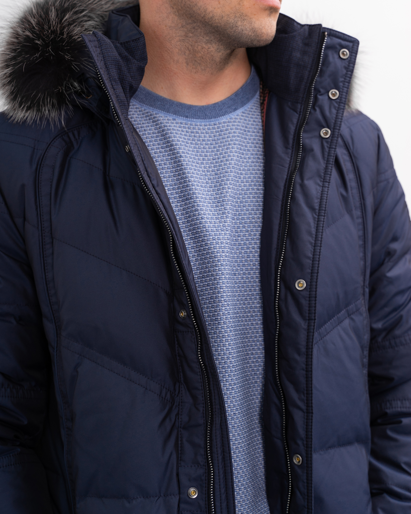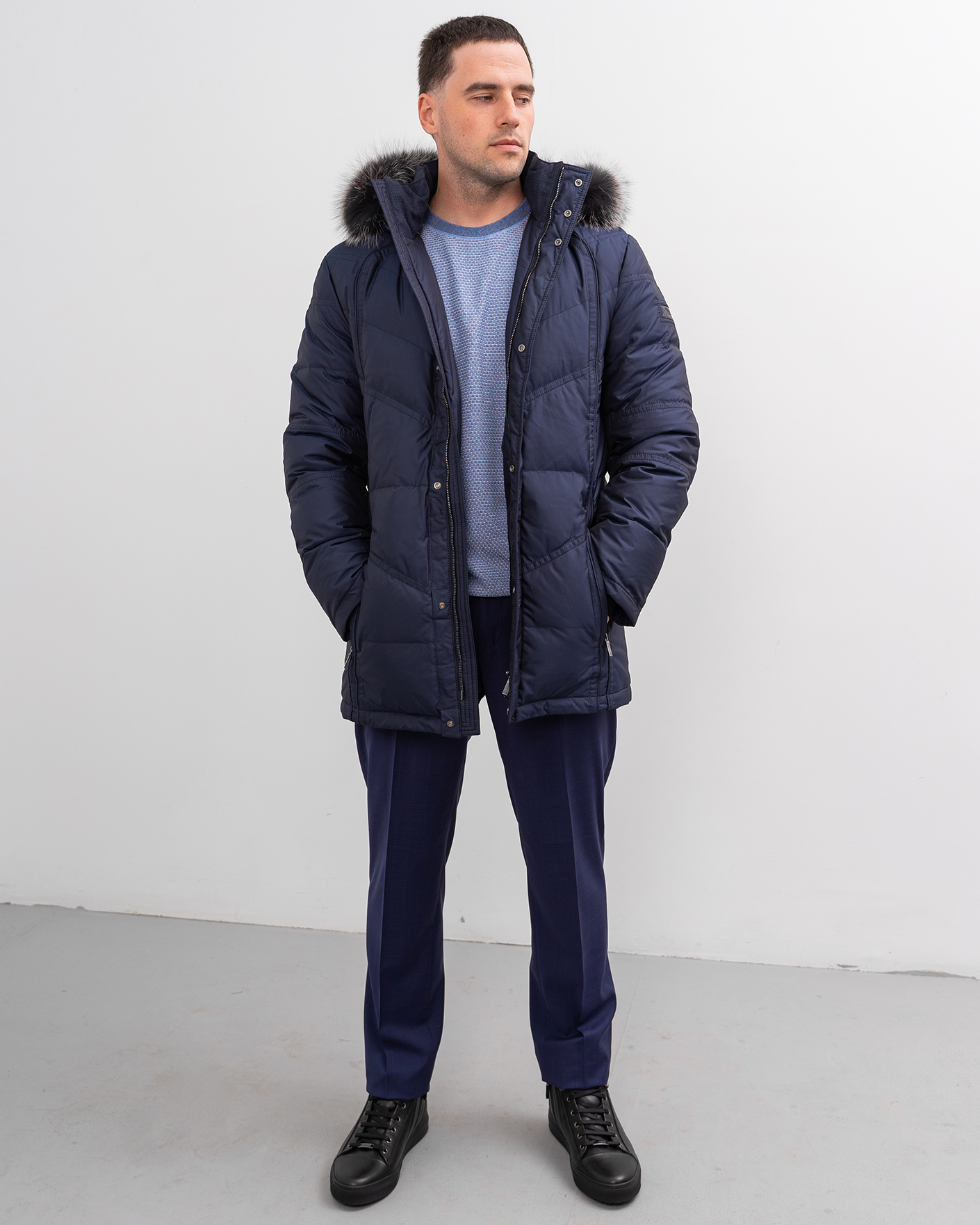 Пуховик Meucci фиолетово-синего цвета в геометрическую стежку. Модель с воротником-стойка, съемным регулируемым капюшоном, декорированным мехом. Застежка на скрытую молнию и планку на кнопки. Имеются карманы по бокам на молнии. Теплый пуховик - идеален в холодное время года.