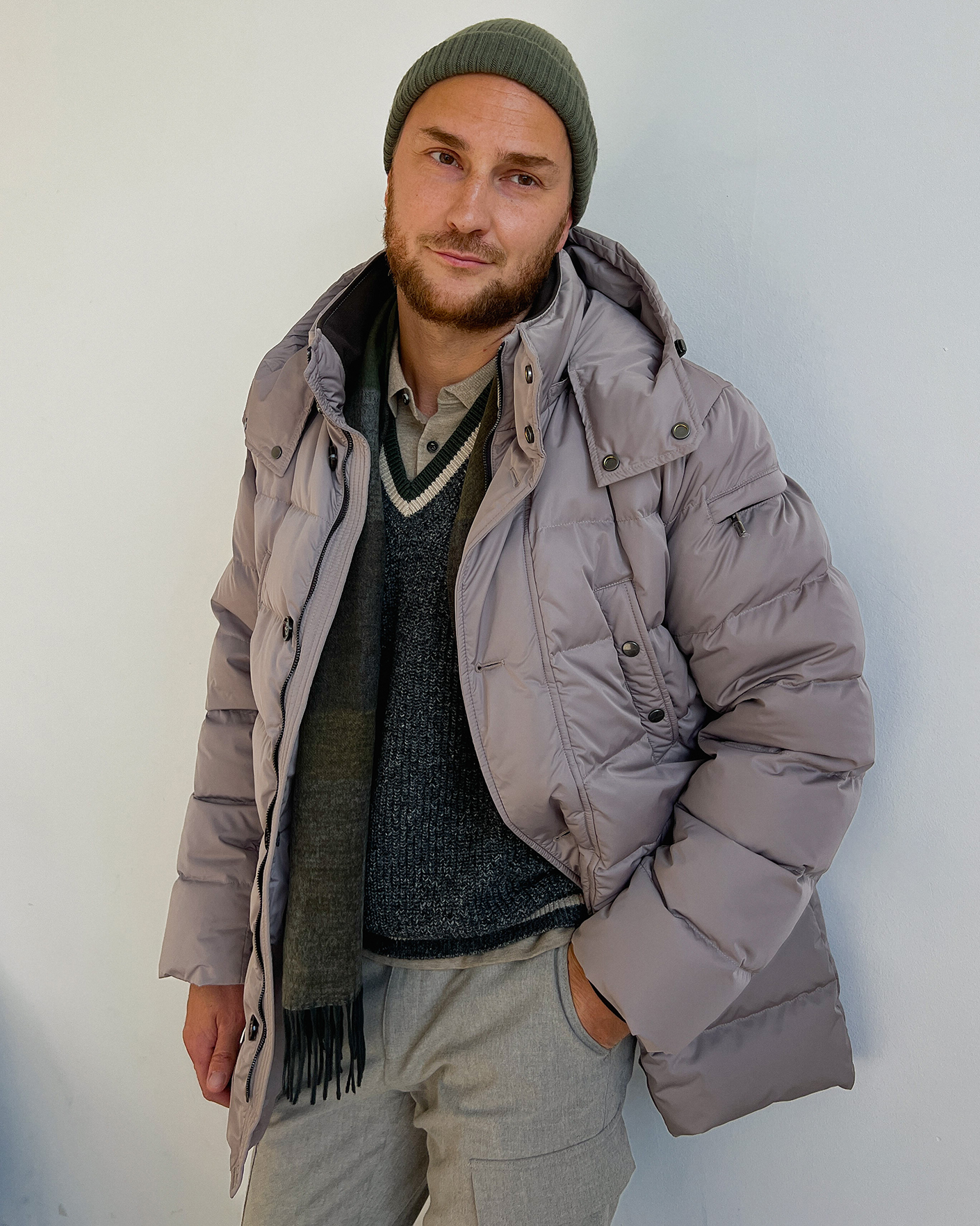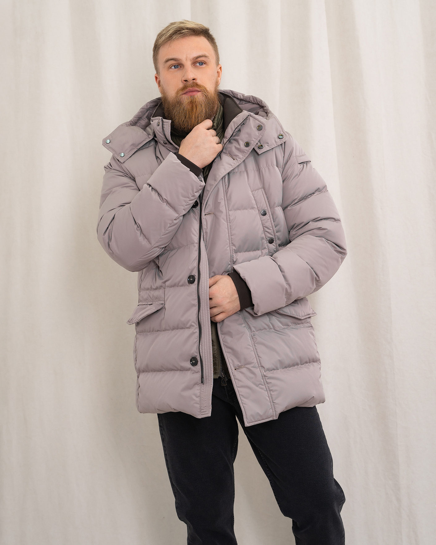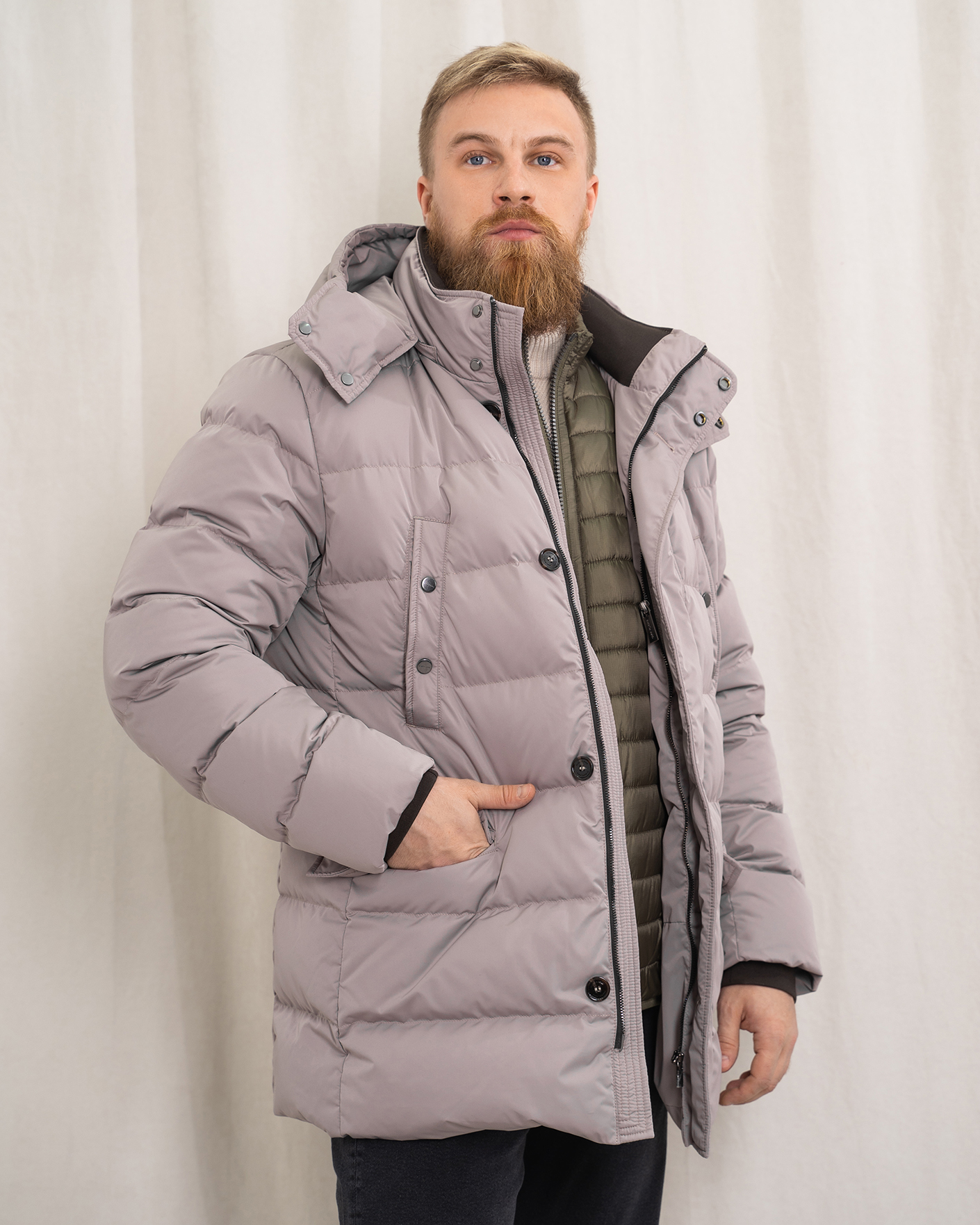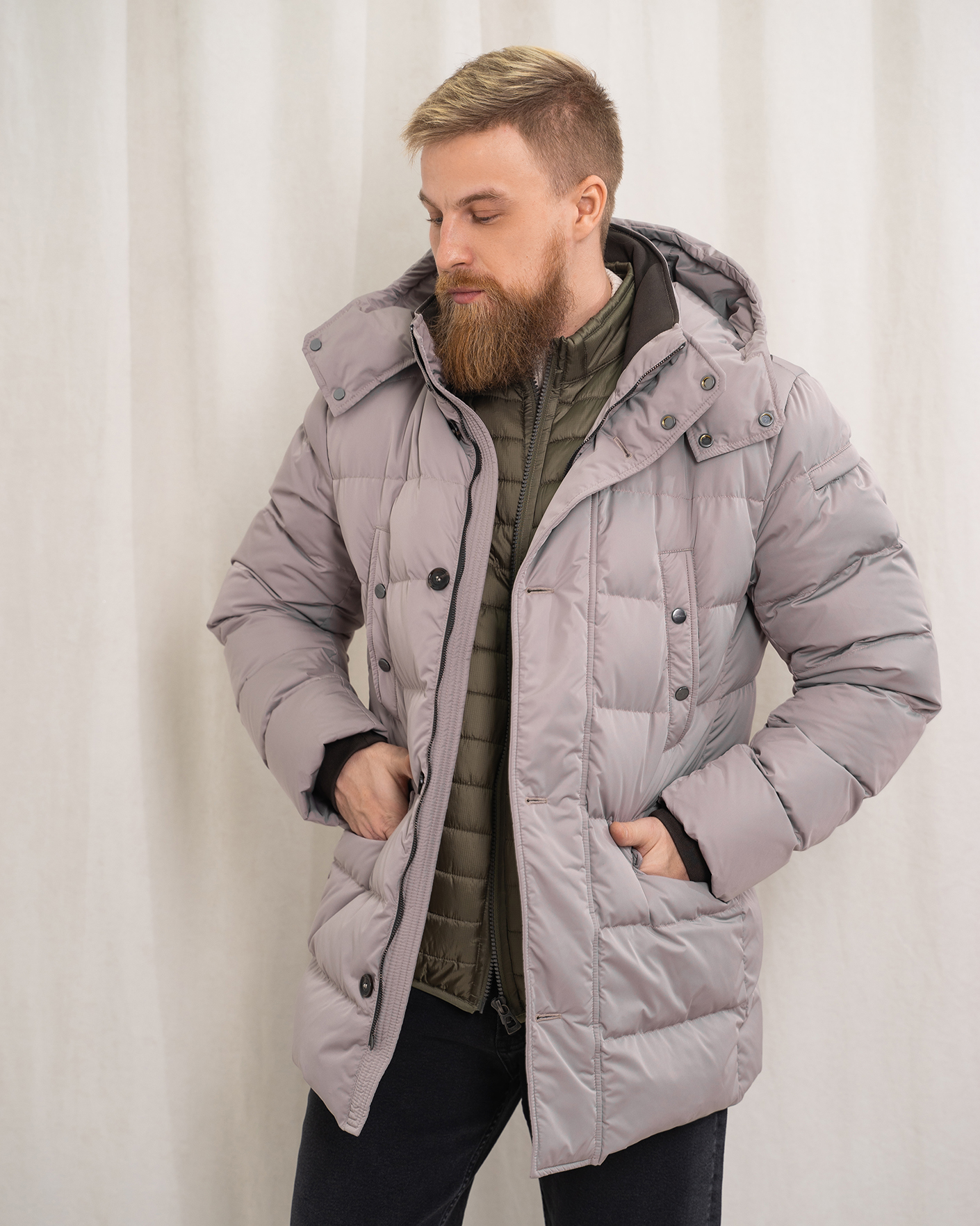 Пуховик Igor Plaxa светло-серого цвета в горизонтальную стежку. Модель с воротником-стойка, съемным капюшоном с планкой на клепкои, что обеспечивает максимальную защиту от ветра. Застежка на молнию и планку на клепки. Имеются карманы по бокам, на груди и плече. Универсальный и теплый пуховикидеален на каждый день.