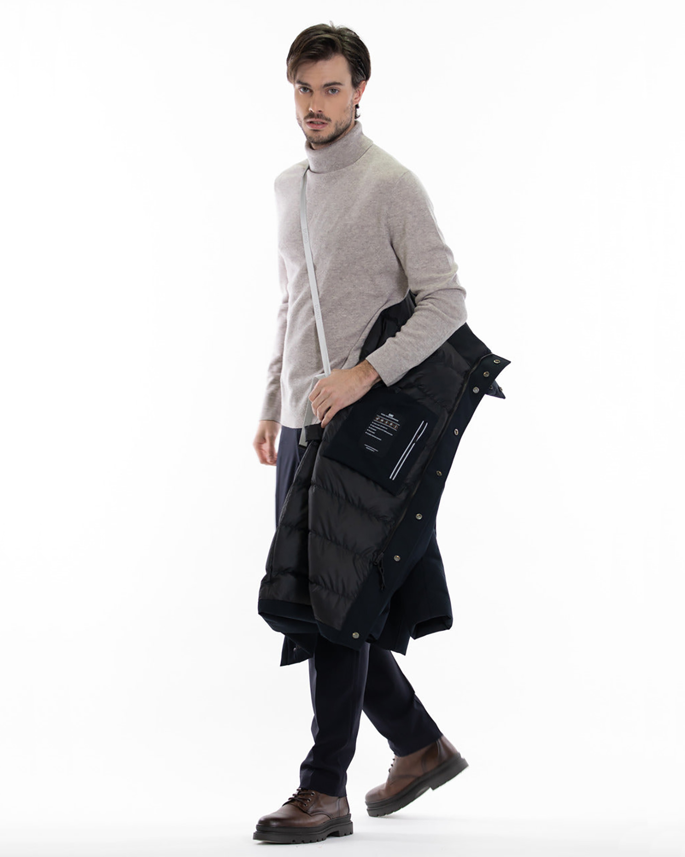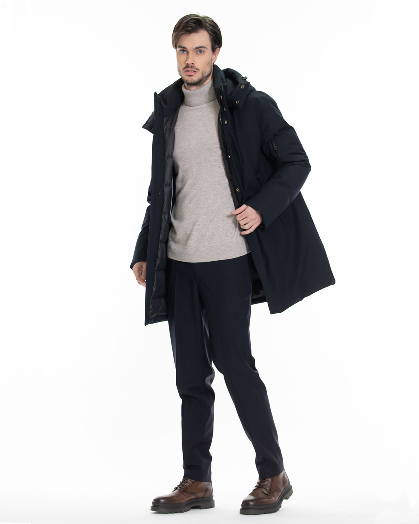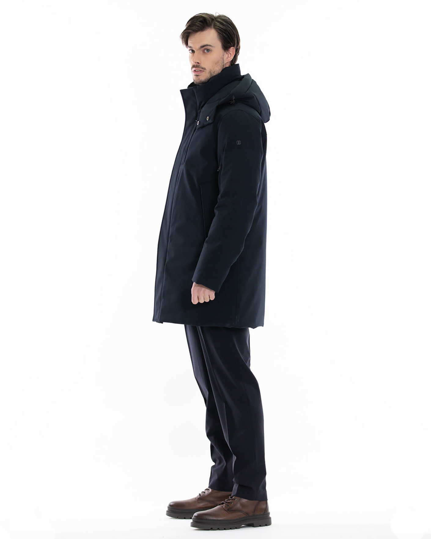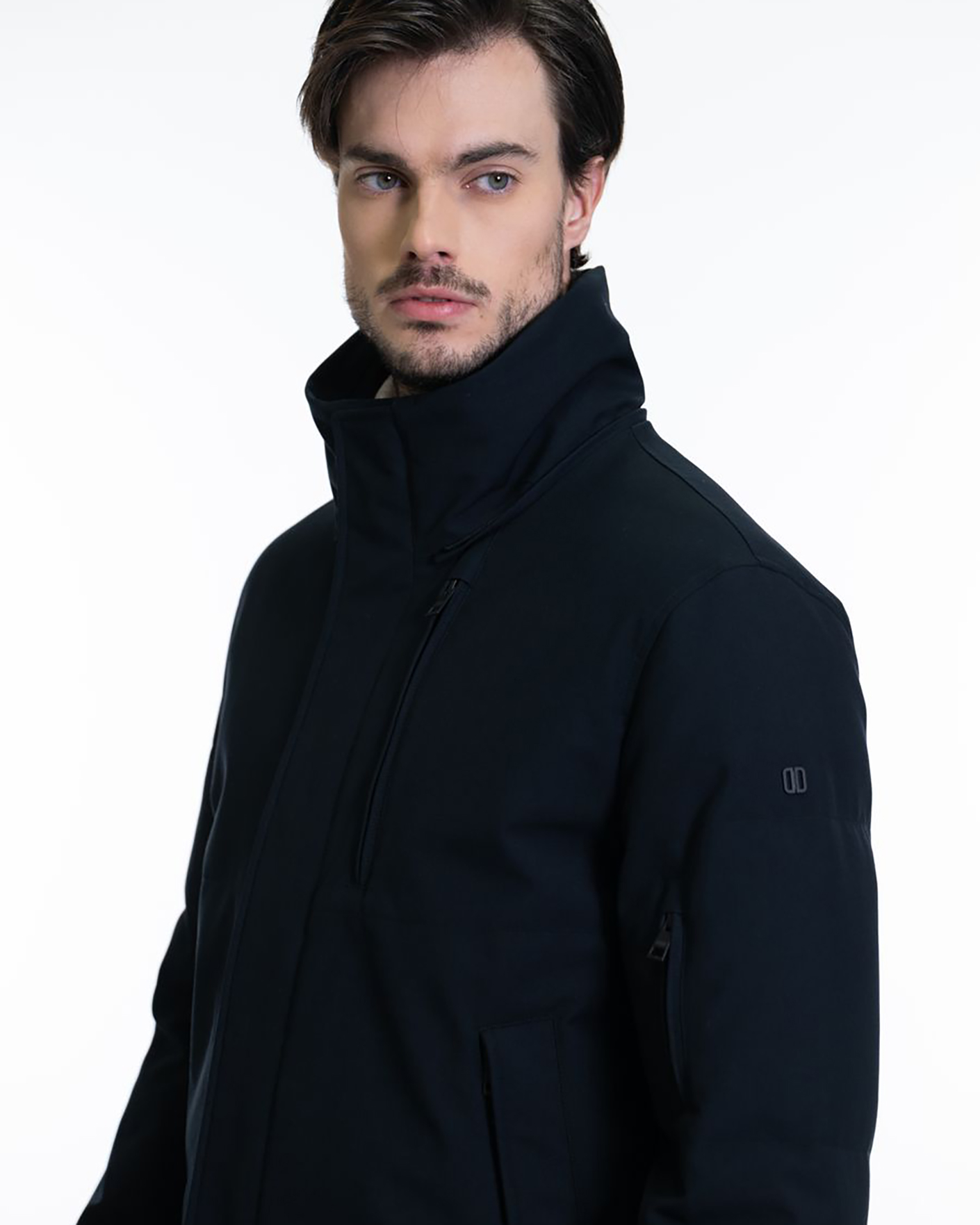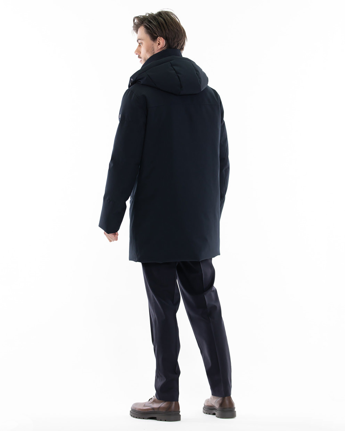 Теплый пуховик Duno темно-синего цвета. Модель с воротником-стойка, съемным капюшоном, застежкой на скрытую молнию с планкой на клепках. Имеются врезные карманы на молниях по бокам и на плече. Пуховик - идеальный спутник в холодную погоду.