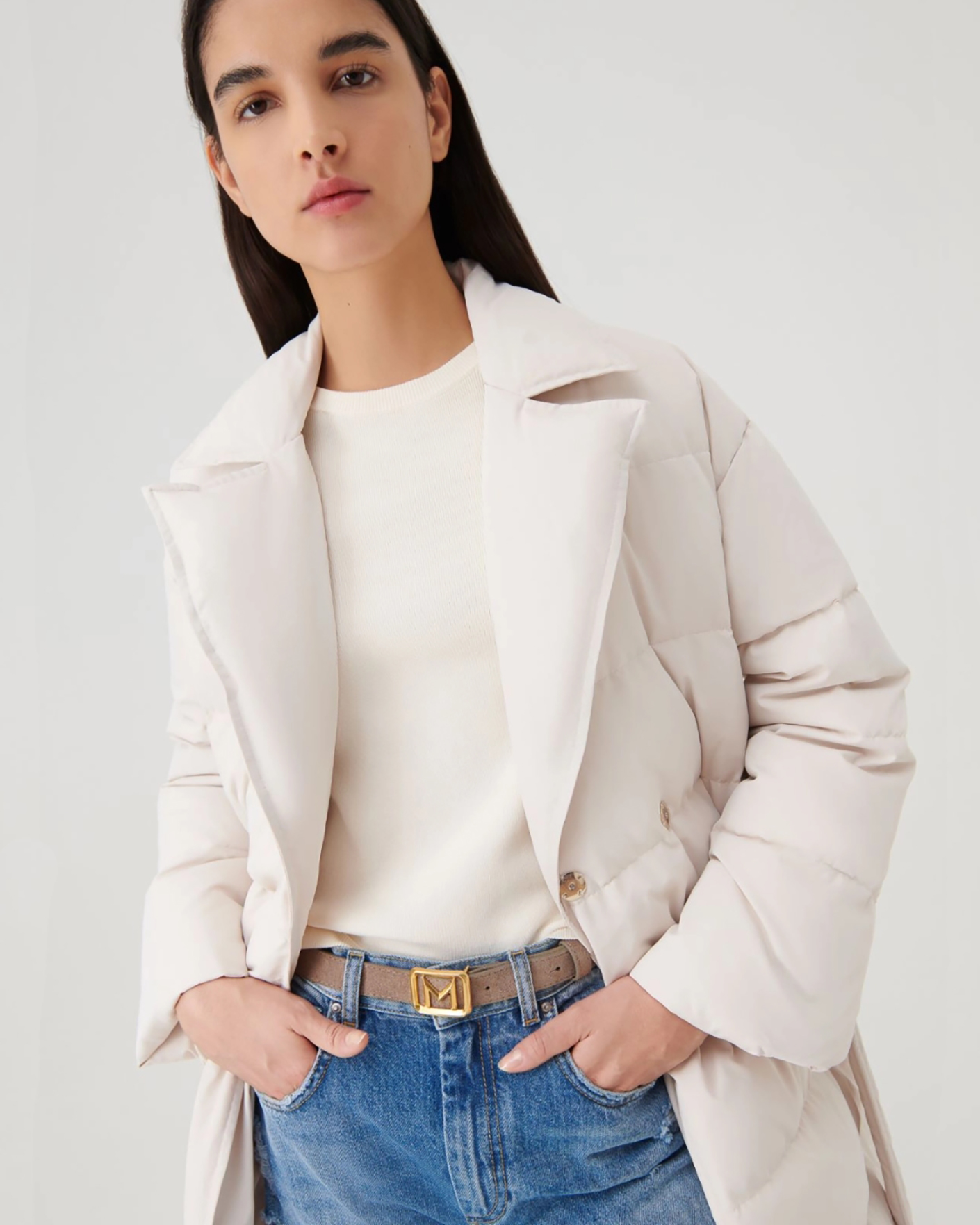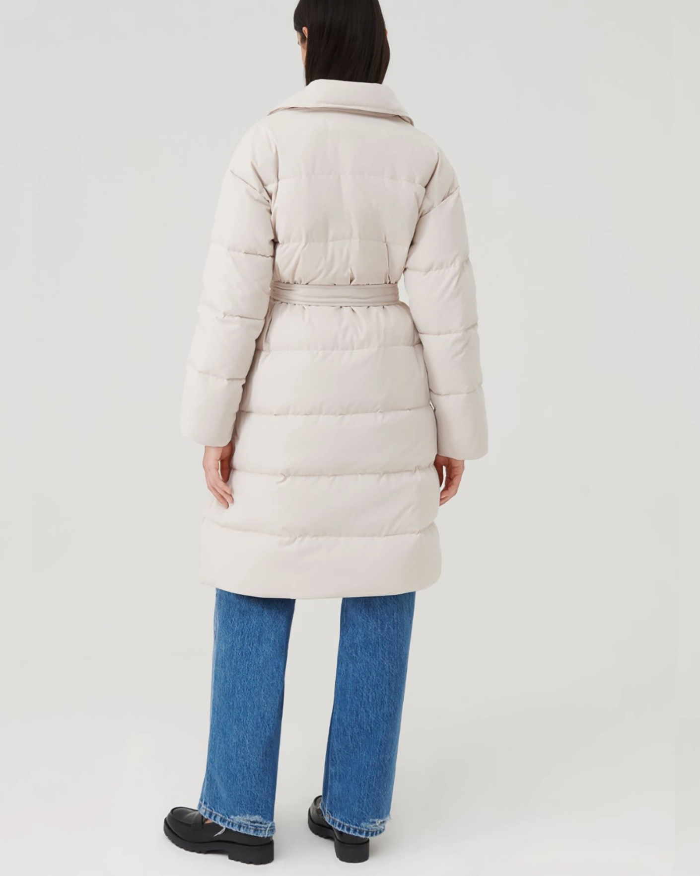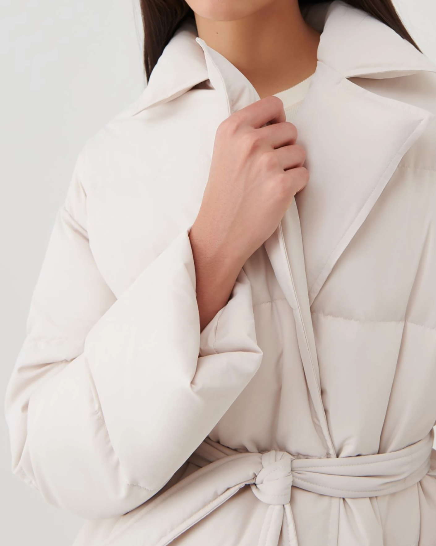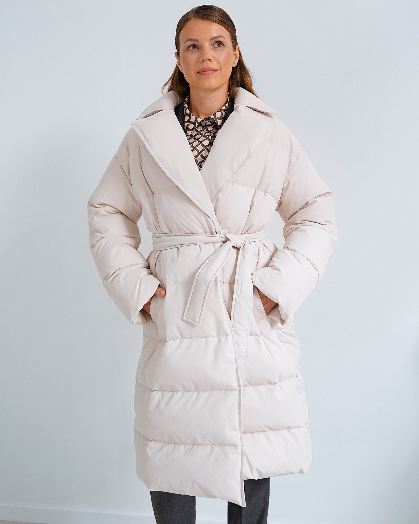 Теплый пуховик Marella кремового цвета в горизонтальную стежку. Модель с широкими лацканами, скрытая двубортная застежка на клепки, имеются карманы по бокам. Также имеется съемный пояс в тон. Пуховик - самая необходимая вещь для зимы.