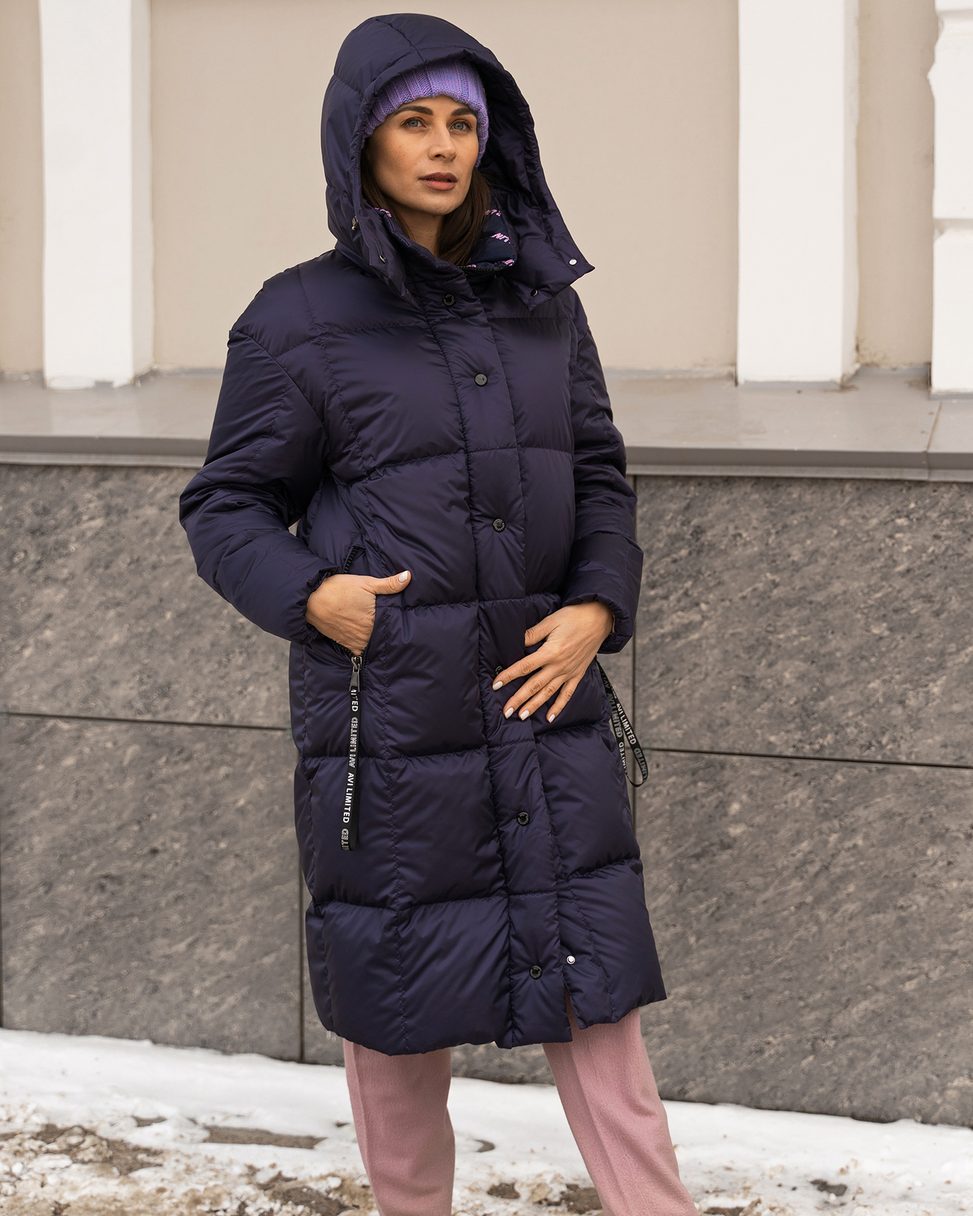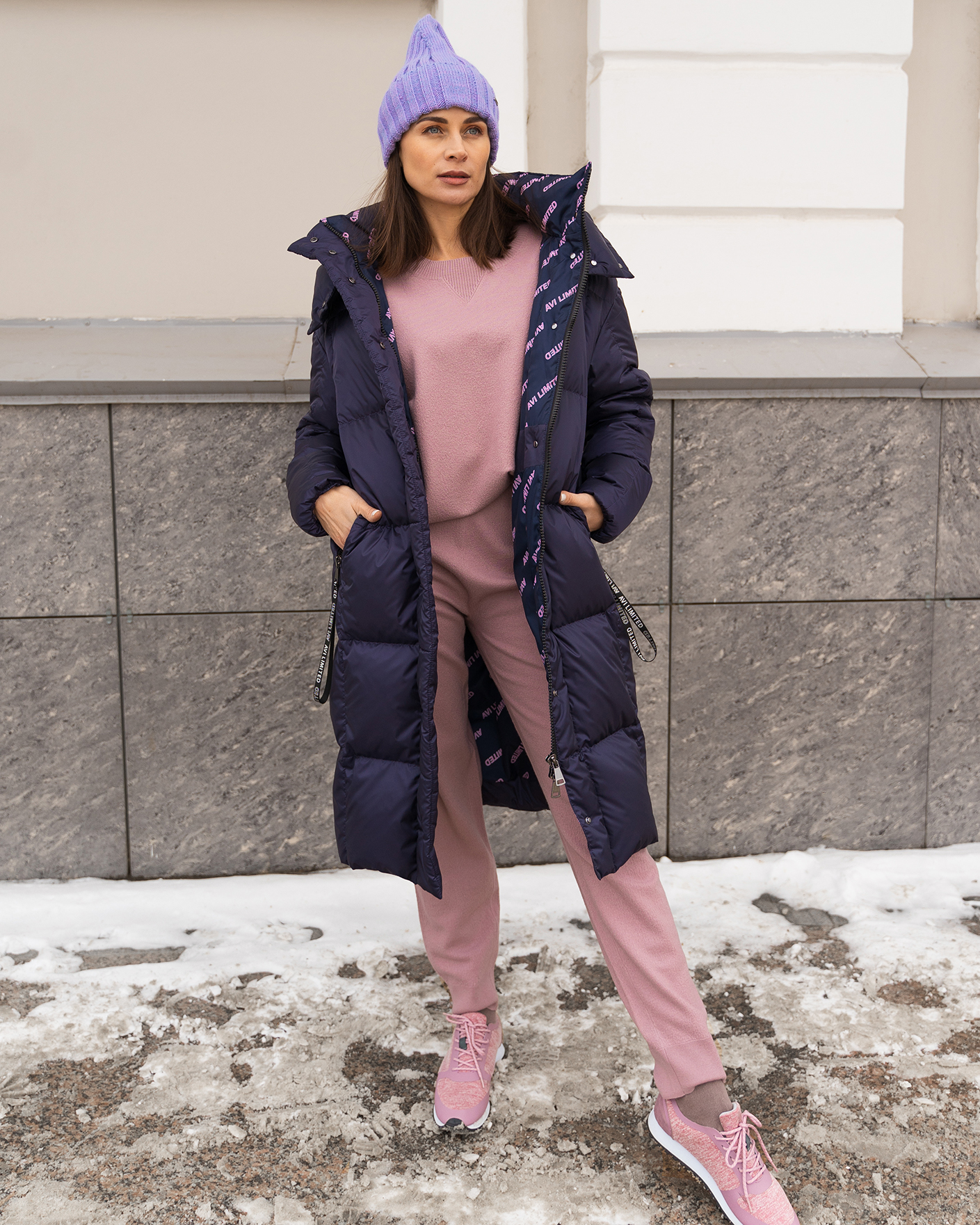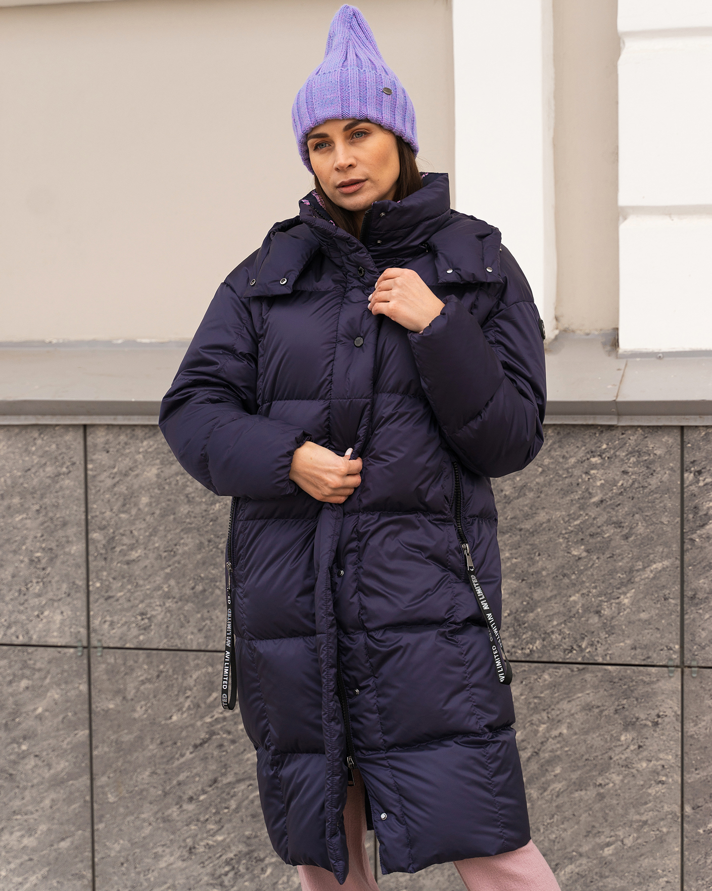 Пуховик-кокон AVI фиолетово-синего цвета в широкую стежку. Модель длины миди, с ругелируемым съемным капюшоном, воротником-стойка, что обеспеичвает максимальную защиту от ветра. Застежка на молнию по всей длине с планкой на клепки. Боковые карманы на молниях с широкими лентами с принтом. Подклад у модили выполнен в темно-синем цвете с диагональными надписями в розовом цвете. Стильный, а главное практичный и теплый пуховик станет идеальным спутником в холодное время года.