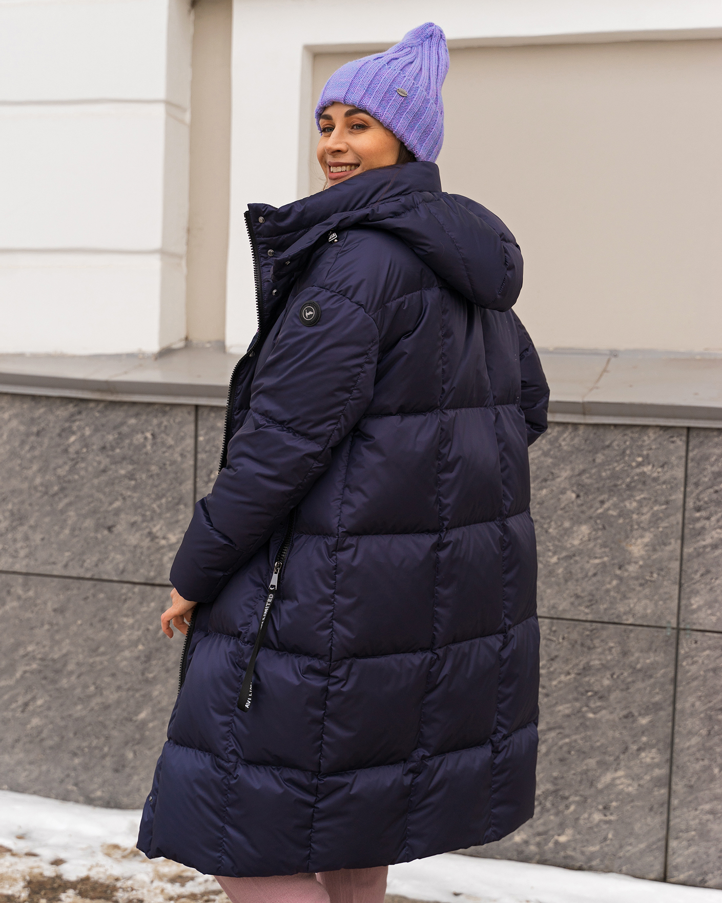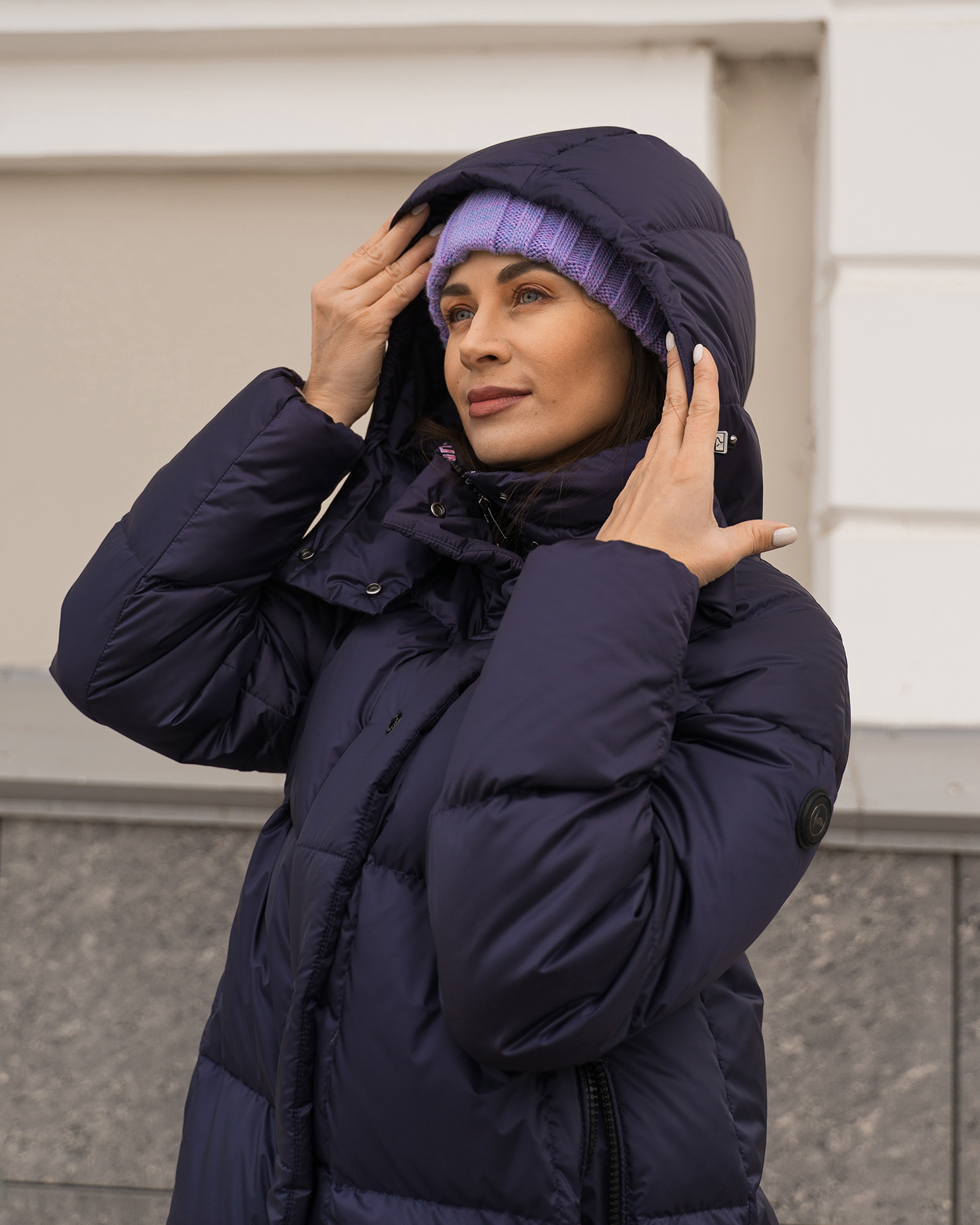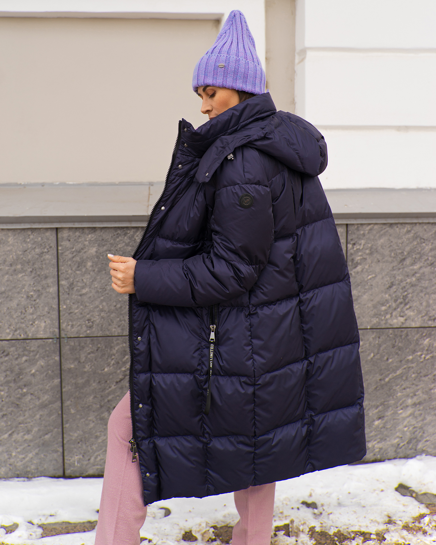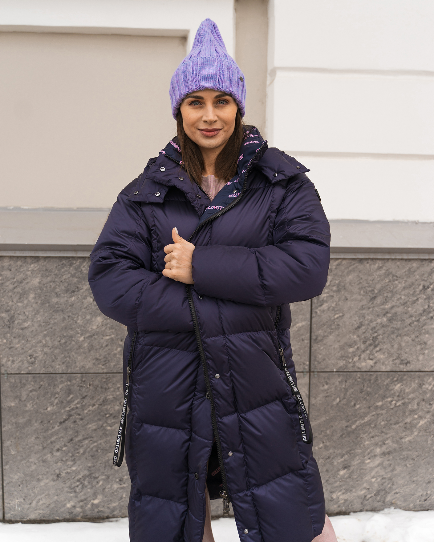 Пуховик-кокон AVI фиолетово-синего цвета в широкую стежку. Модель длины миди, с ругелируемым съемным капюшоном, воротником-стойка, что обеспеичвает максимальную защиту от ветра. Застежка на молнию по всей длине с планкой на клепки. Боковые карманы на молниях с широкими лентами с принтом. Подклад у модили выполнен в темно-синем цвете с диагональными надписями в розовом цвете. Стильный, а главное практичный и теплый пуховик станет идеальным спутником в холодное время года.