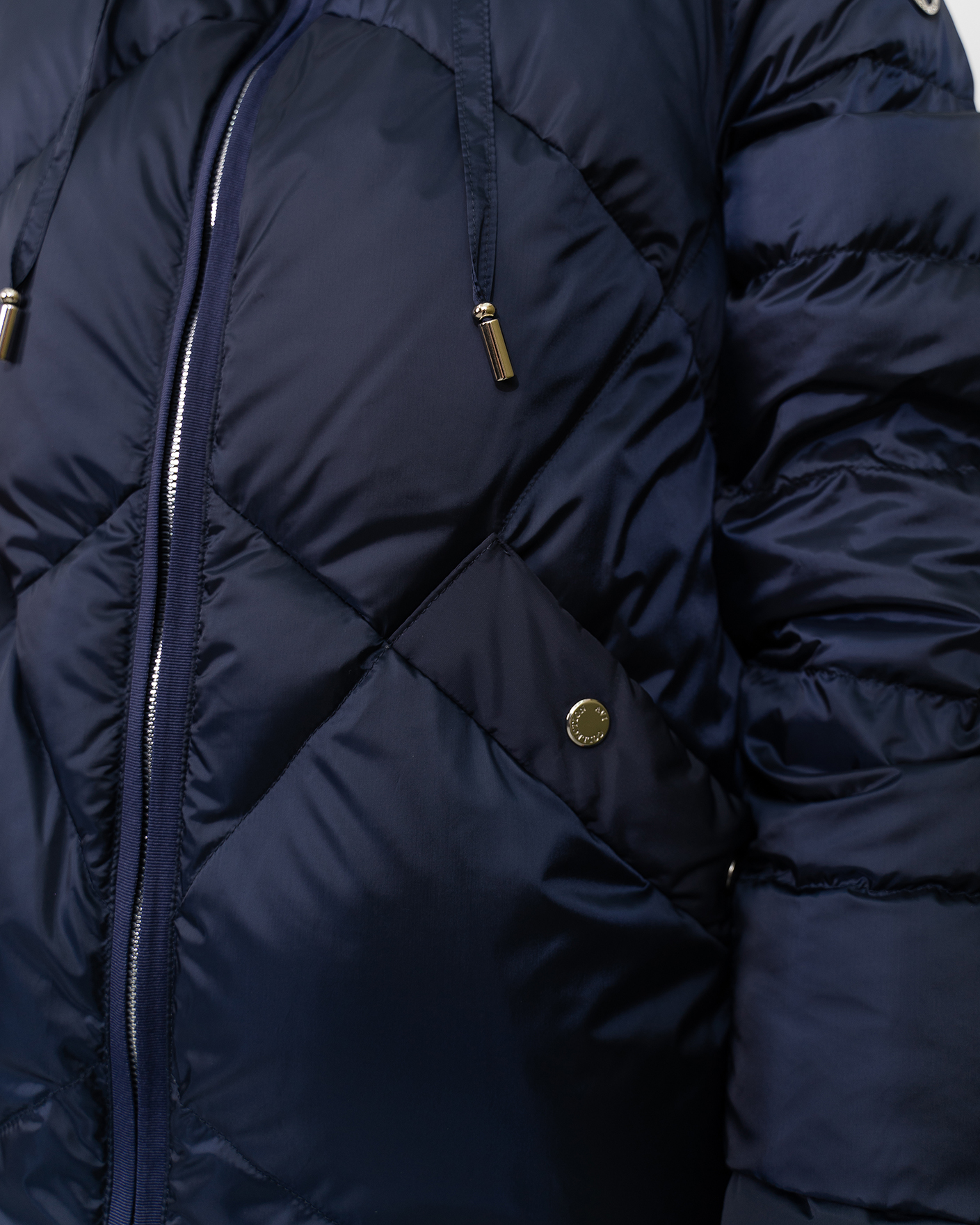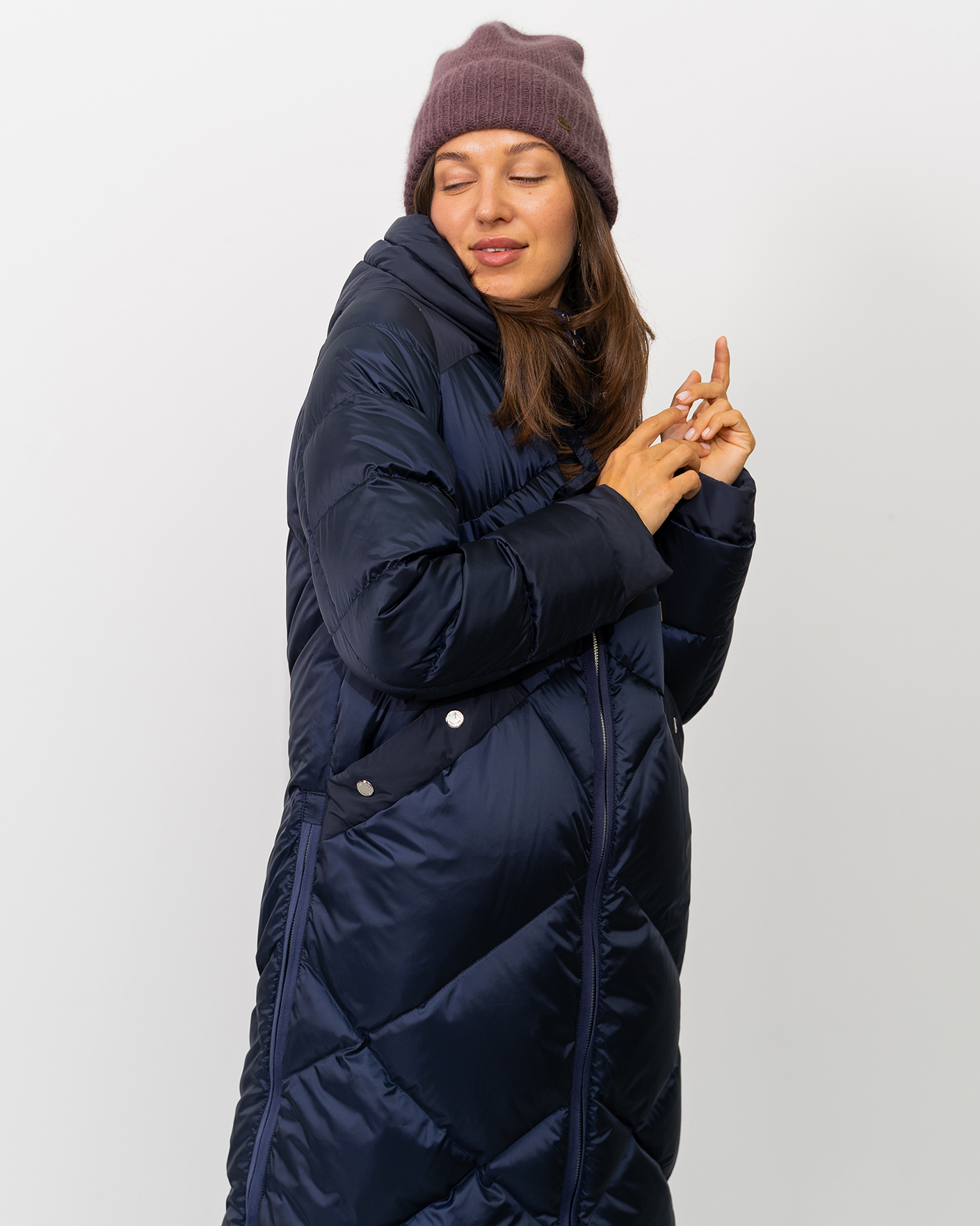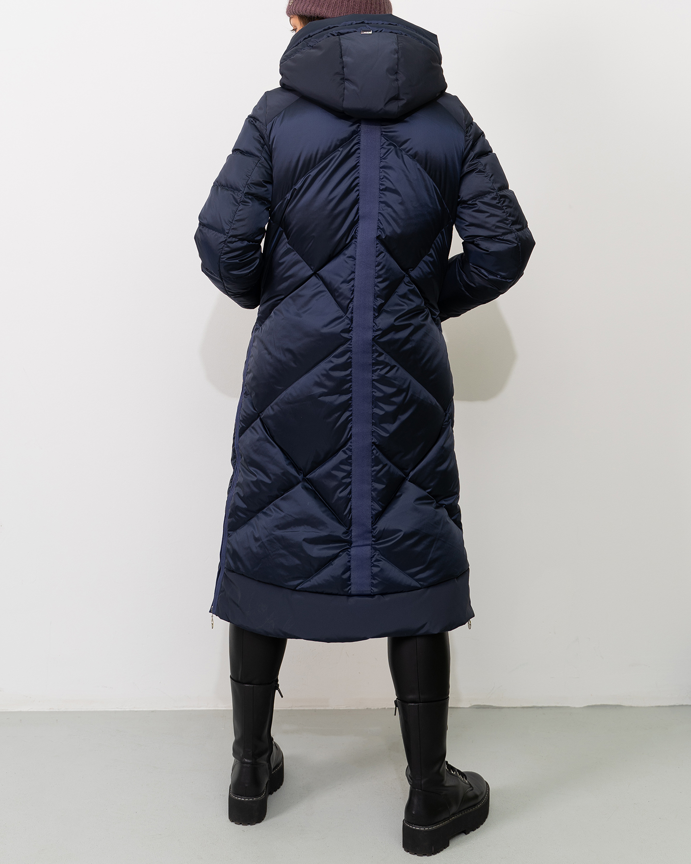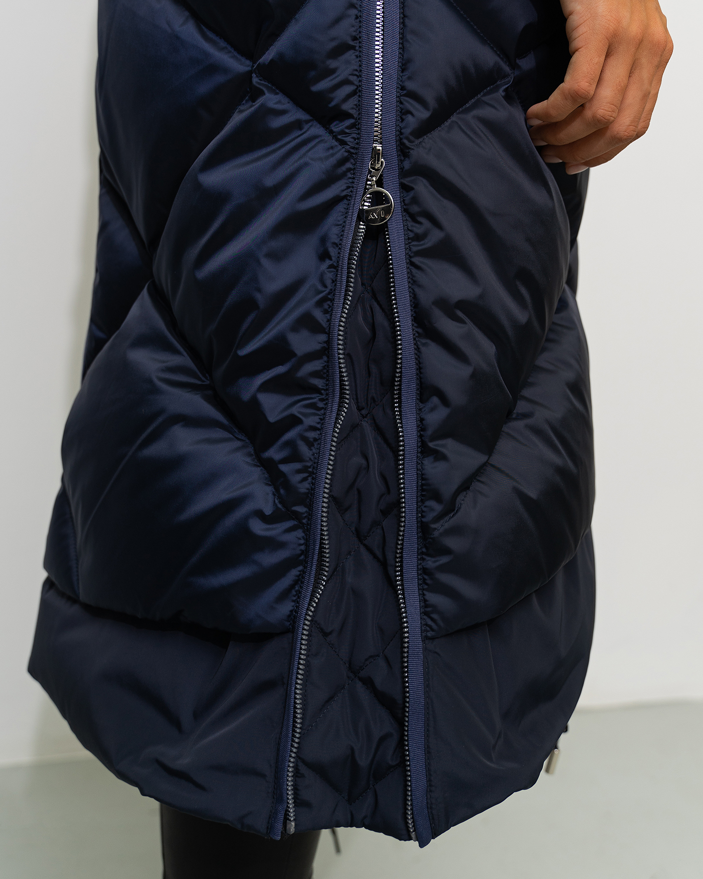 Пуховик AVI темно-синего цвета в геометрическую стежку. Модель прямого кроя, длины миди. Фиксированный капюшон со вставным шнурком и воротник-стойка отлично защищают от сильного ветра. Застежка на молнию, имеются врезные, диагональные карманы на клепках. Ширина низ регулируется с помощью вставной резинки и боковых разрезом на молнии. Теплый и стильный пуховик станет идеальным спутником в холодное время года.