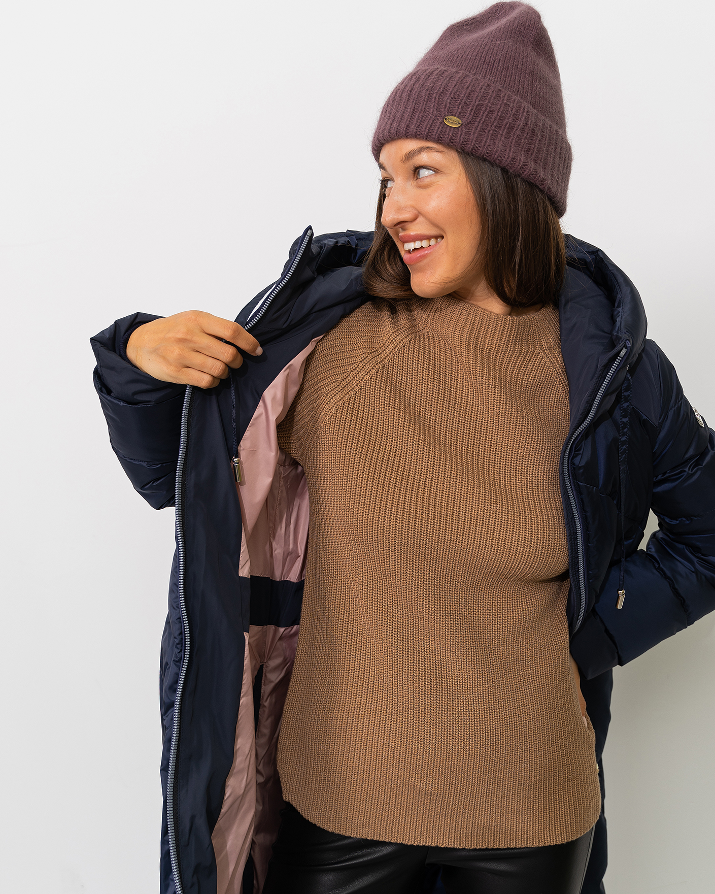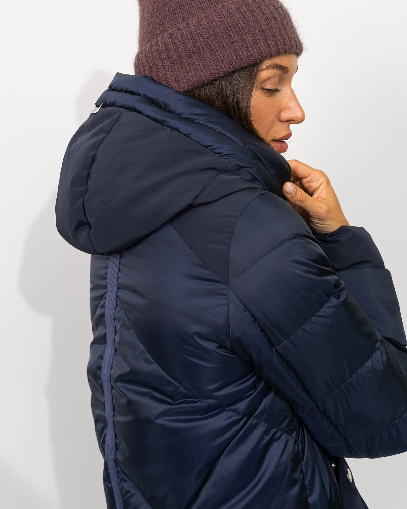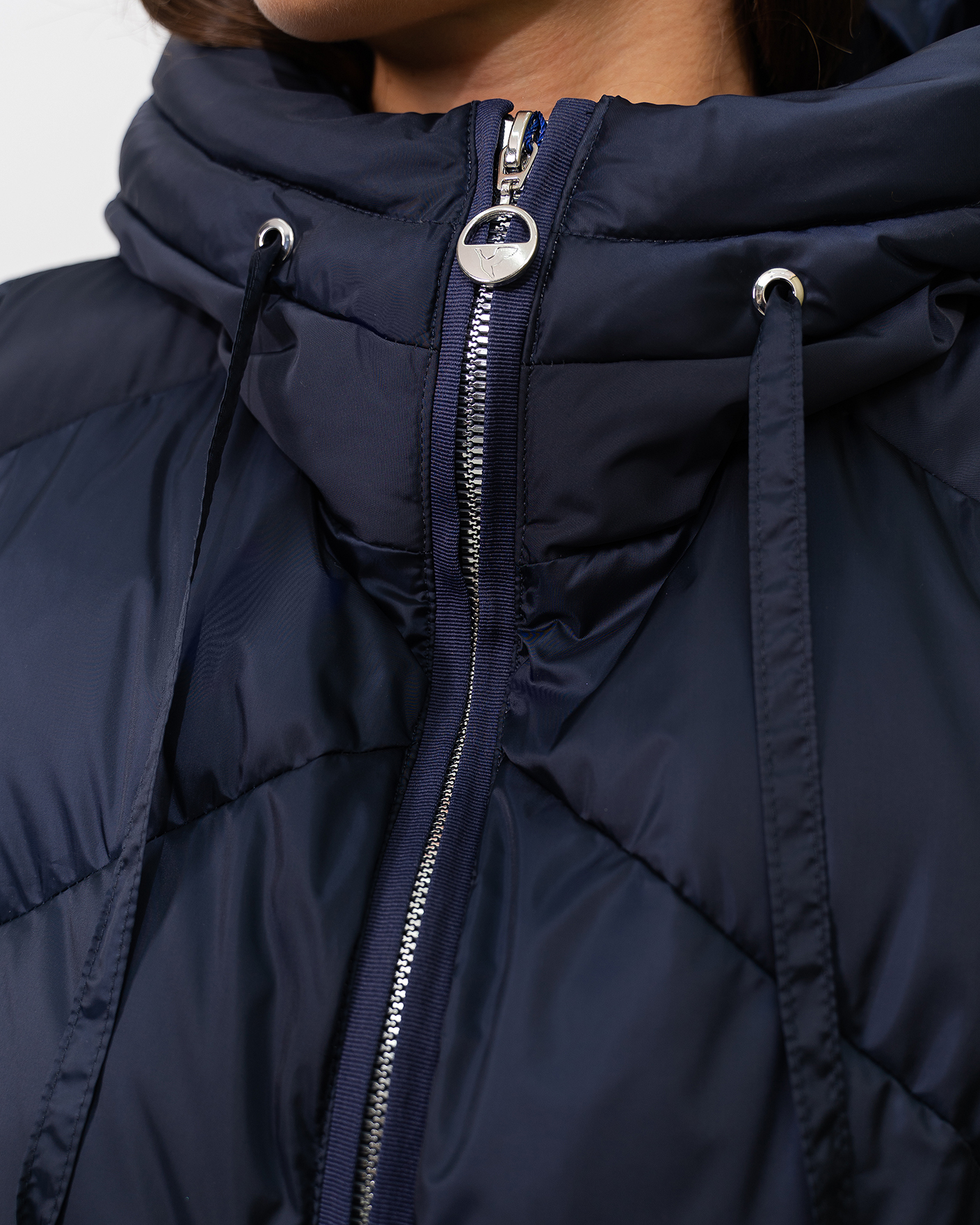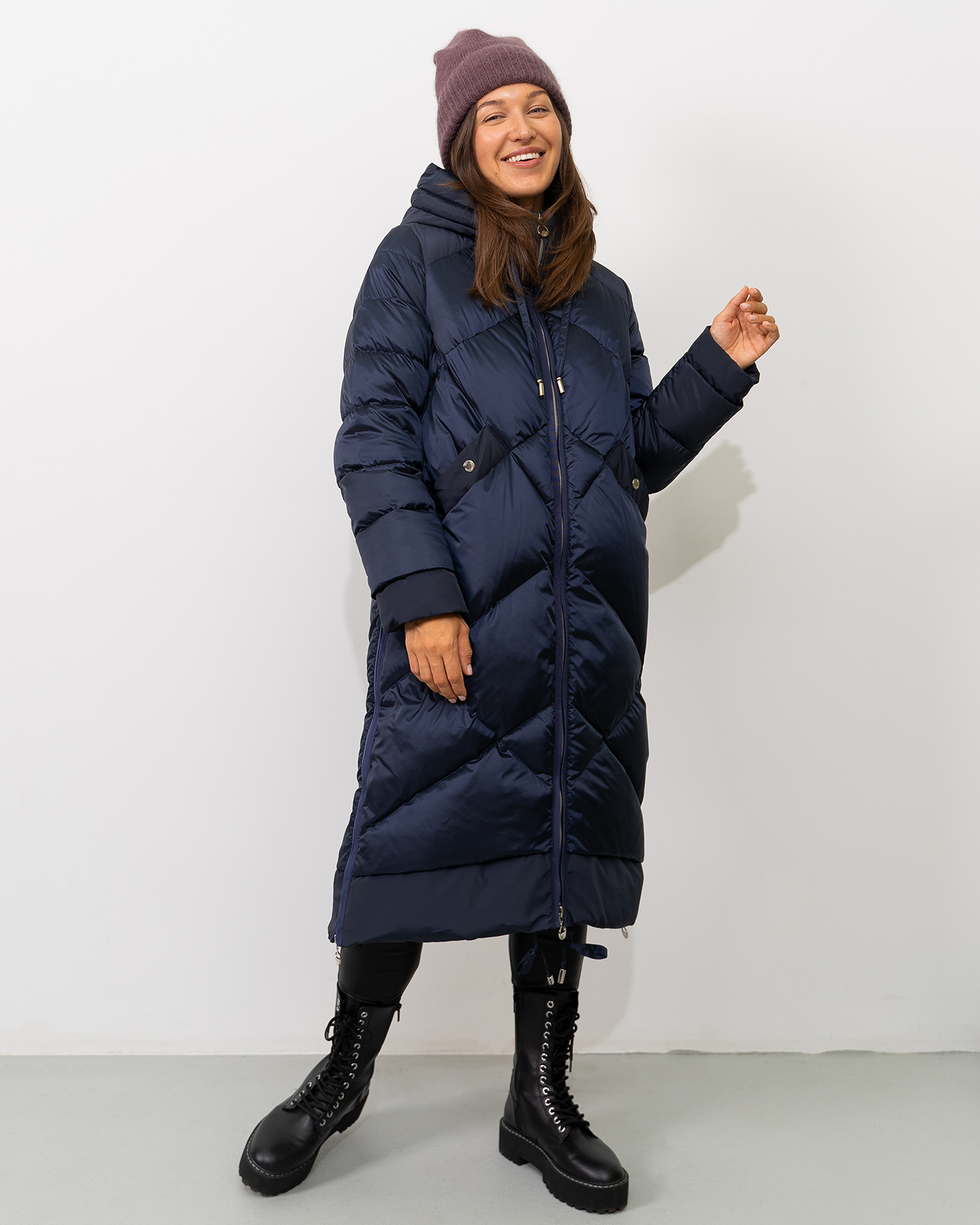 Пуховик AVI темно-синего цвета в геометрическую стежку. Модель прямого кроя, длины миди. Фиксированный капюшон со вставным шнурком и воротник-стойка отлично защищают от сильного ветра. Застежка на молнию, имеются врезные, диагональные карманы на клепках. Ширина низ регулируется с помощью вставной резинки и боковых разрезом на молнии. Теплый и стильный пуховик станет идеальным спутником в холодное время года.