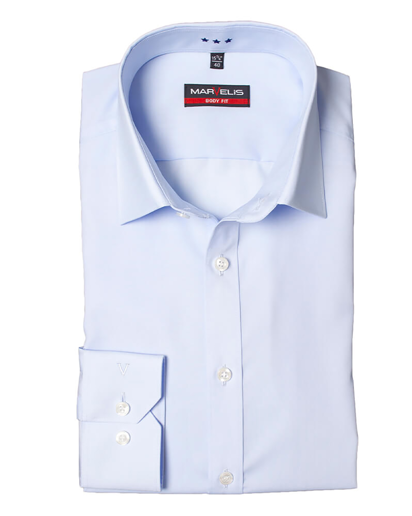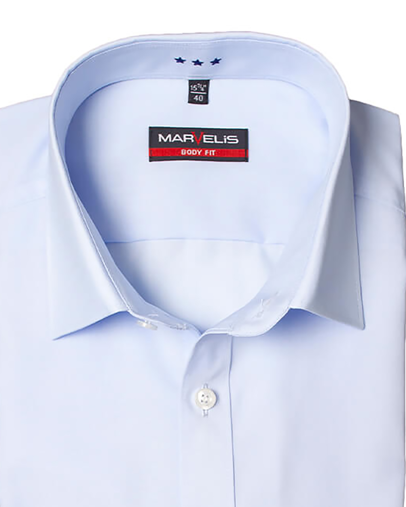 Классическая рубашка Marvelis Body Fit светло-голубого цвета с воротником New York Кент. Сшитая по фигуре деловая рубашка из 100% хлопка для максимального комфорта.