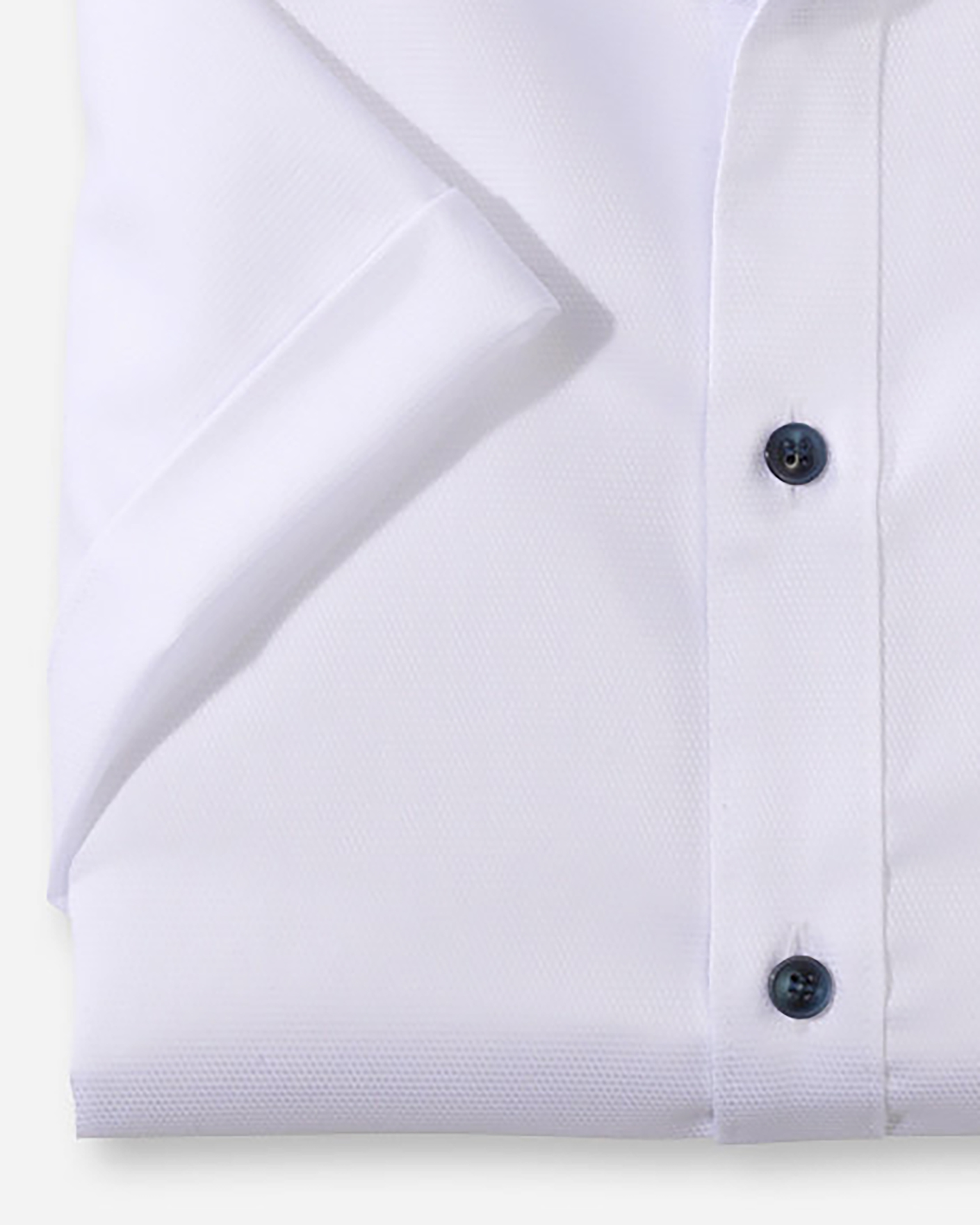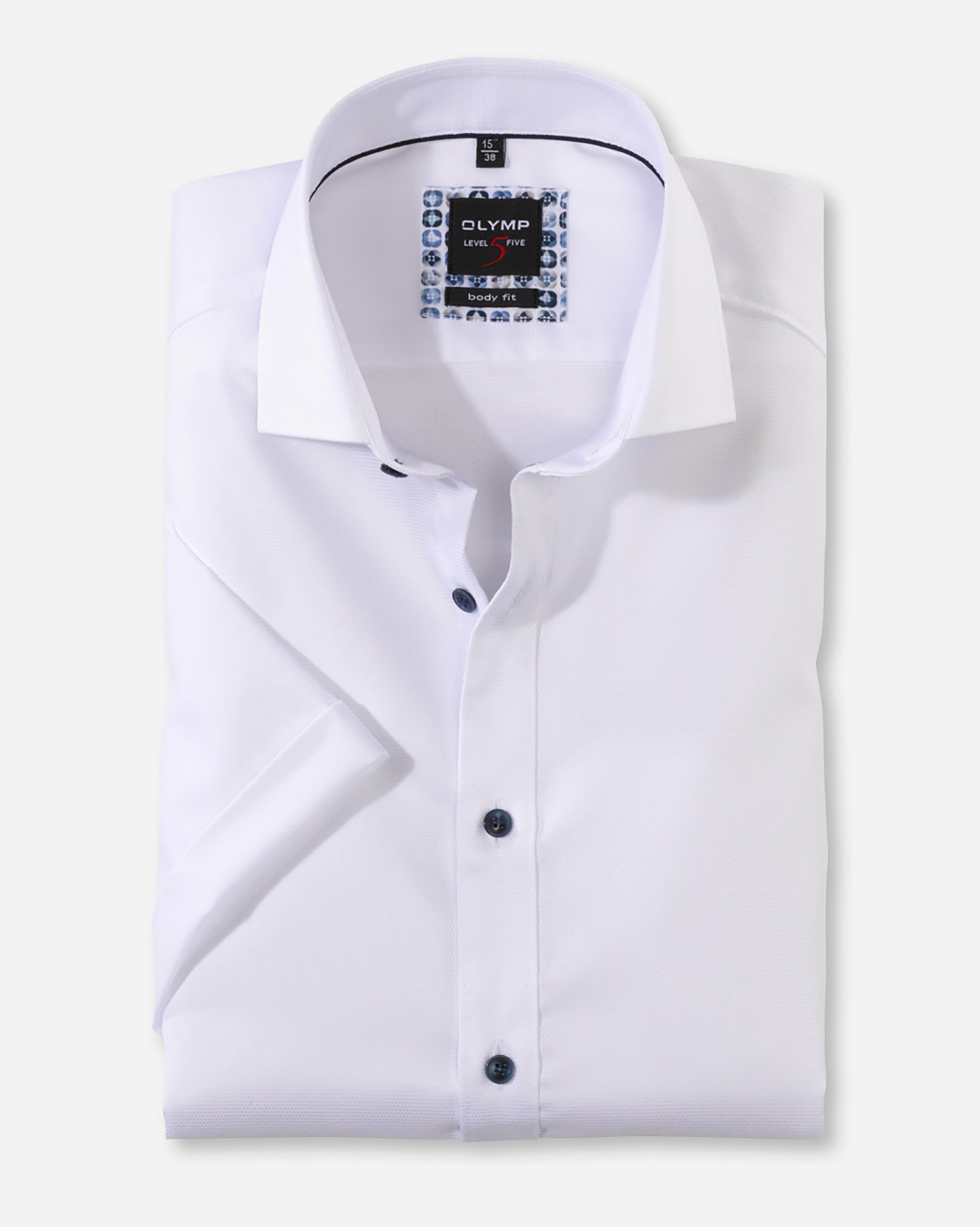 Классическая белая рубашка OLYMP Level Five с короткими рукавами на контрастных пуговицахМодная динамика спортивного облегающего силуэта и стильный воронтик позволяет носить данную модель с галстуком и без.