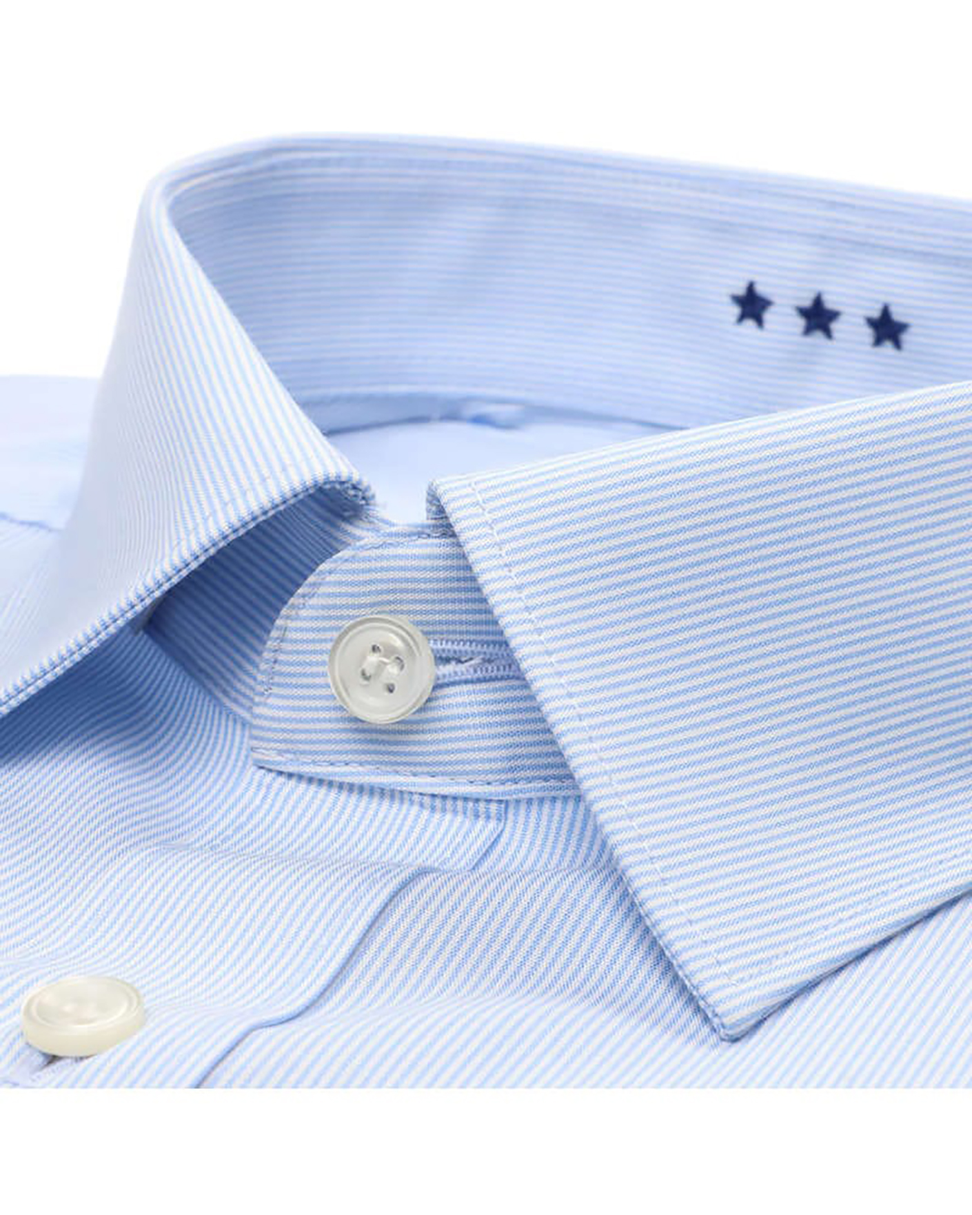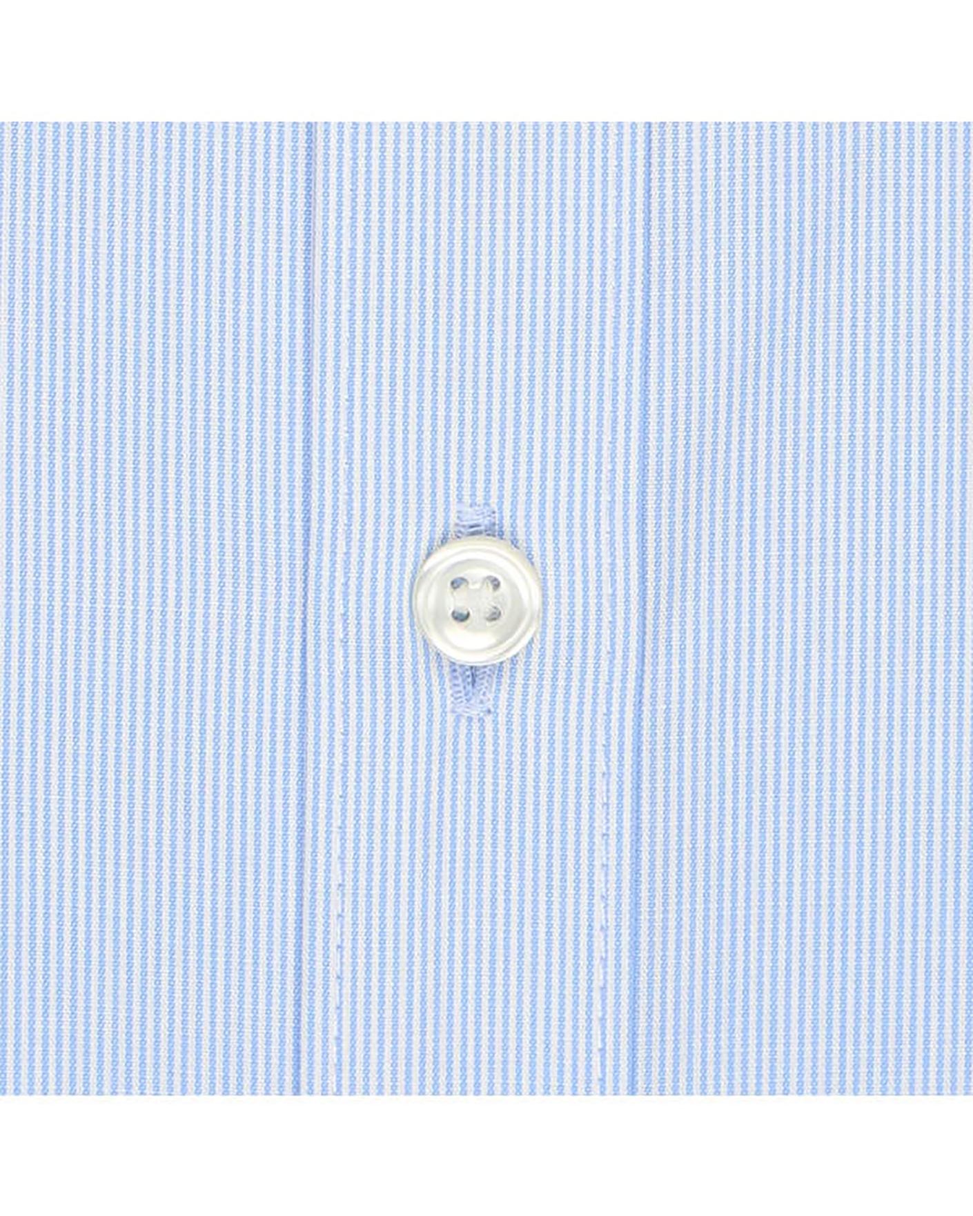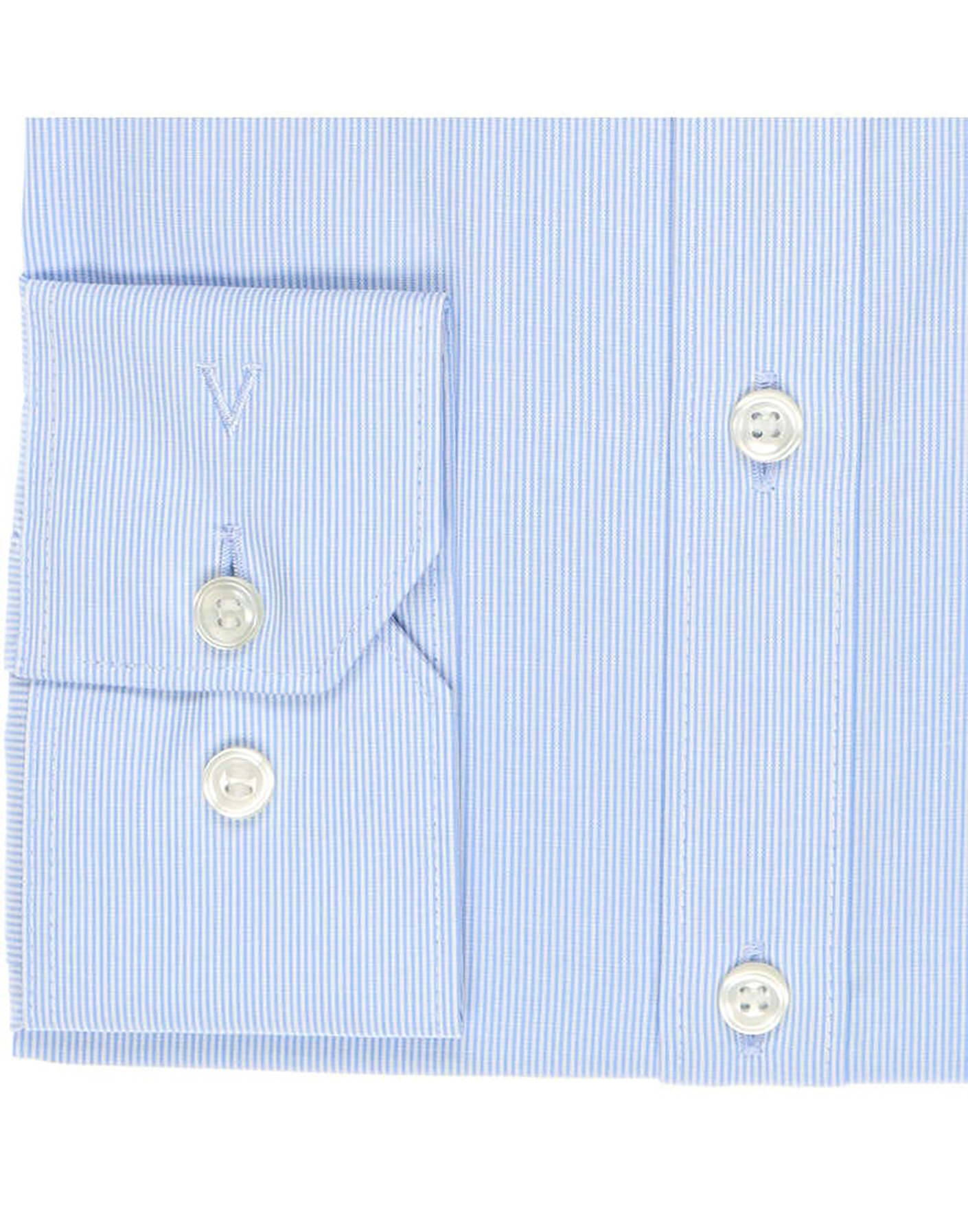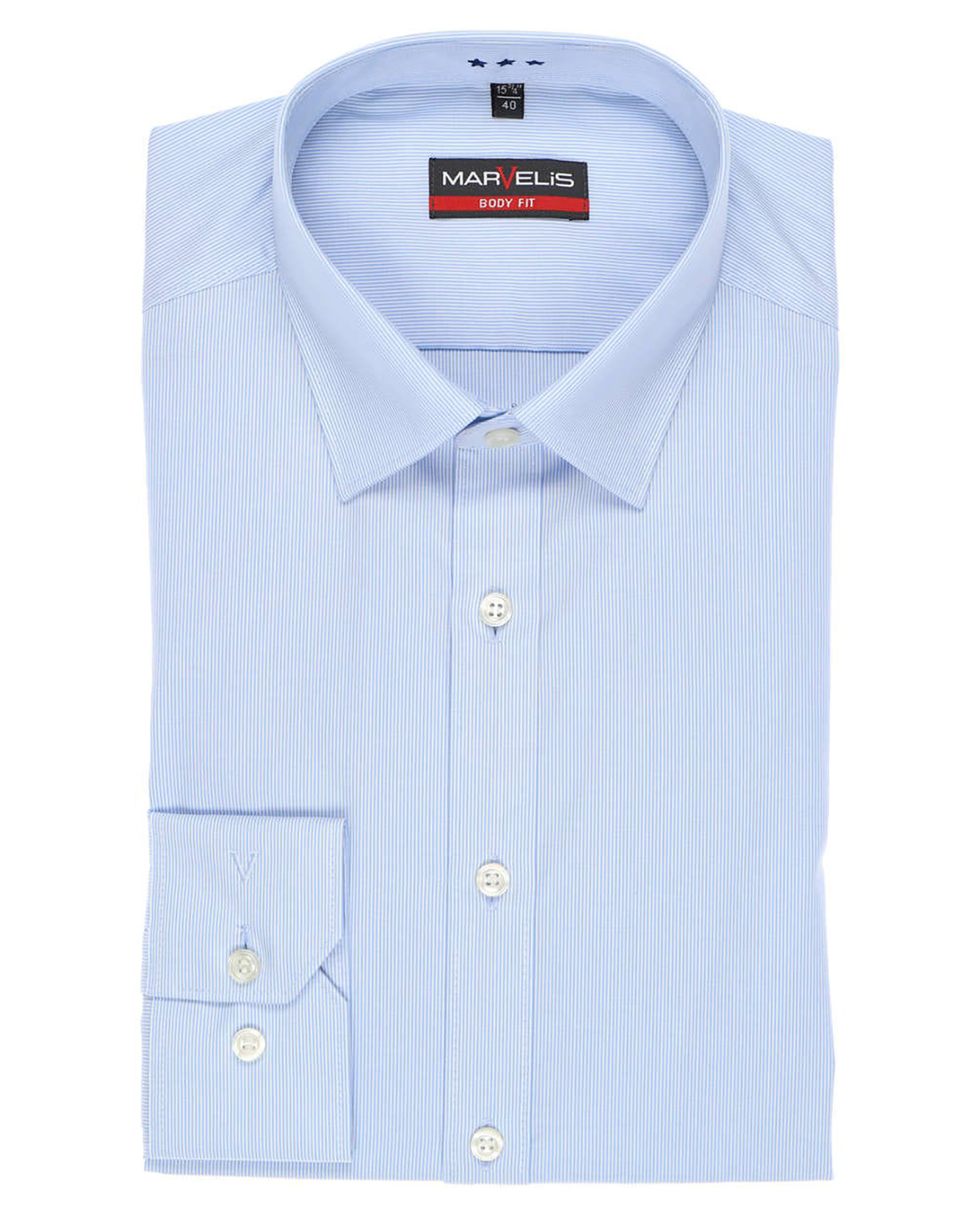 Рубашка комфортного кроя Marvelis Body Fit светло-голубого цвета в тонкую вертикальную полосу. Рубашка из 100% хлопка с идеальной посадкой, выдерживает все активные рабочие будни, не потеряв своей формы.