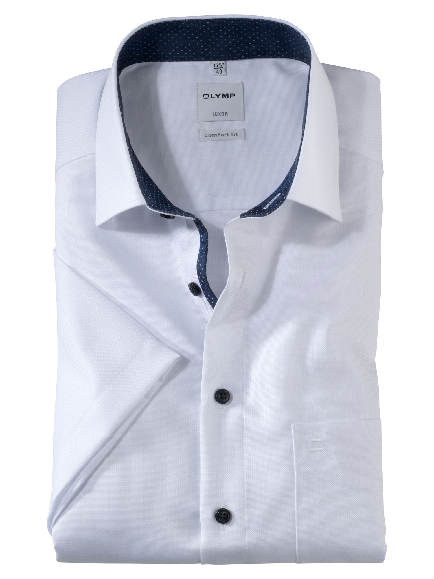 Классическая рубашка OLYMP Luxor Comfort Fit белого цвета с коротким рукавом и контрастной внутренней отделкой воротника и планки на пуговицах. Хлопковая рубашка - универсальная вещь Вашего повседневного гардероба.