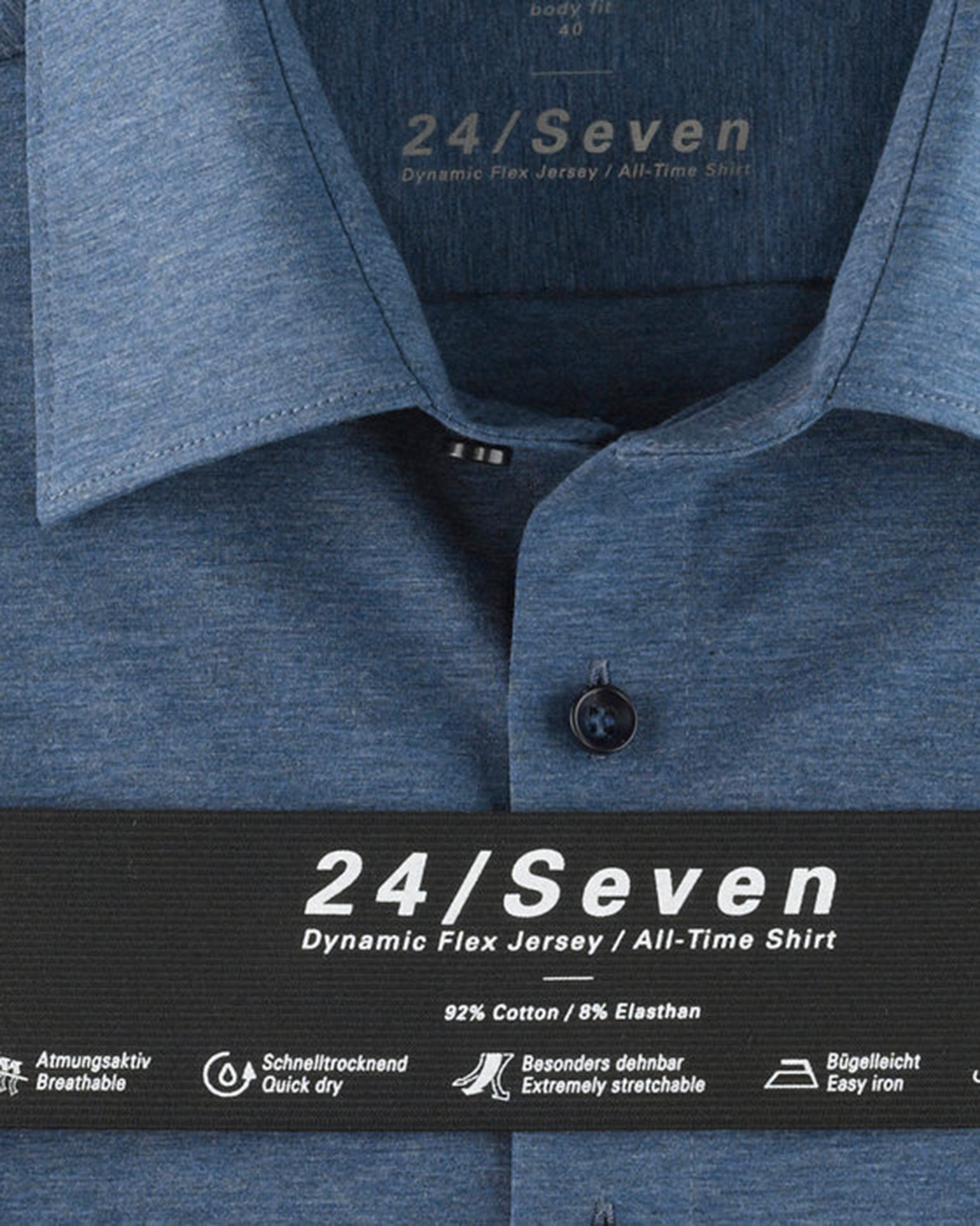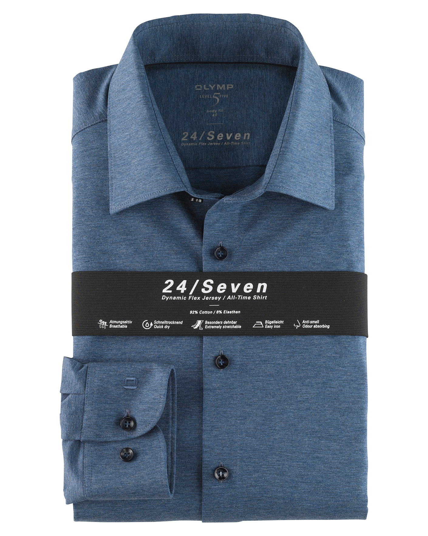 Культовая рубашка OLYMP Level Five 24 / Seven Dynamic Flex Jersey All Time. Современный воротник New York Kent, идеальная плотная посадка. Рубашка сочетается с костюмом, курткой или джинсами.