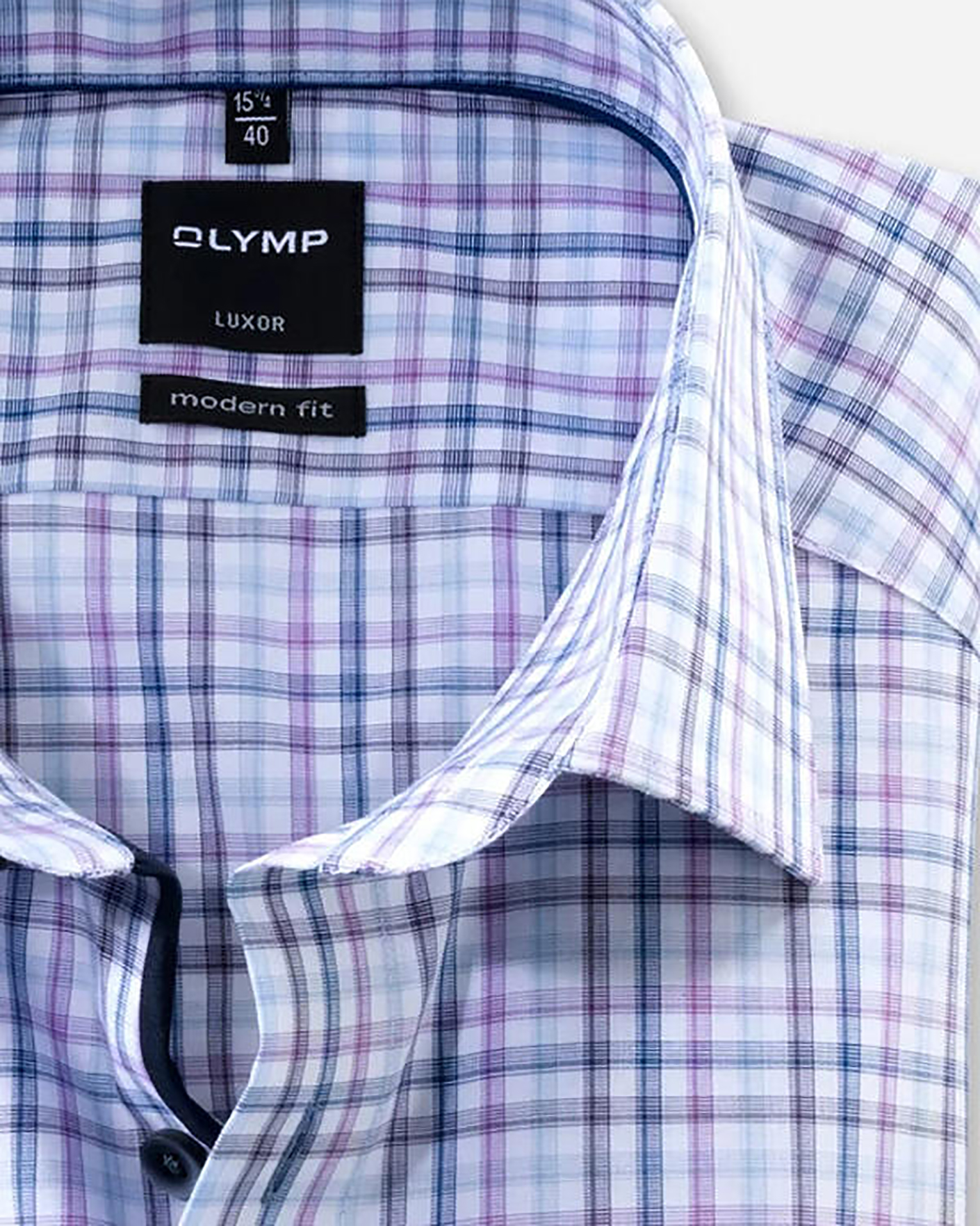 Рубашка OLYMP Luxor Modern Fit розово-голубого цвета в мульти-клетку. 100% хлопок, воротник New Kent и контрастной планкой на пуговицах темно-синего цвета. Рубашка - идеальный компаньон в течение всего рабочего дня