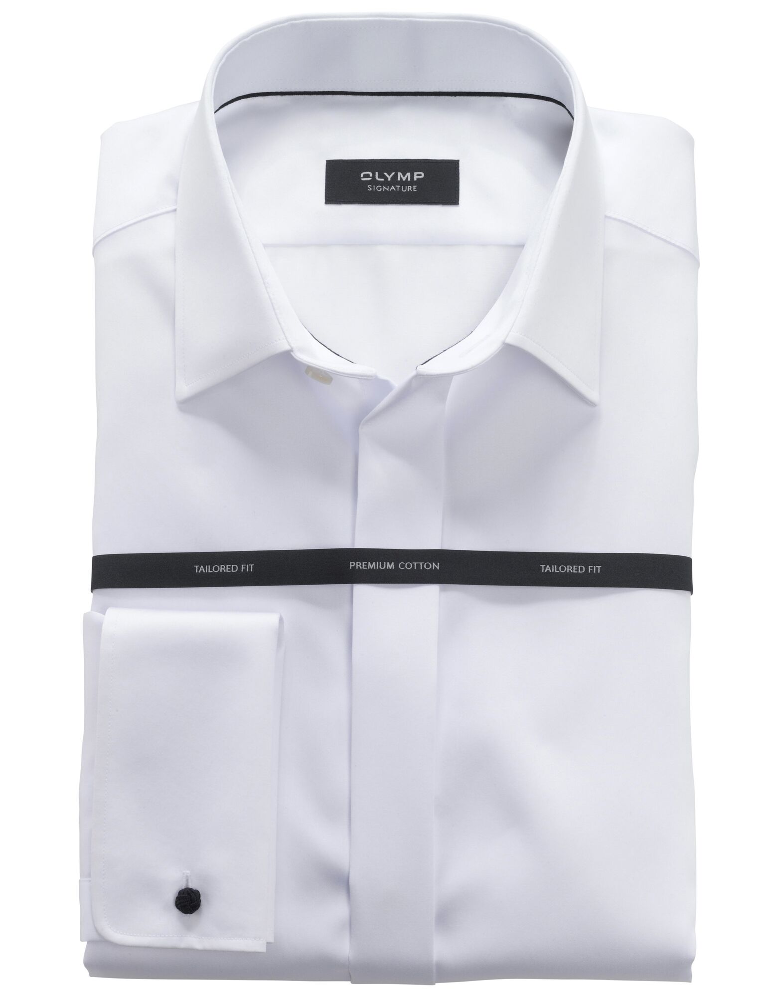 Рубашка OLYMP Signature белого цвета из тонкой атласной ткани высшего качества и идеальной посадкой. Мелкие детали, такие как сшитые вручную швы, петли с перламутровым швом и настоящие перламутровые пуговицы. Данная модель придаст Вашему образу элегантность, стиль и индивидуальность.