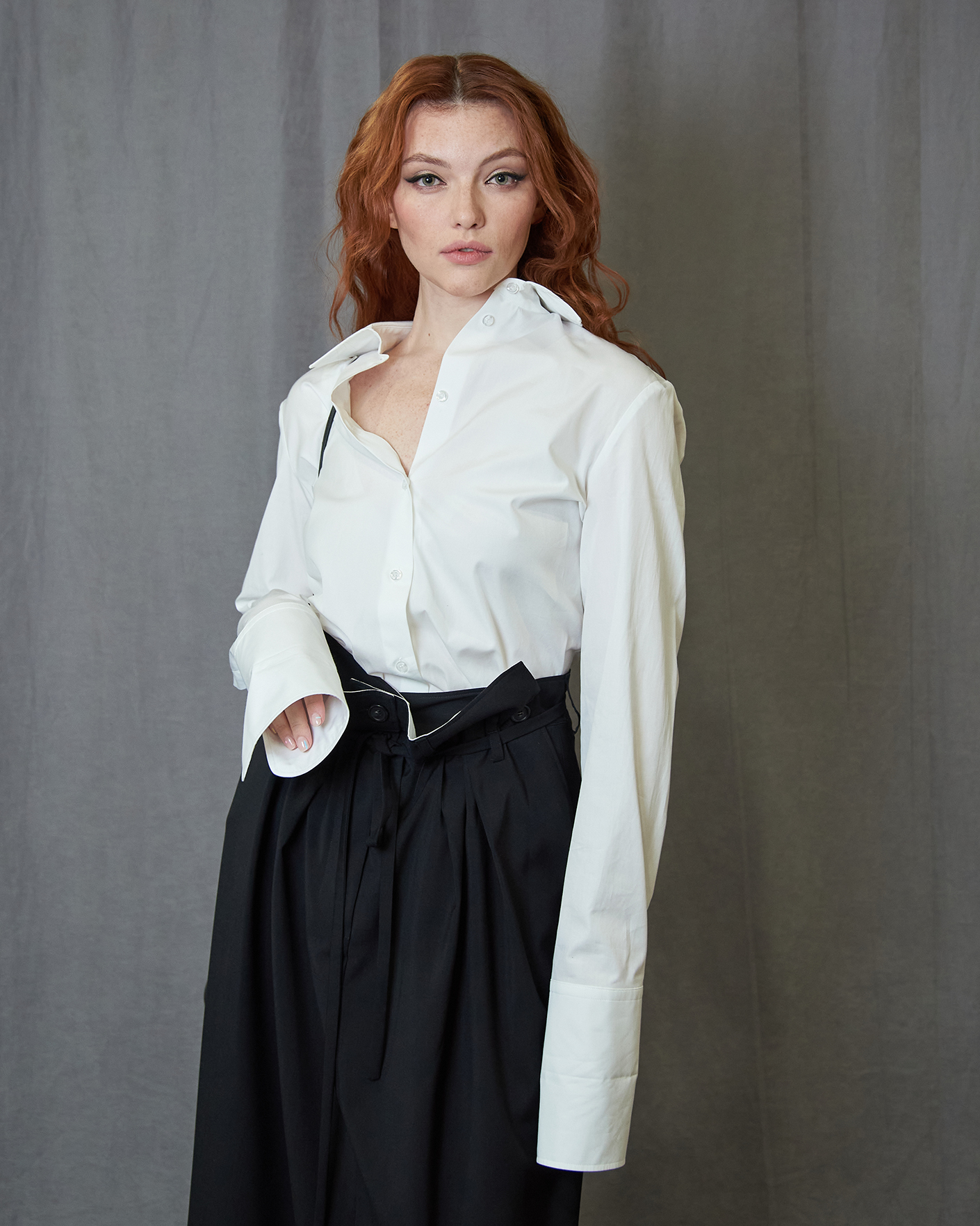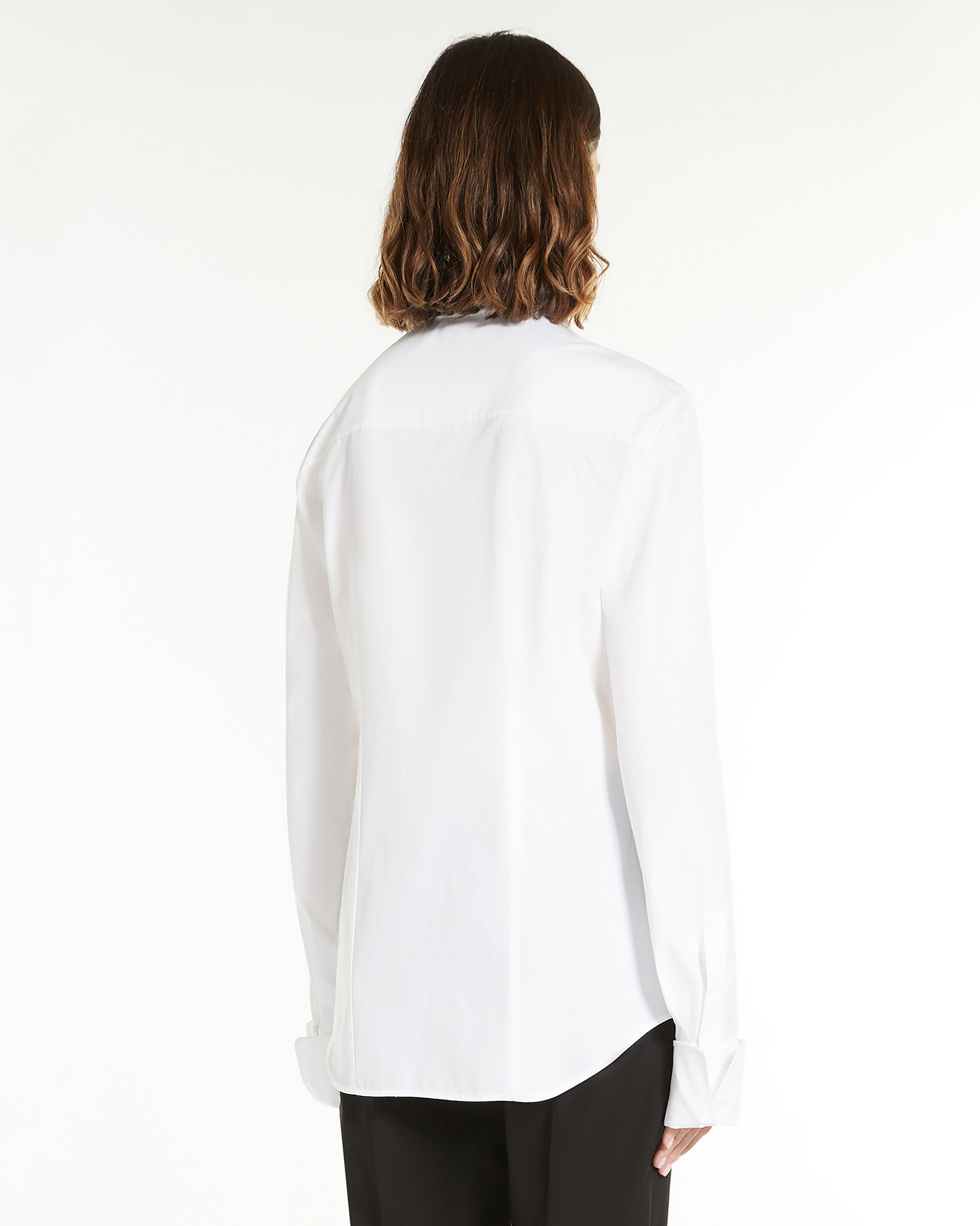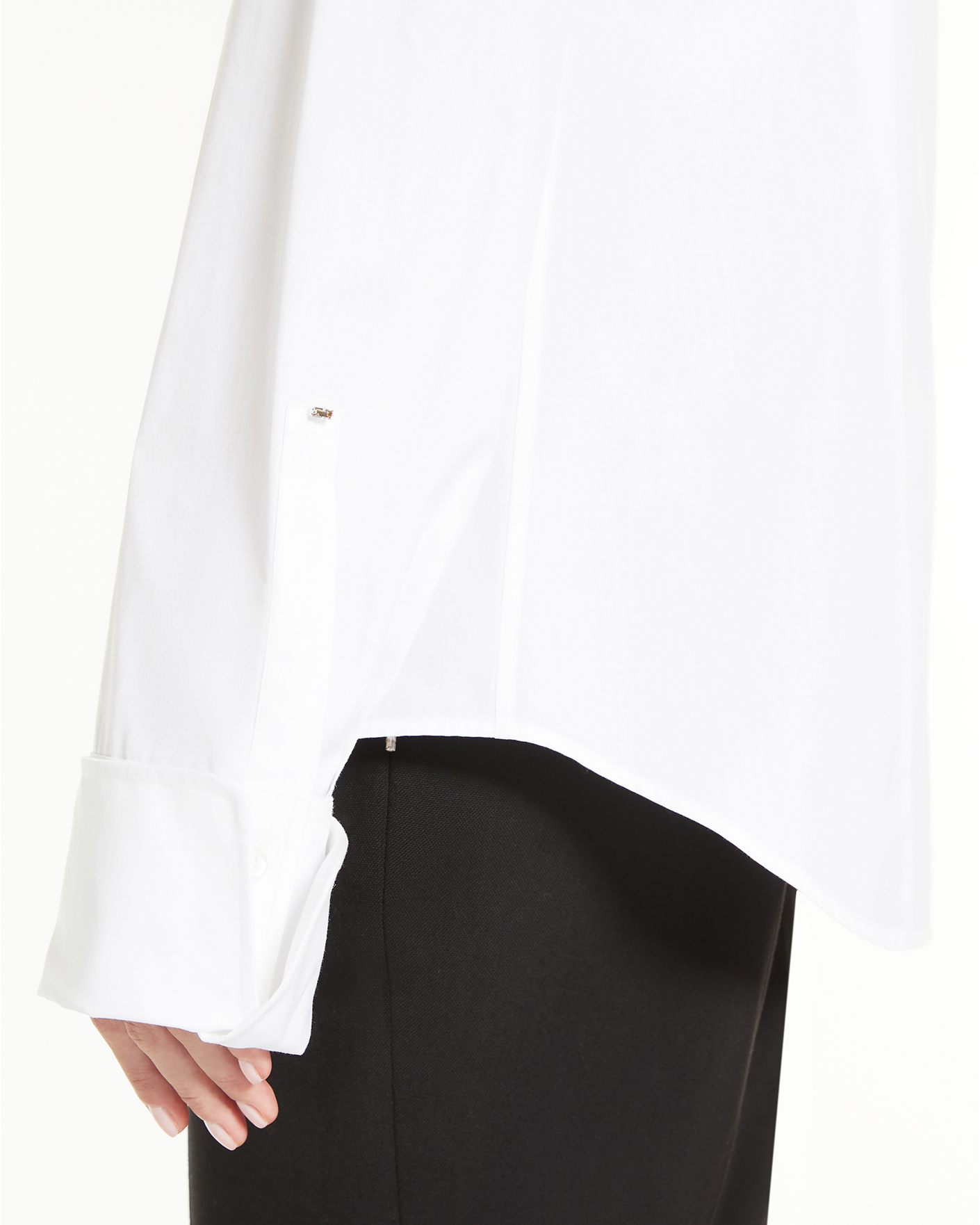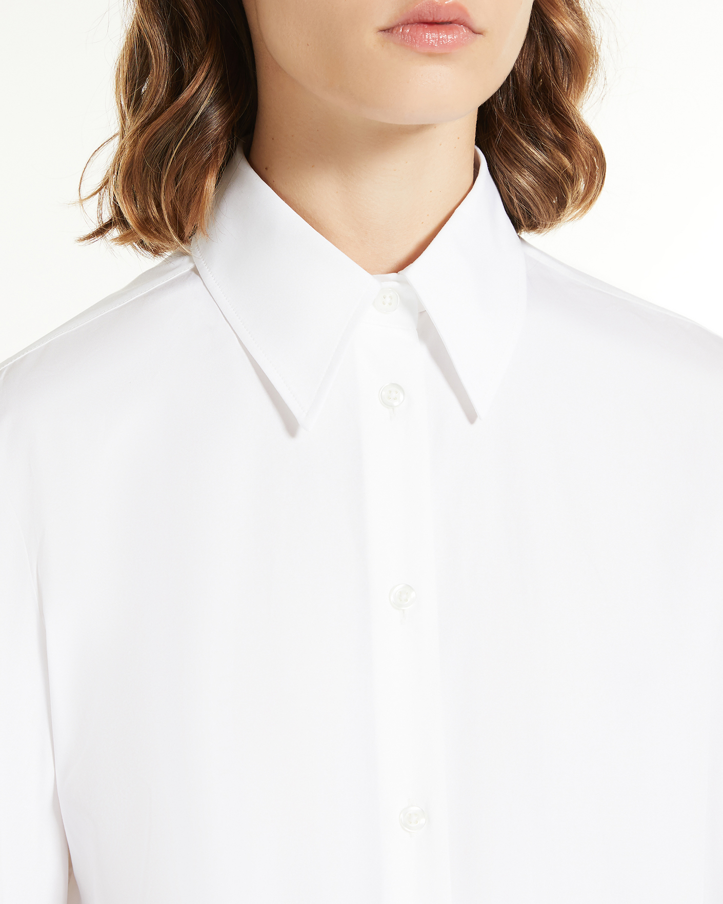 Приталенная рубашка Sportmax белого цвета выполнена из 100% хлопка. Модель с острым отложным воротником, планкой на пуговицы в тон и широкими манжетами. Рубашка - базовая вещь вашего гардероба.