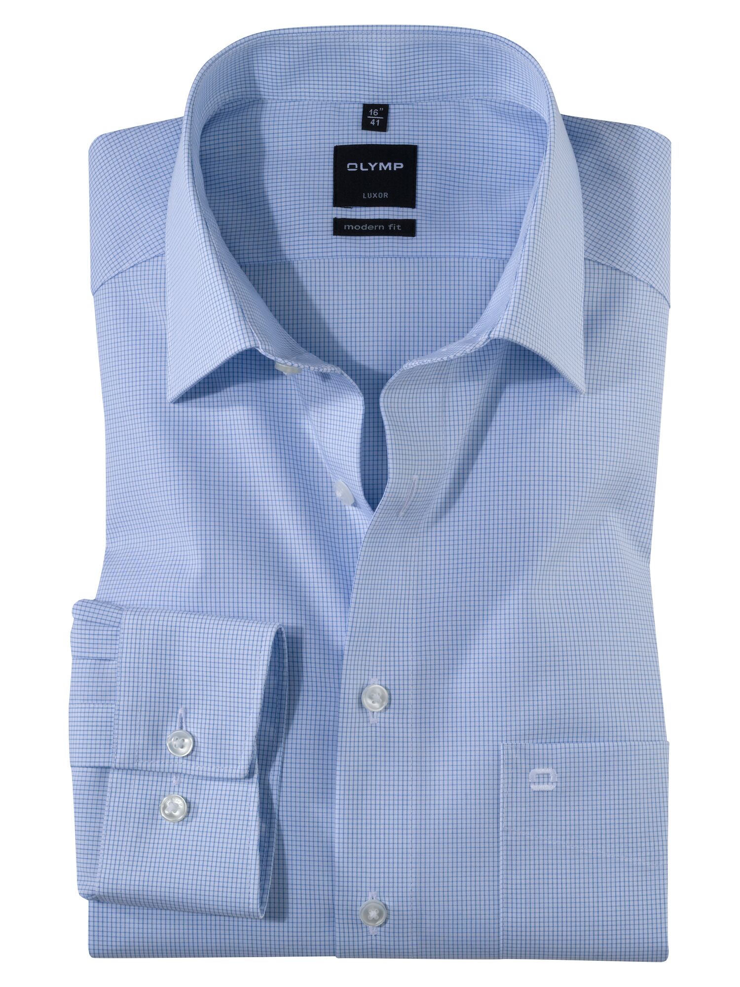 Рубашка OLYMP Luxor Modern светло-голубого оттенка в сетчатый рисунок. Нагрудный накладной карман, элегантный воротник New Kent и регулируемые манжеты. Рубашка станет отличным вариантом для деловых встреч.