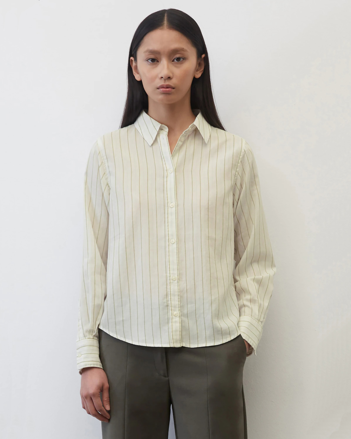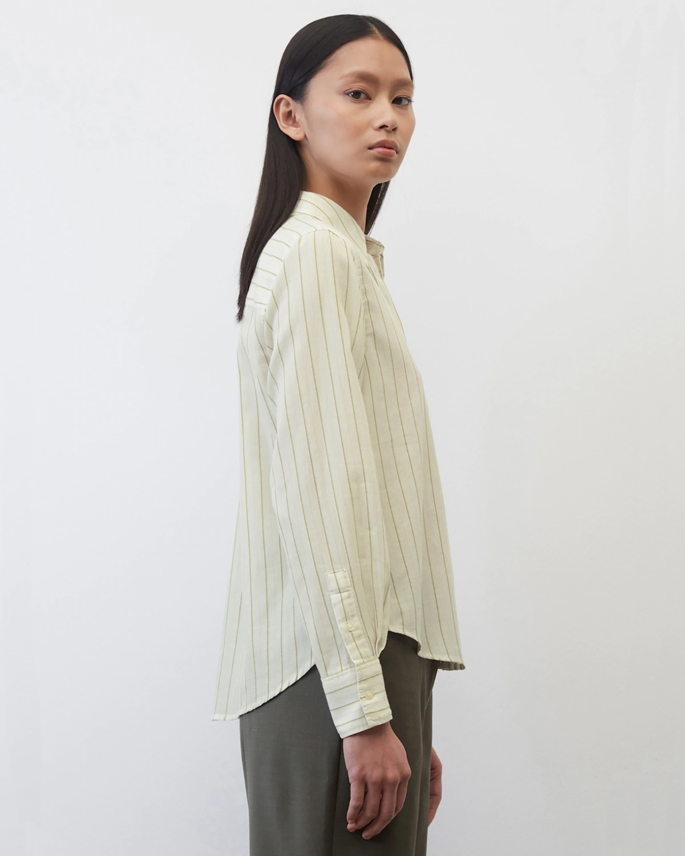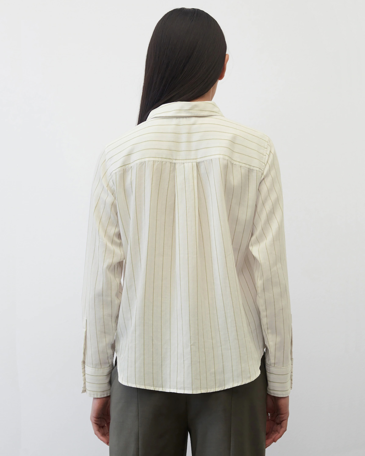 Свободная рубашка Marc O'Polo белого цвета в узкую вертикальную полосу. Модель из 100% хлопка с отложным воротником и планкой на пуговицы. Закругленный низ со слегка удлиненной спинкой. Рубашку можно сочетать с жилетом, жакетом, кардиганом и джемпером.