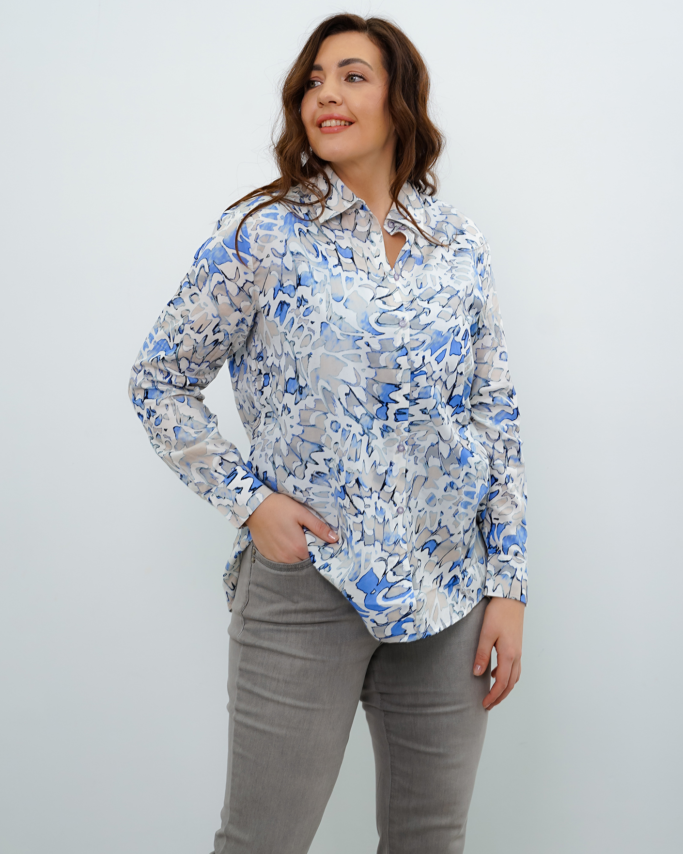 Рубашка Barbara Lebek светло-бежевого цвета в абстрактный рисунок. Модель А-силуэта, отложной воротник, застежка на пуговицы в тон. Рубашку можно сочетать с майкой, джемпером, жилетом, жакетом, кардиганом, юбкой и брюками.