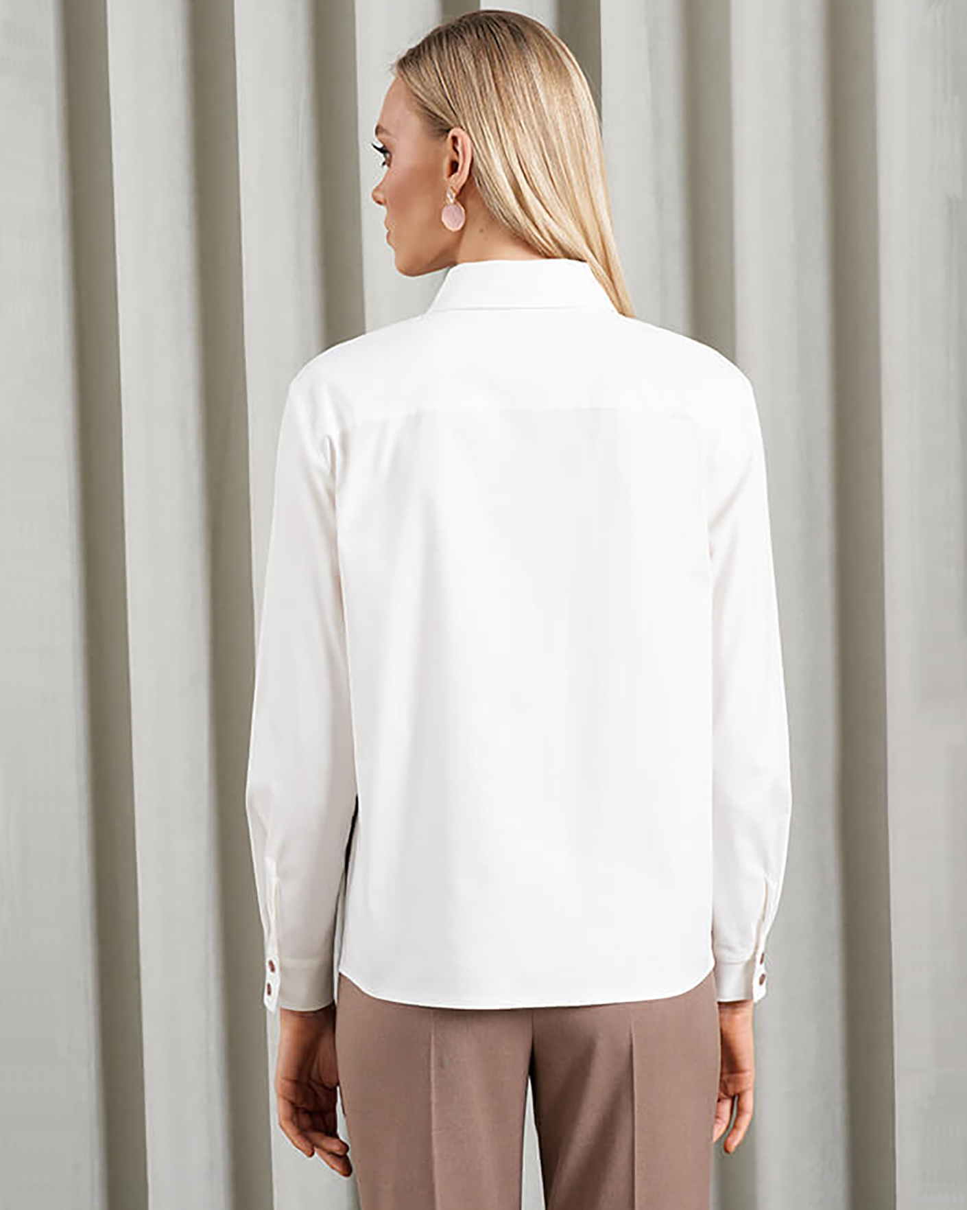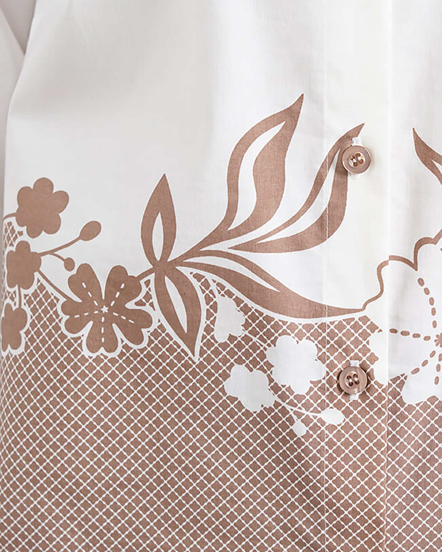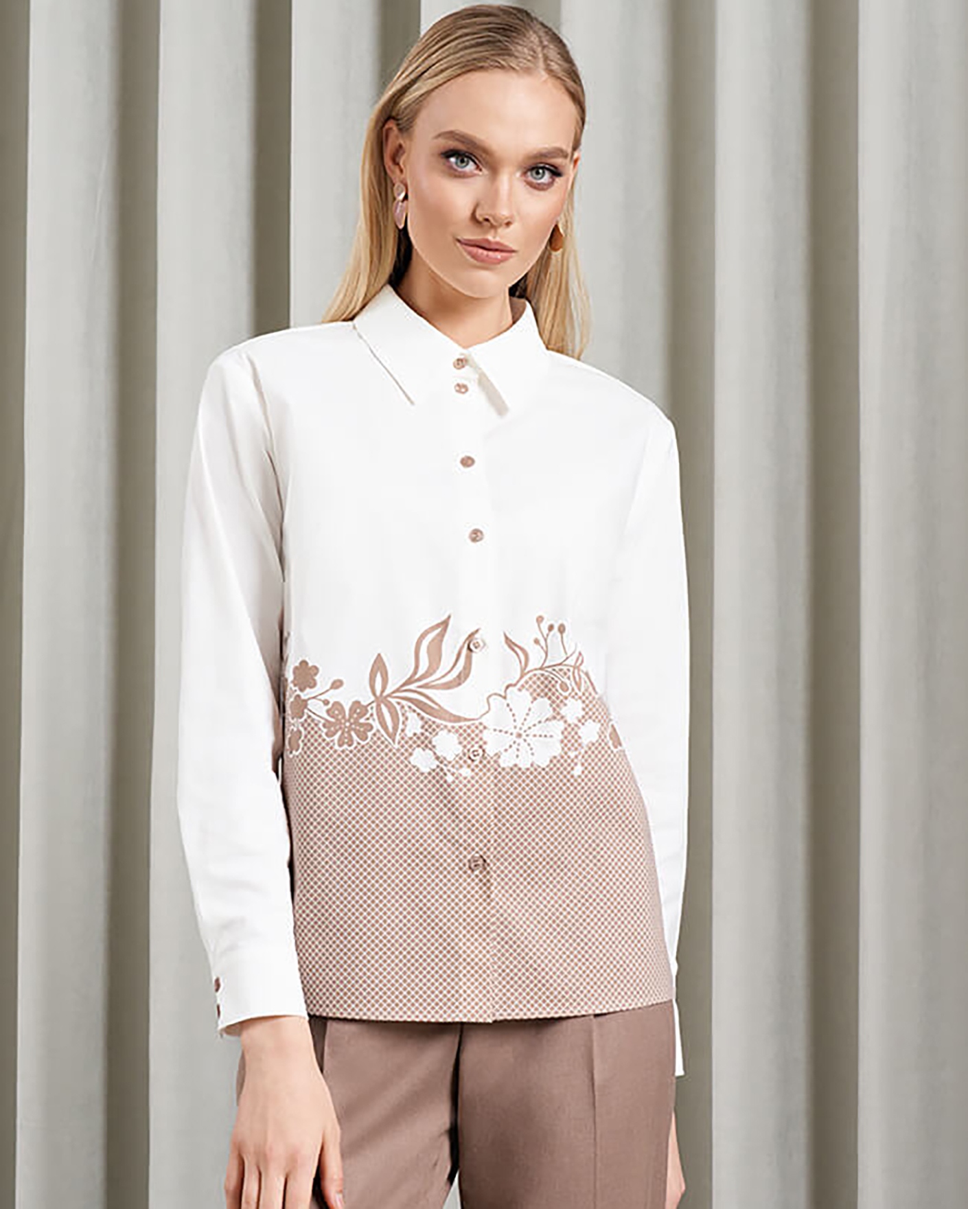 Свободная рубашка Nelva бежево-белого цвета в геометрический и цветочный рисунок по низу. Хлопковая модель с отложным заостренным воротником, застежка на пуговицы бежевого цвета. Рубашка отлично впишется в ваш гардероб.