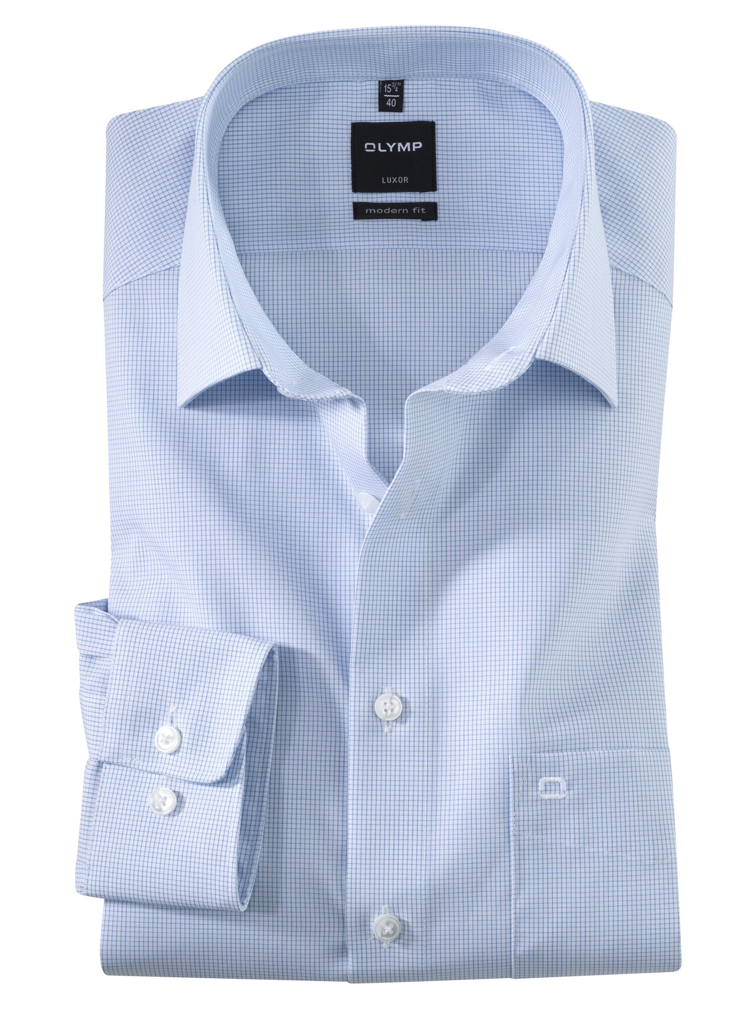 Голубая рубашка OLYMP Luxor Modern с длинными рукавами, с элегантным воротником New Kent, накладным нагрудным карманом и регулируемыми комбинированными манжетами. Рубашка дополнит любой Ваш деловой образ.