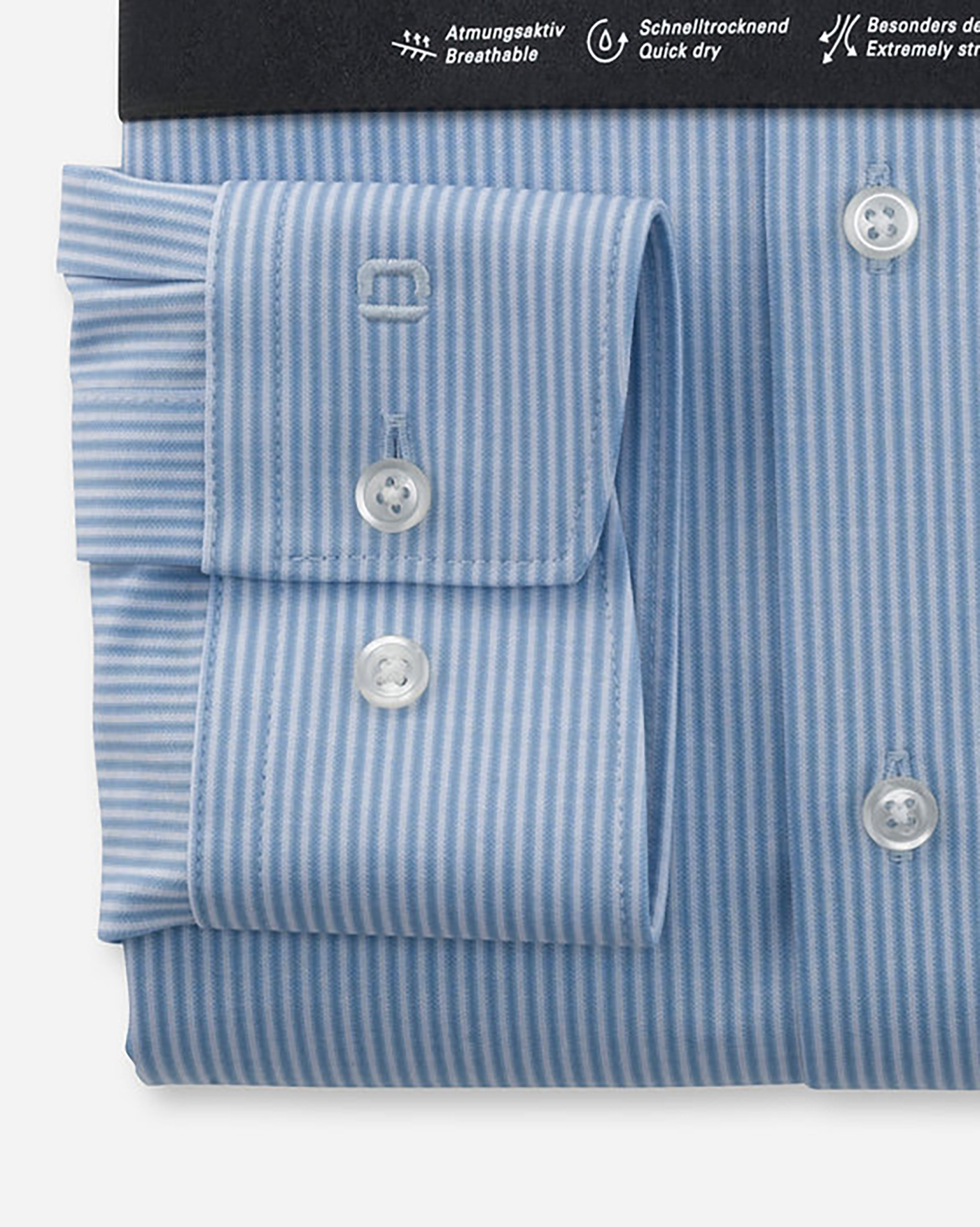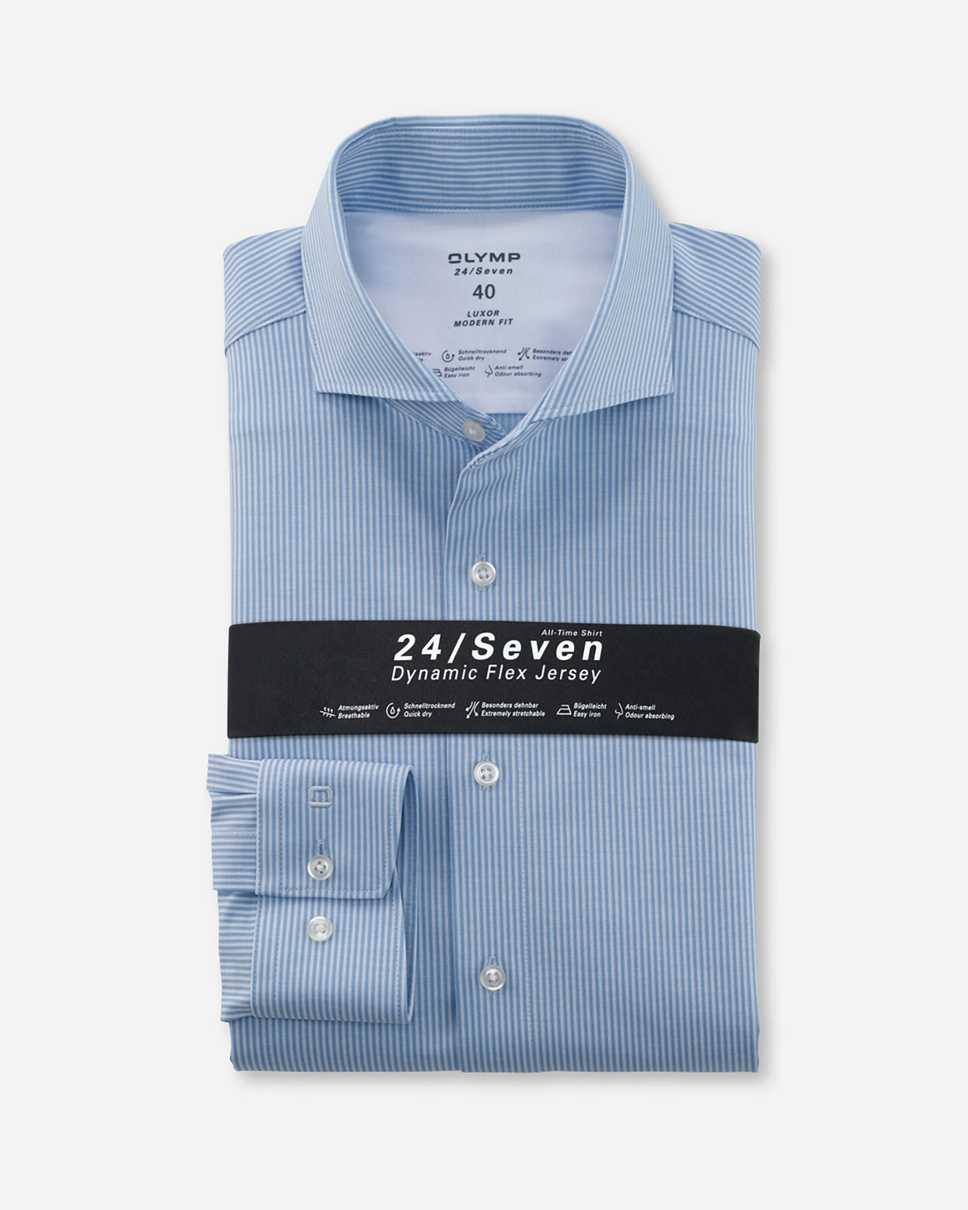 Деловая рубашка Olymp Luxor голубого цвета в узкую вертикальную полосу. Модель с акульим воротником и планкой на белые пуговицы. Устойчивое сочетание волокон хлопка и эластана обеспечивает непревзойденную гладкость, сверхмягкость, приятный для кожи комфорт при ношении и убедительную устойчивость к сминанию в сочетании с практичной простотой ухода.