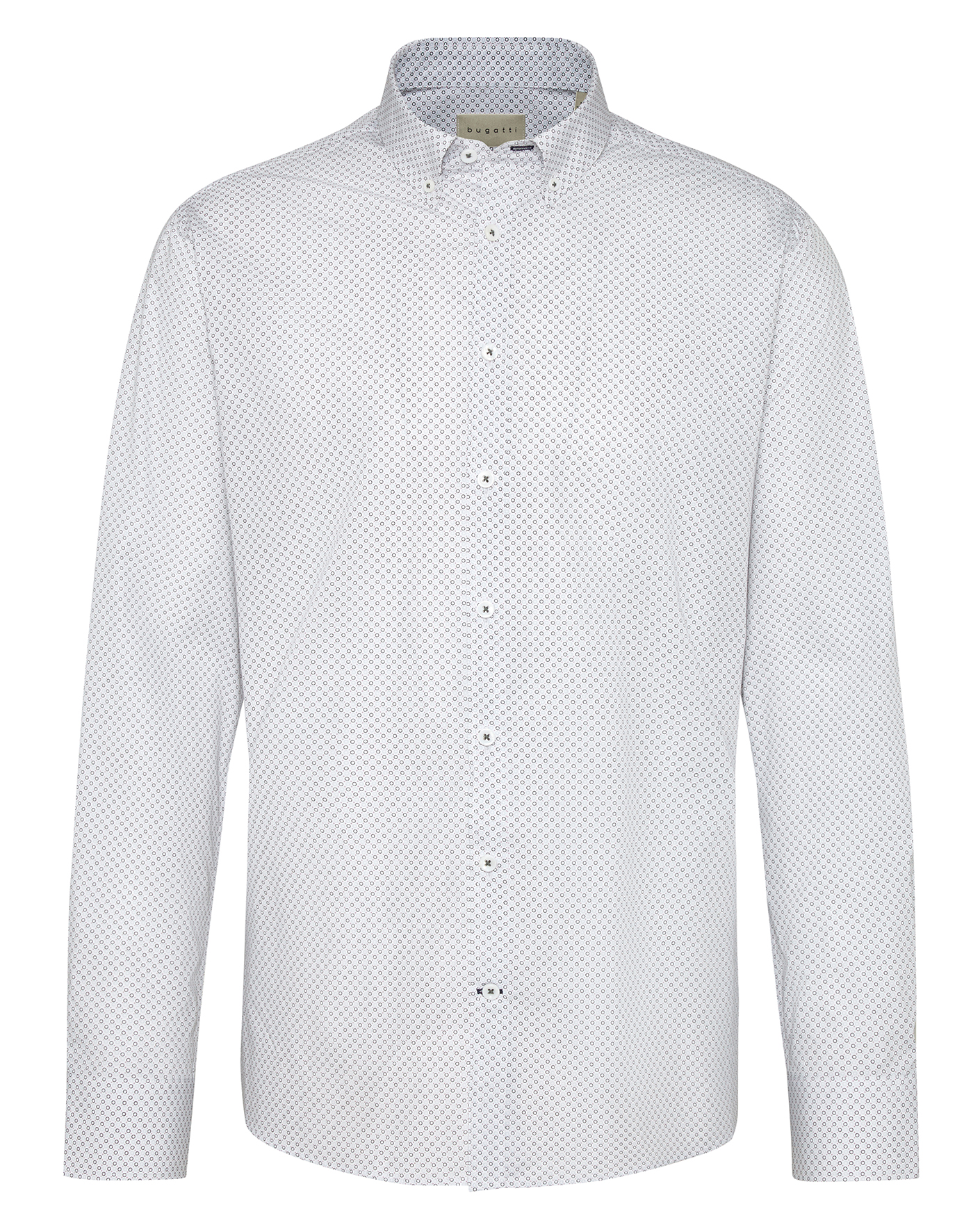 Классическая рубашка Bugatti оливково-белого цвета в мелкий рисунок. Модель из 100% хлопка с воротником Button-Down и планкой на пуговицы в тон. Рубашка - идеальный спутник для успешного бизнеса.