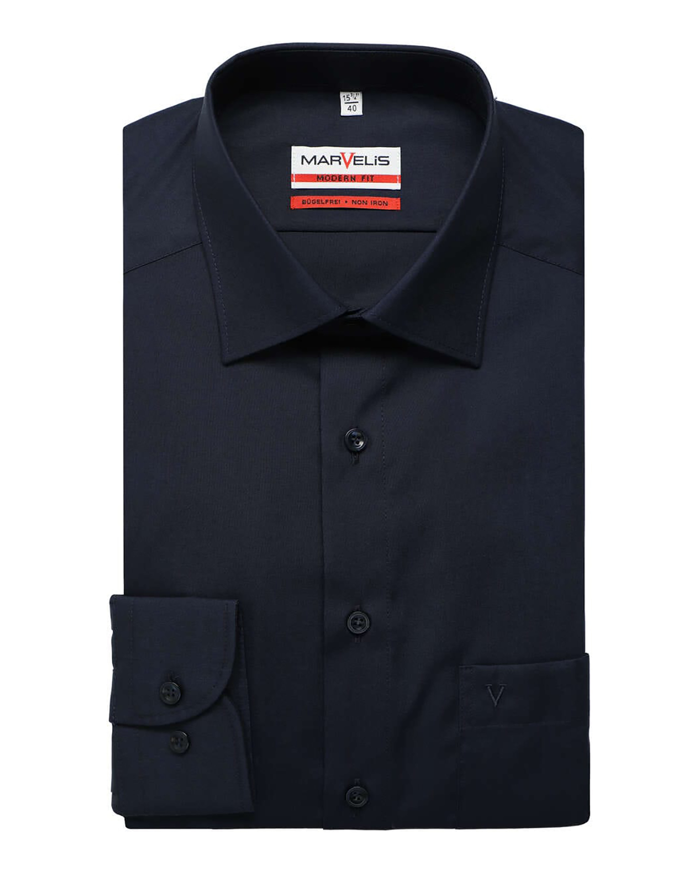 Рубашка комфортного кроя Marvelis Modern Fit темно-синего цвета. Рубашка из 100% хлопка с идеальной посадкой, выдерживает все активные рабочие будни, не потеряв своей формы.
