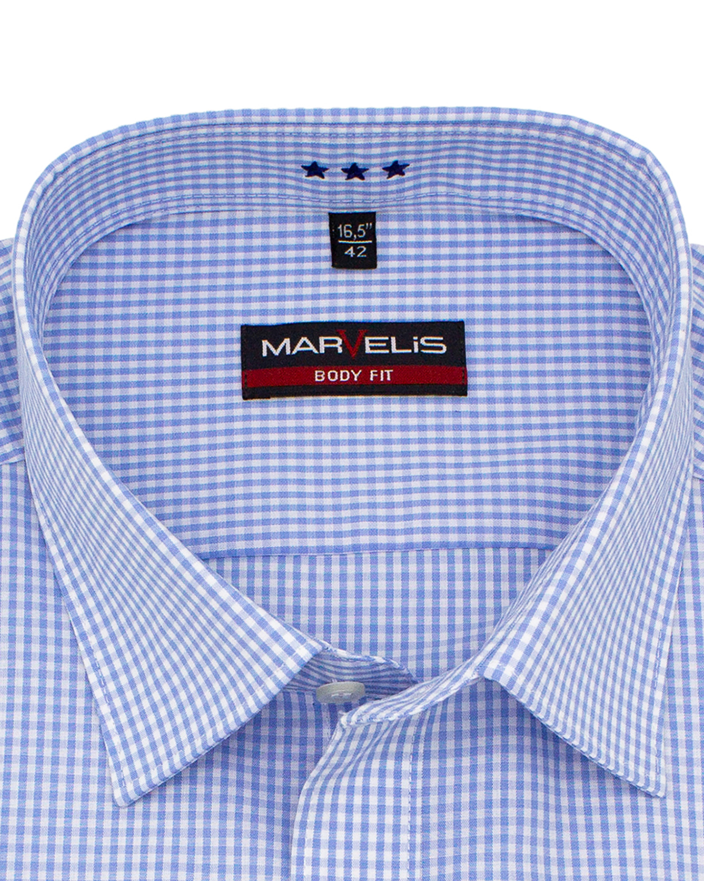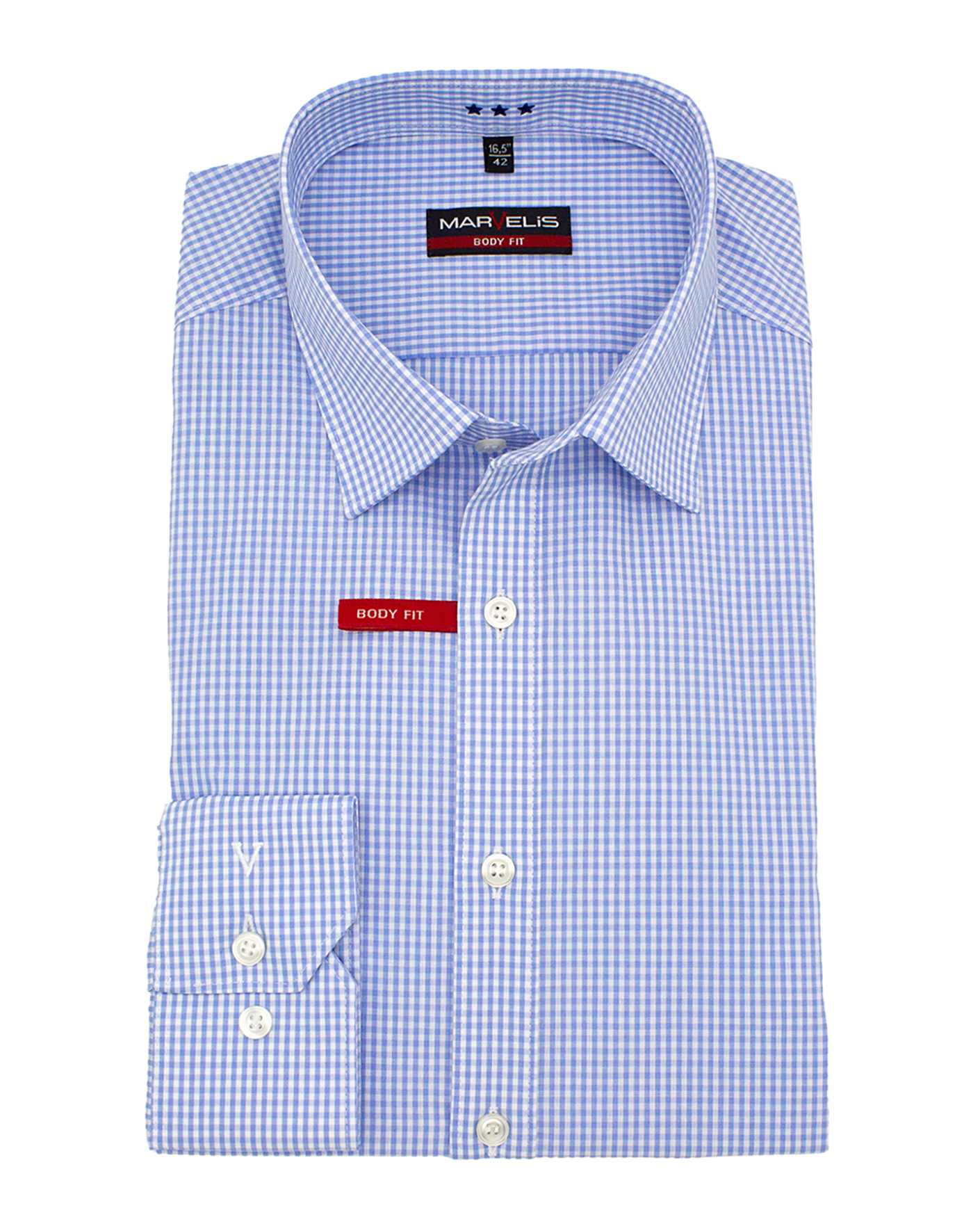 Рубашка Marvelis Body Fit голубого цвета в мелкую клетку. Модель с воротником Кент с планкой на пуговицы и регулируемыми манжетами. Сшитая по фигуре деловая рубашка из 100% хлопка - для максимального комфорта.