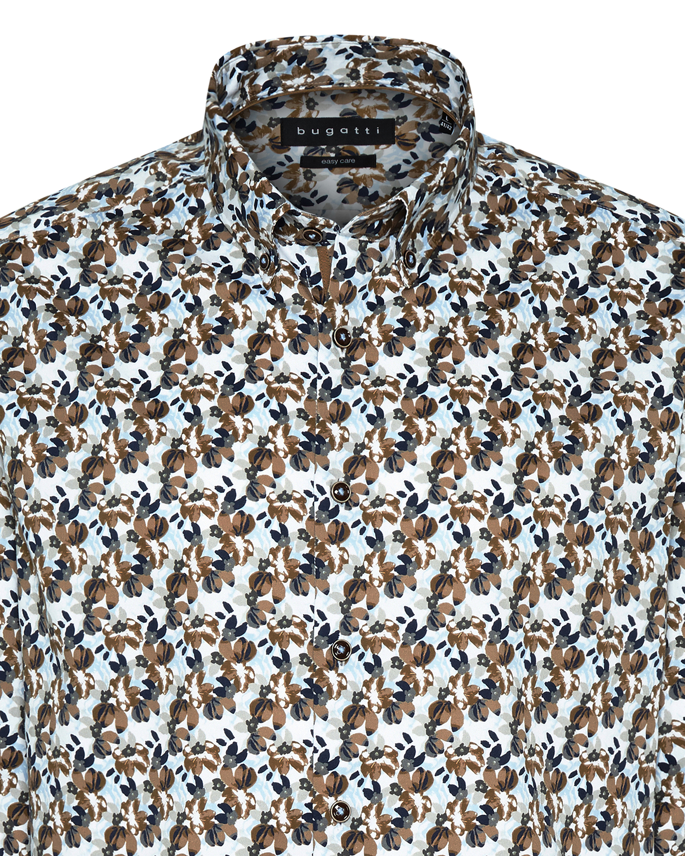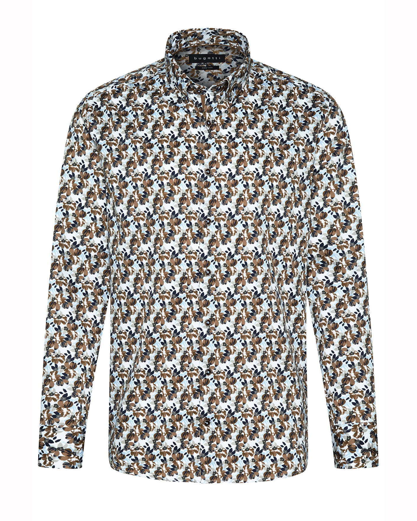Рубашка Bugatti голубо-бежевого цвета в мелкий цветочный принт. Модель из 100% хлопка, воротник Button-Down, застежка на пуговицы. Яркая рубашка идеально впишется в ваш повседенвный гардероб.