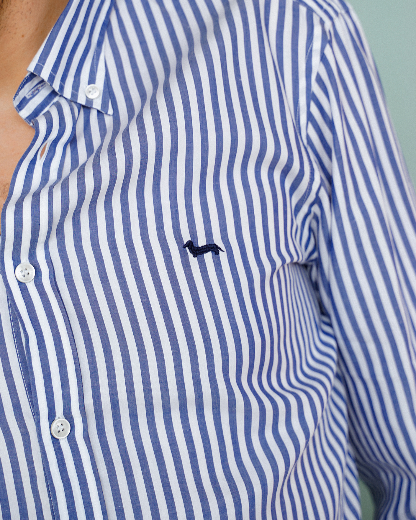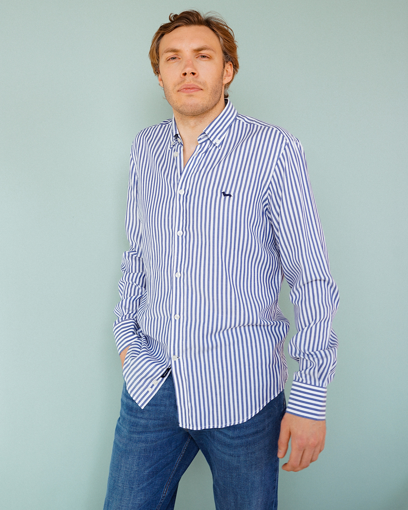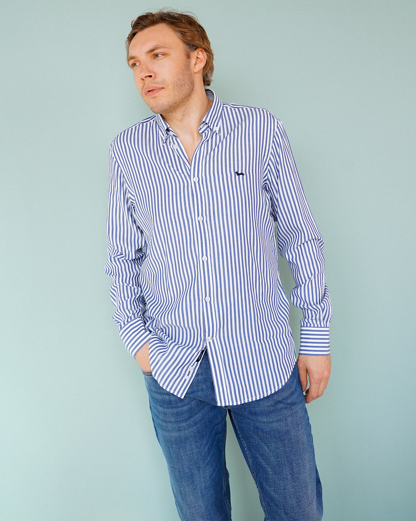 Рубашка Harmont&Blaine бело-синего цвета в вертикальную полосу и аккуратную вышивку логотипа на груди. Модель с воротником Button-Down, застежка на пуговицы в тон. Рубашку можно сочетать с любым гардеробом.