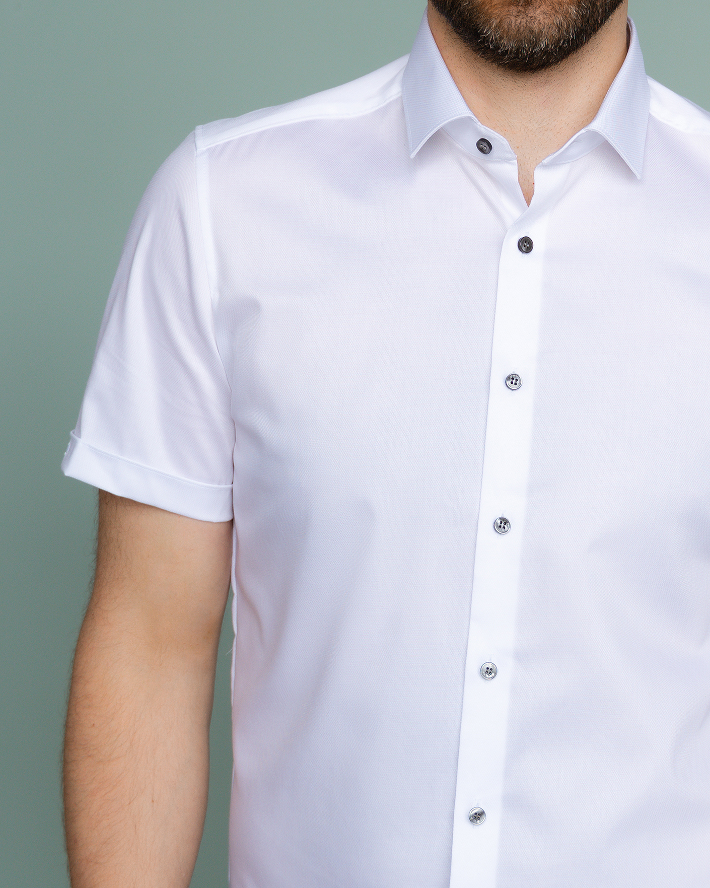 Рубашка Olymp Level Five Body Fit белого цвета в мелкий рисунок. Хлопковая модель с короткими рукавами, воротник Modern Kent, застежка на контрастные пуговицы. Рубашка станет незаменимой вещью летнего гардероба.
