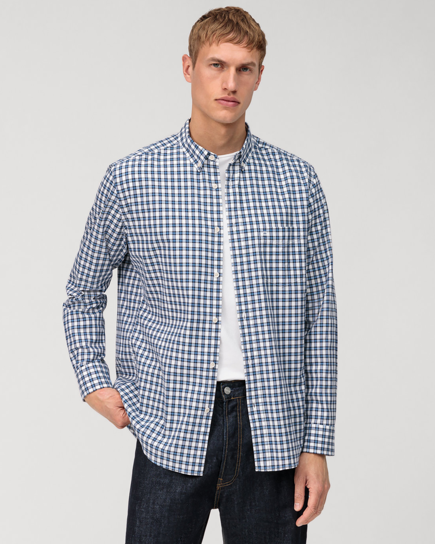 Повседневная рубашка Olymp Casual бело-синего цвета в мелкую клетку. Модель из 100% хлопка, воротник Button-Down, имеется накладной нагрудный карман. Рубашка - иделальный спутник на каждый день.