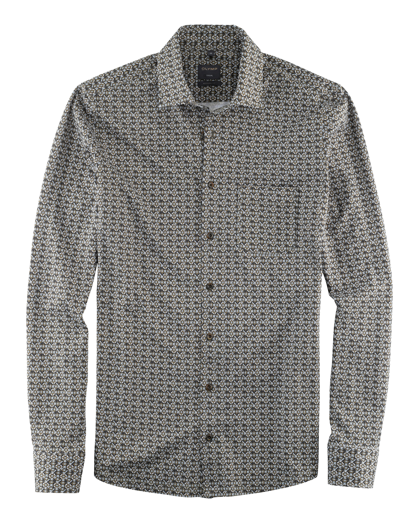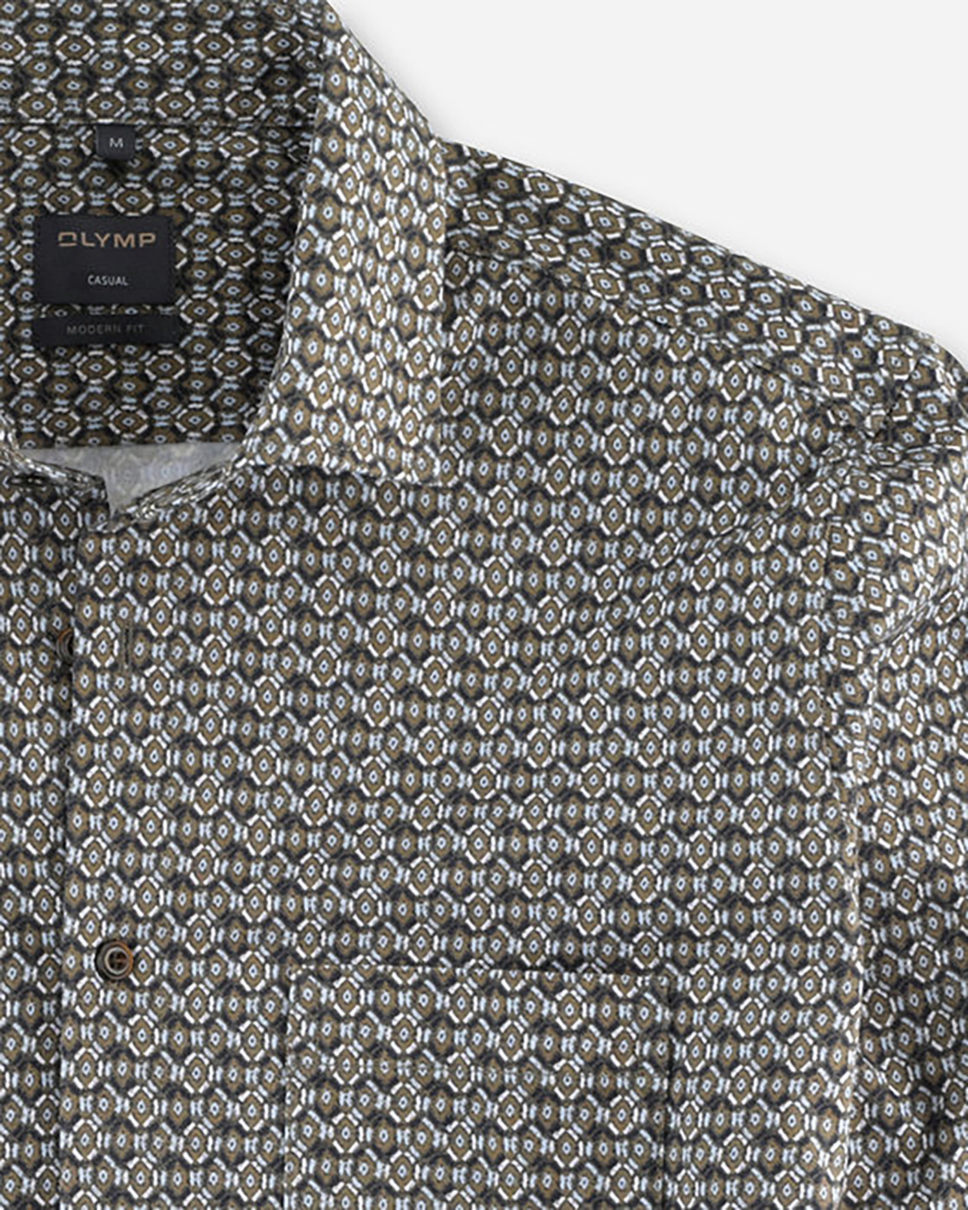 Рубашка Olymp Casual Modern Fit оливкового цвета в абстрактный рисунок. Повседневная модель из 100% хлопка с воротником Kent. Максимальный стиль и комфорт с данной рубашкой.
